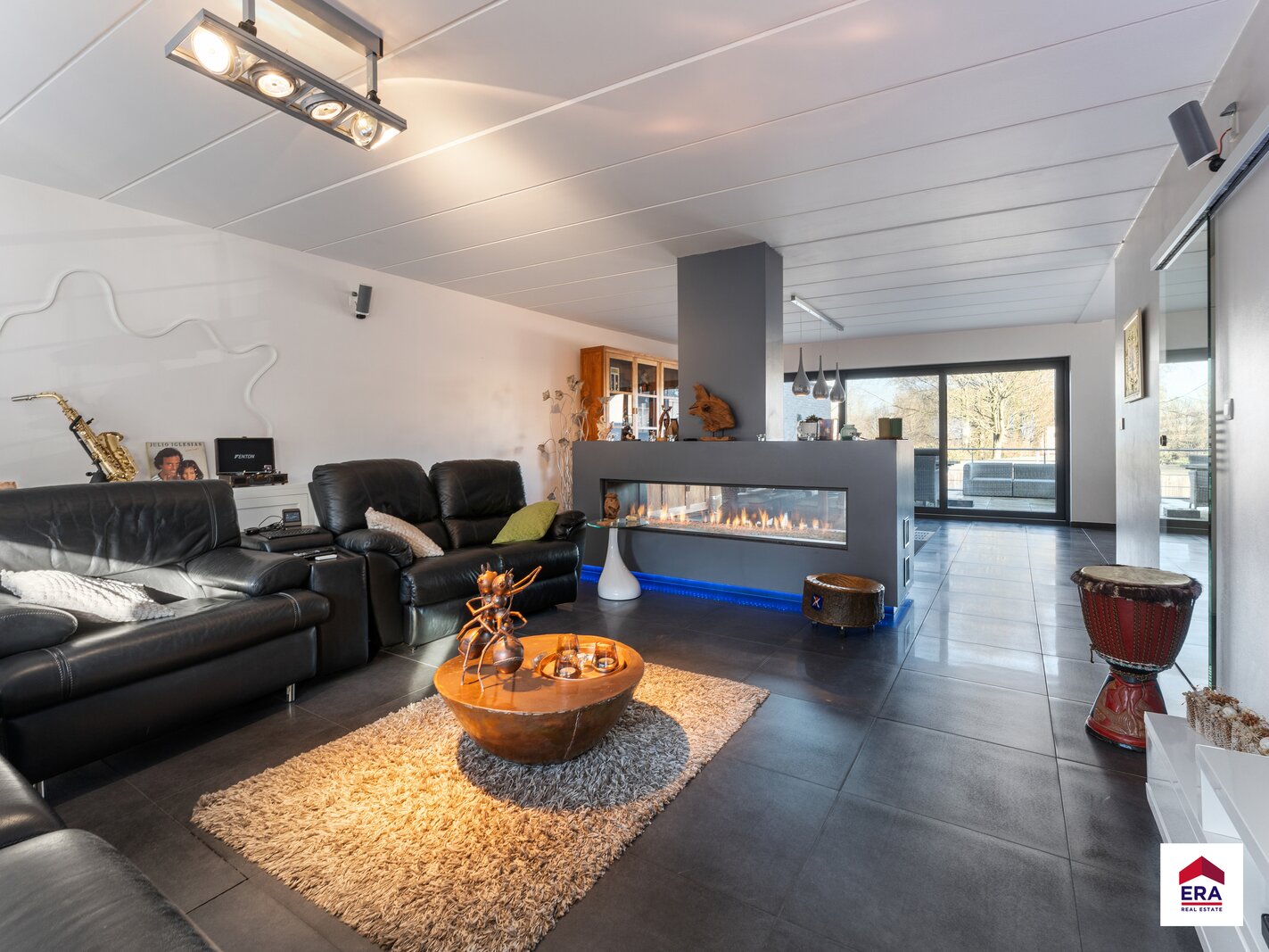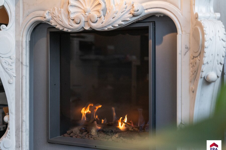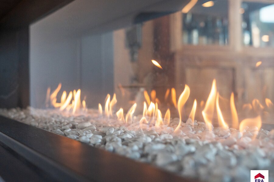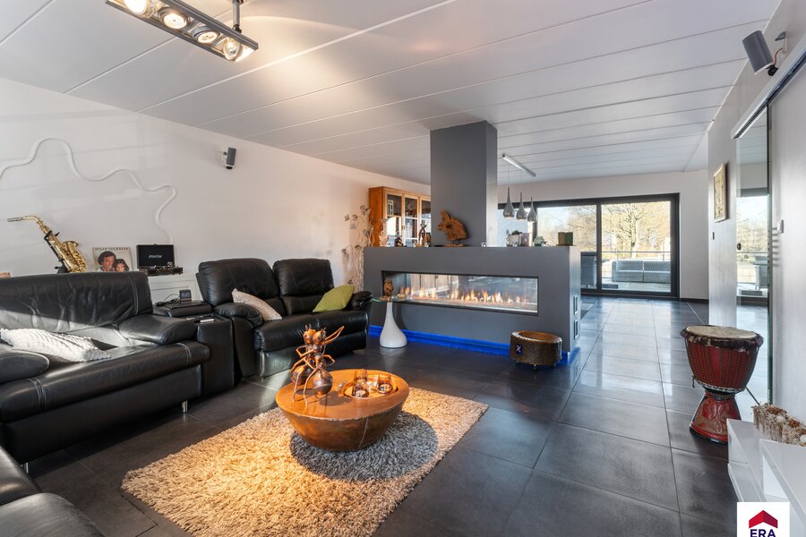 1e verdiep: woonkamer (63m²) met prachtige doorkijkhaard, open en volledig ingerichte keuken met bureel (14m²), koele berging, apart toilet, wasplaats, prachtig terras van 45m² met uniek uitzicht.