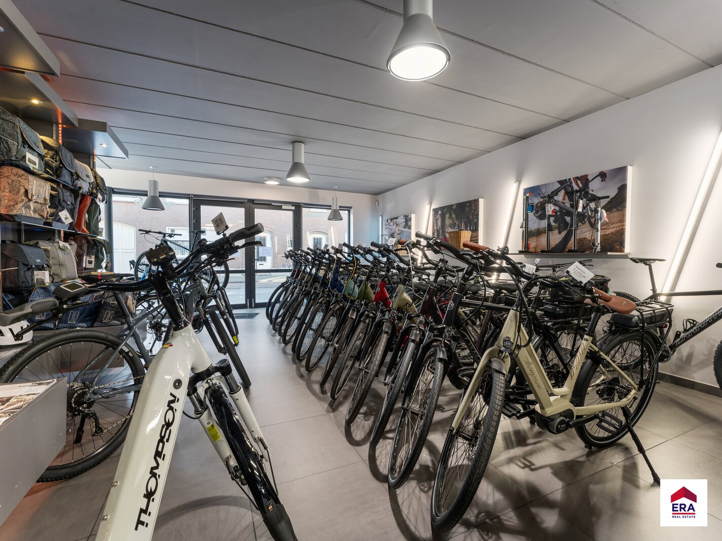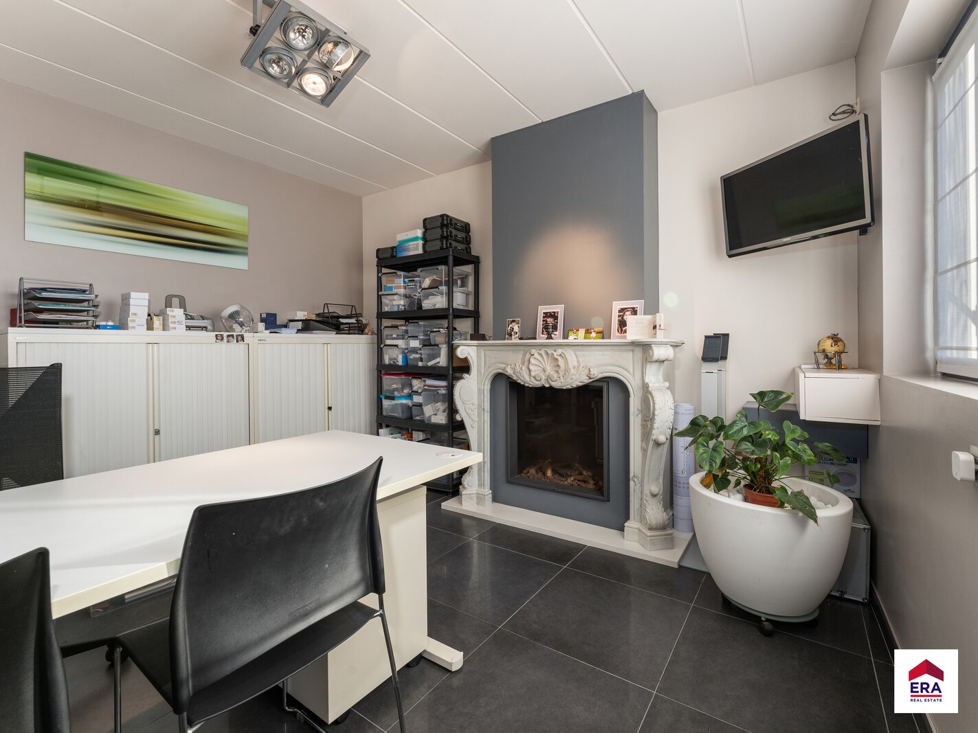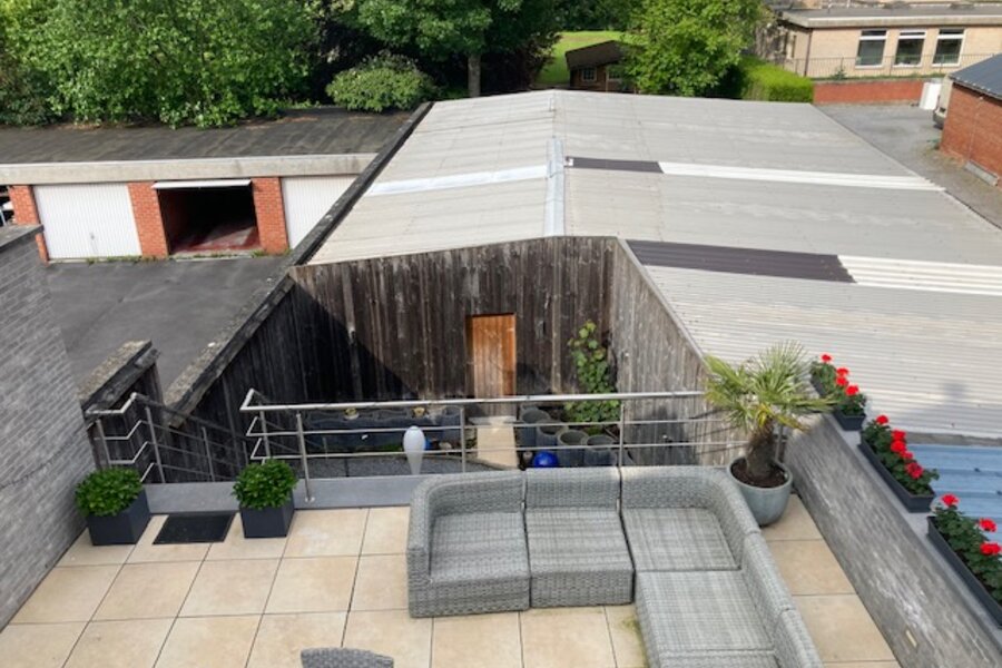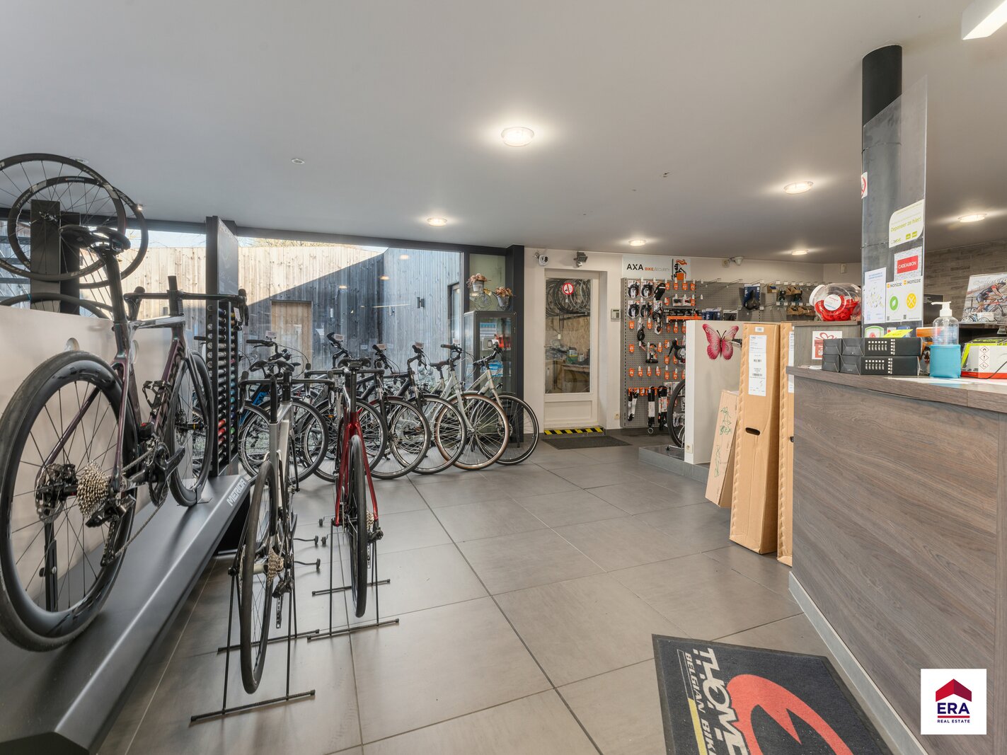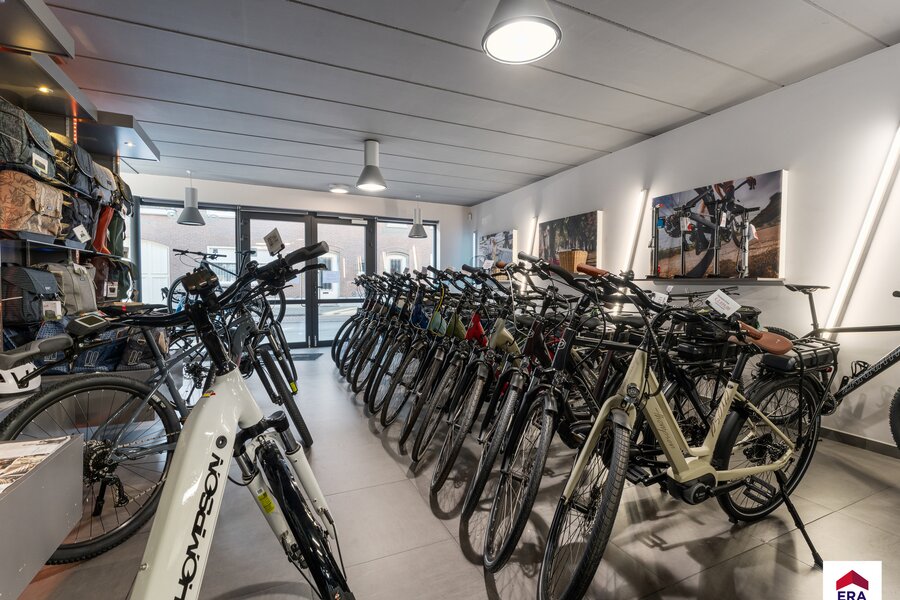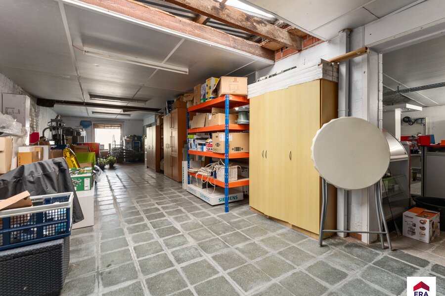 Commerciële/ polyvalente ruimte van +/- 150m² met berging en apart toilet. Achterliggend magazijn van 198m².