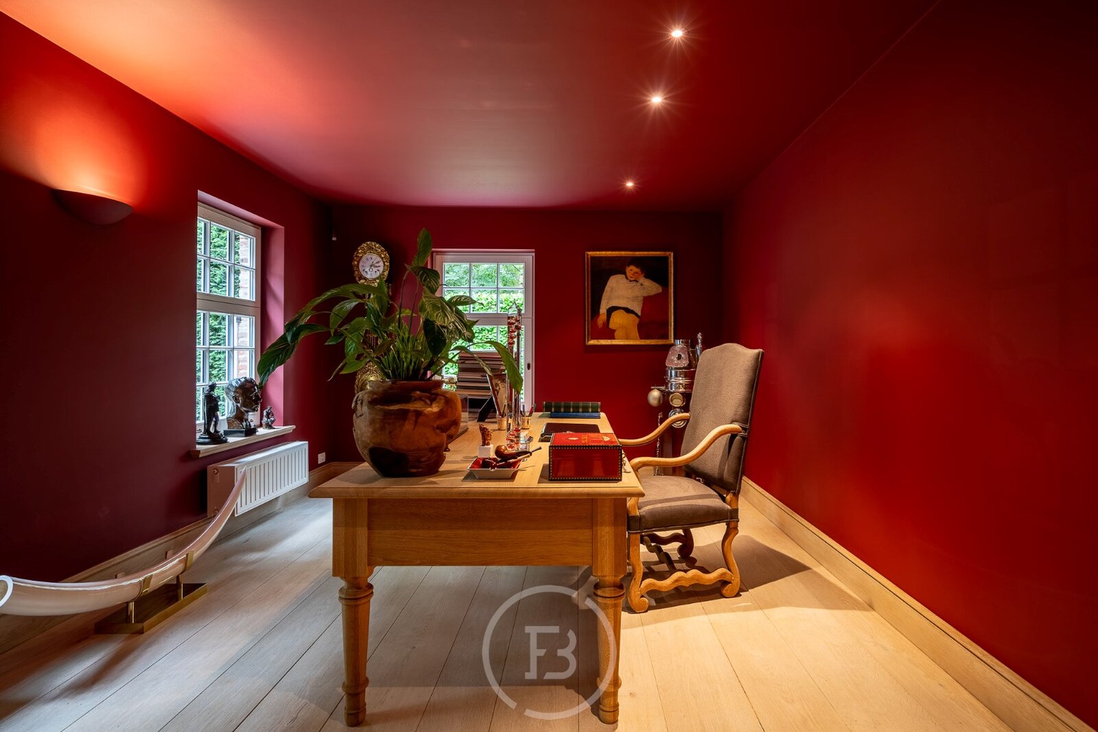 Je komt de villa binnen via de inkomhal met trap, vestiaire en gastentoilet. De hal geeft toegang naar de gezellige living met open haard. Naast de living bevindt zich een gezellige bibliotheek/tv-hoek. De eetruimte leidt tot een grote leefkeuken die voorzien is van alle toestellen. Al deze ruimtes staan mooi in contact met de tuin. Aaneensluitend met de keuken vind je een bijkeuken met wasplaats/berging en een ruime koelcel. Ruime wijnkelder op -1. Inpandige garage voor 2 wagens. Op het gelijkvloers voorts nog een gezellige en lichtrijke bureauruimte.