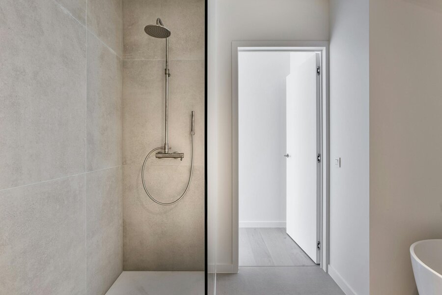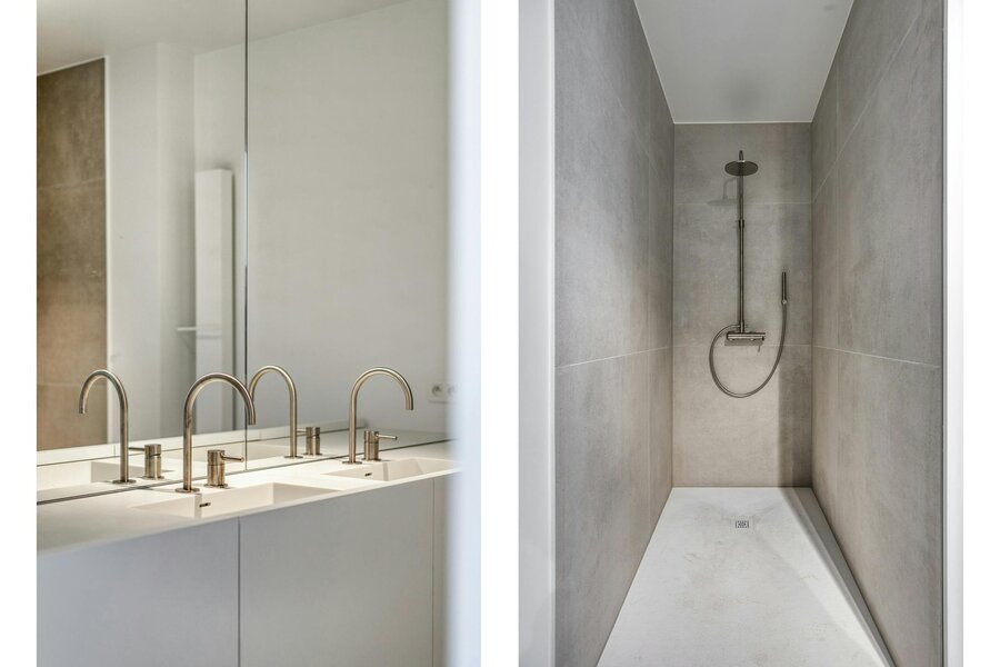 - badkamer 2, voorzien van wastafel met dubbele lavabo, ingemaakte kasten en inloopdouche