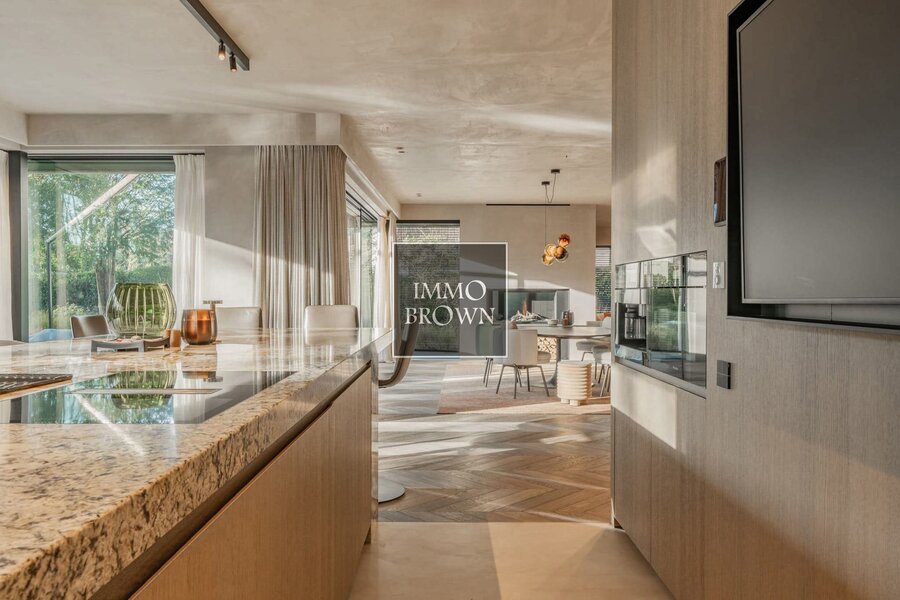 De statige inkomhal met gastentoilet en vestiaire leidt naar een lichtrijke en royale leefruimte met een gezellige zithoek en een stijlvolle gashaard, aansluitend op de eetruimte. De open leefkeuken, voorzien van een groot kookeiland en koffiehoek, is uitgerust met toptoestellen van Miele, waaronder een ingebouwde wijnfrigo. Een praktische bijkeuken met ingemaakte kasten en aansluitingen voor wasmachine en droogkast biedt extra opbergruimte.