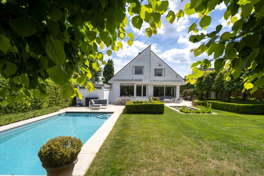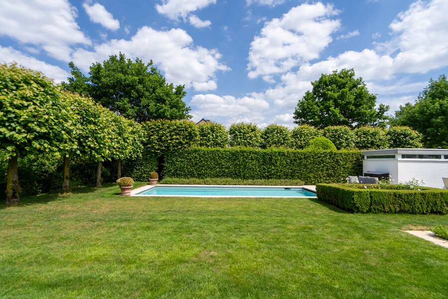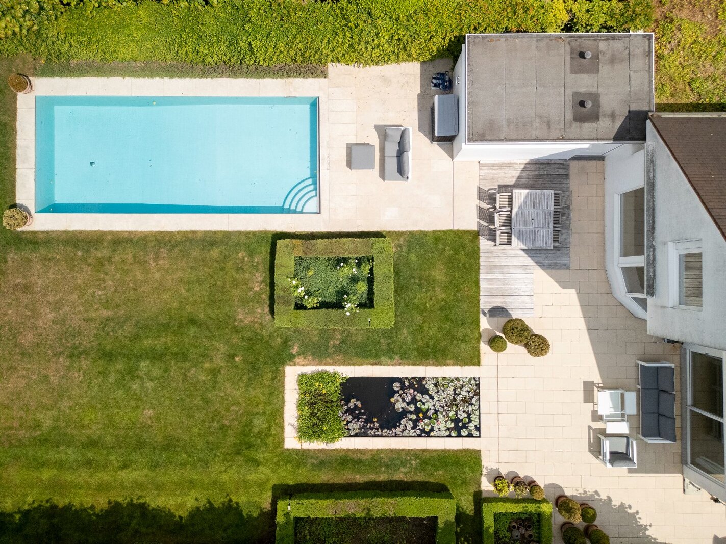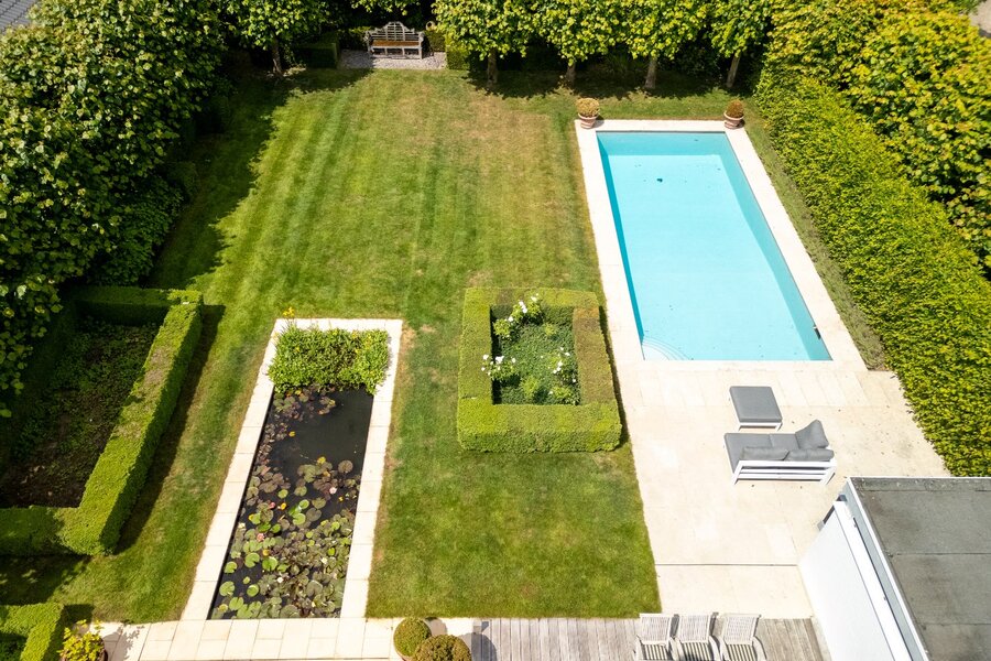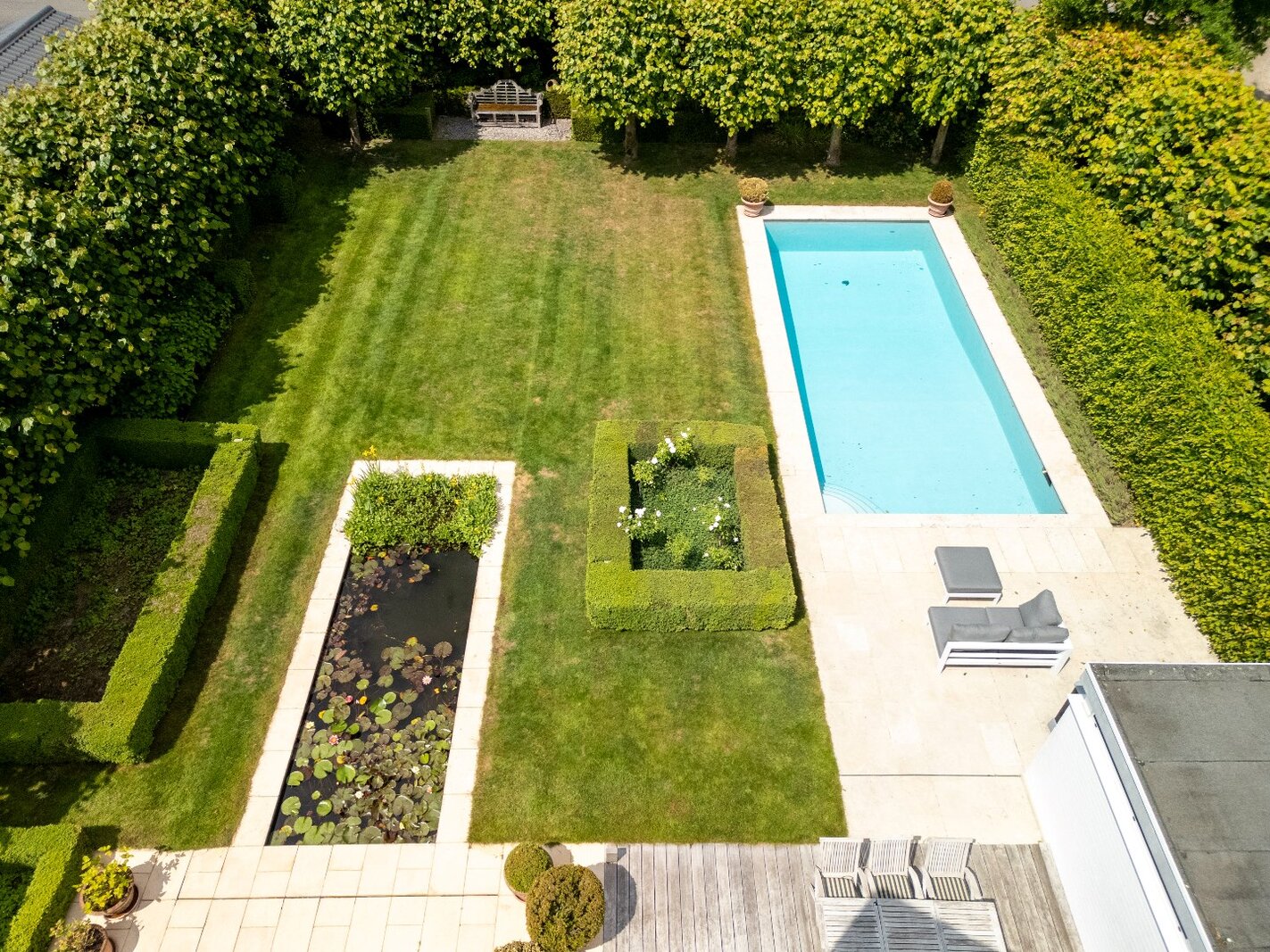 Het verwarmde zwembad met warmtepomp en automatisch rolluik wordt omringd door een stijlvol poolhouse met een douche en ruimte voor zitkussens en badbenodigdheden. Aan de zijkant bevindt zich een extra tuin met fietsen- en tuinberging. Achteraan is er een tuinpoortje voor het plaatsen van de groenbak aan de straatkant.