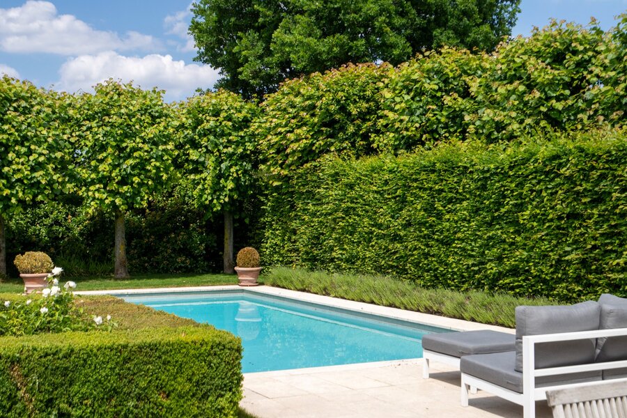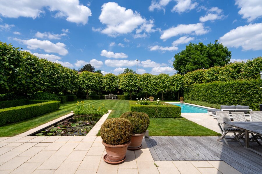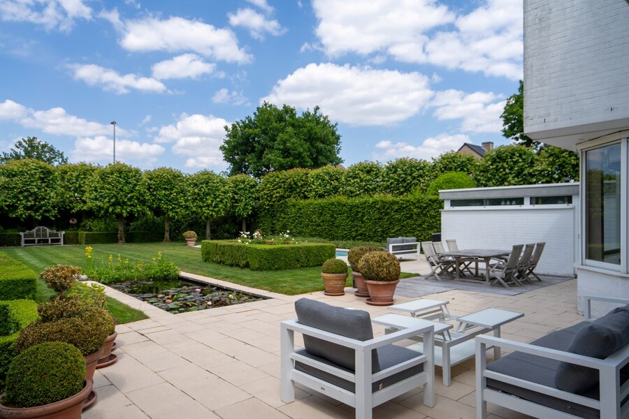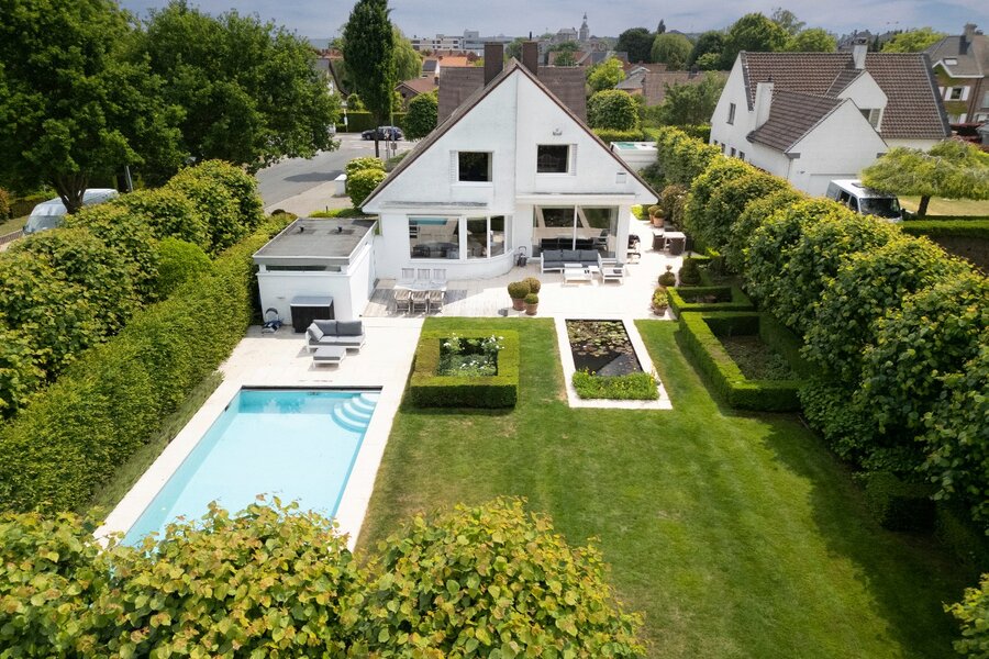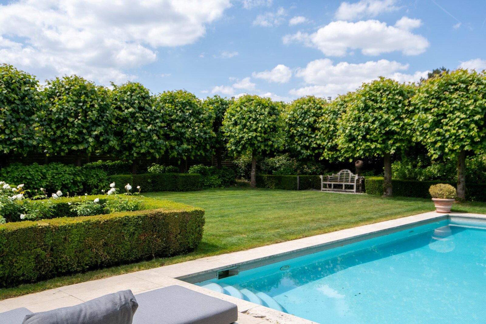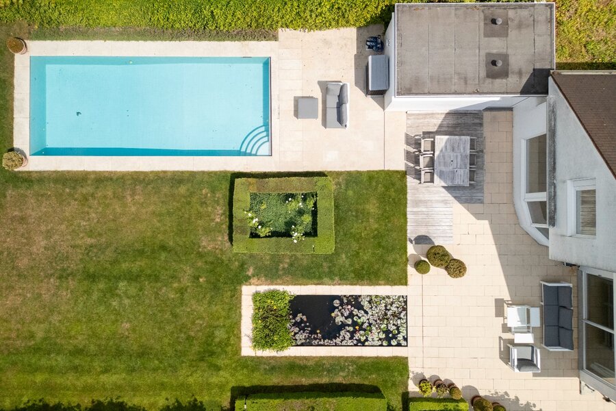 Het verwarmde zwembad met warmtepomp en automatisch rolluik wordt omringd door een stijlvol poolhouse met een douche en ruimte voor zitkussens en badbenodigdheden. Aan de zijkant bevindt zich een extra tuin met fietsen- en tuinberging. Achteraan is er een tuinpoortje voor het plaatsen van de groenbak aan de straatkant.
