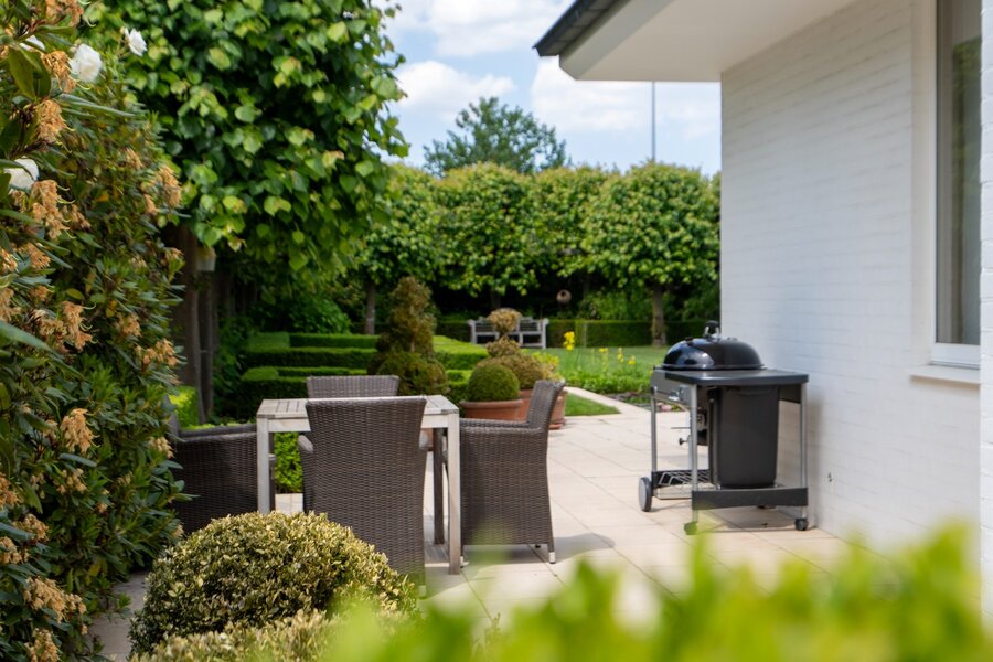 Deze villa beschikt over een ruime, zonnige tuin met volgroeide bomen, struiken en planten, wat absolute privacy garandeert. De tuin is uitgerust met verlichting en een sproeisysteem.