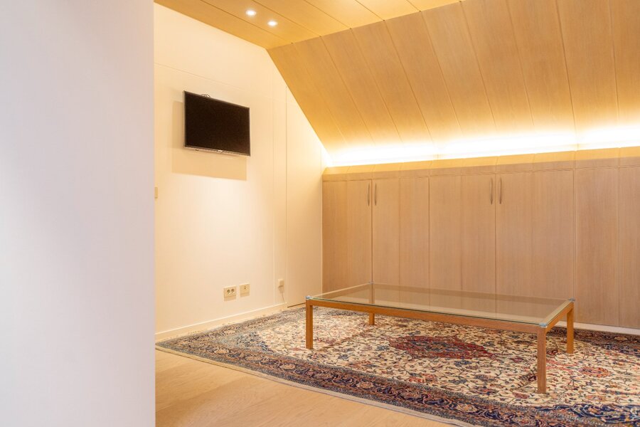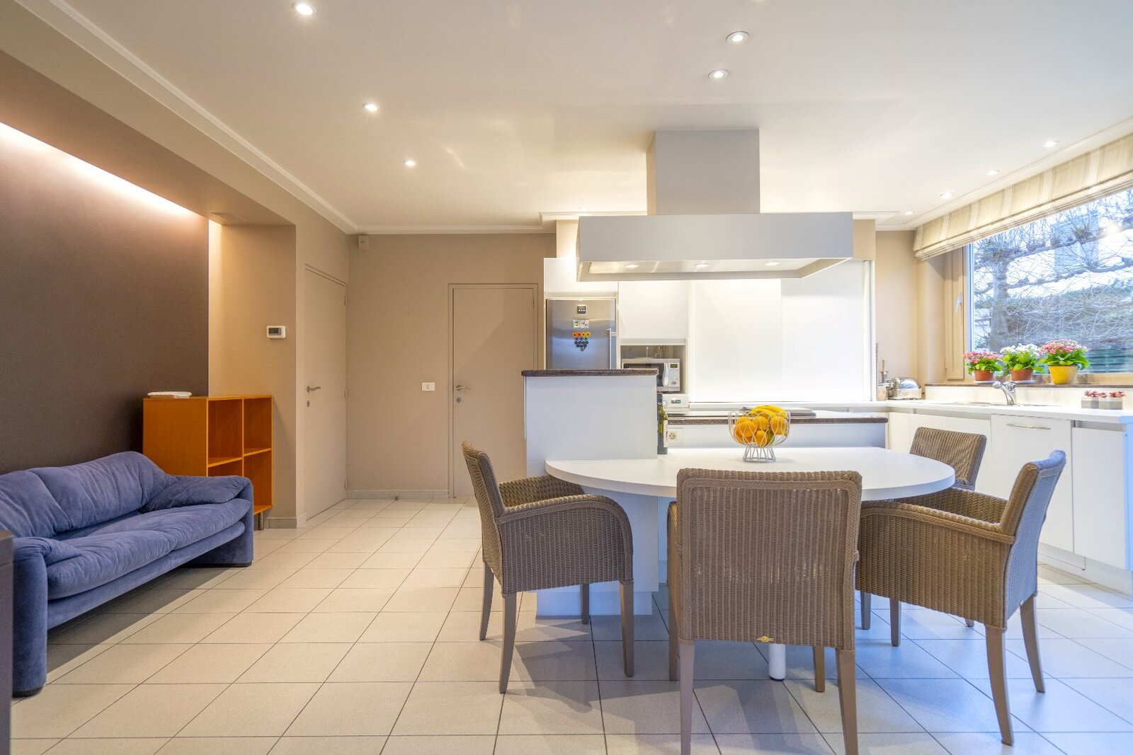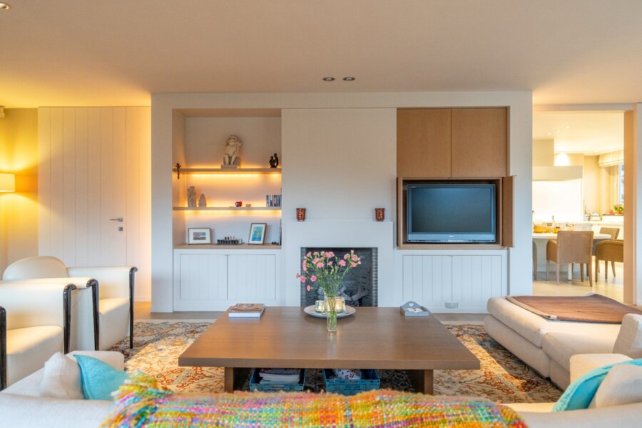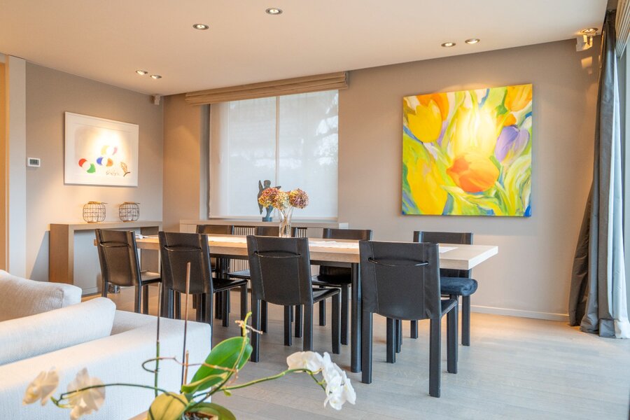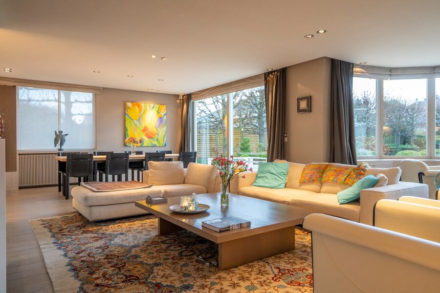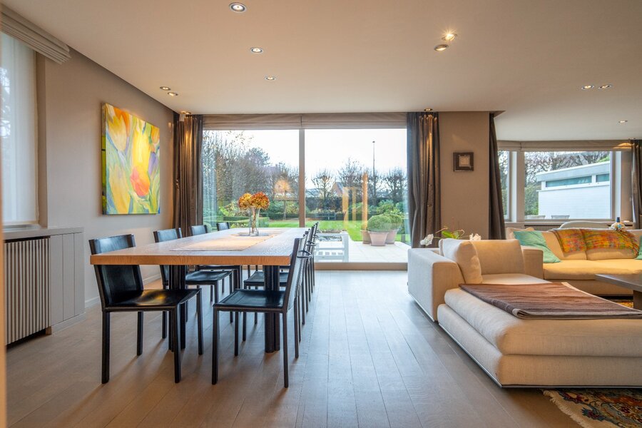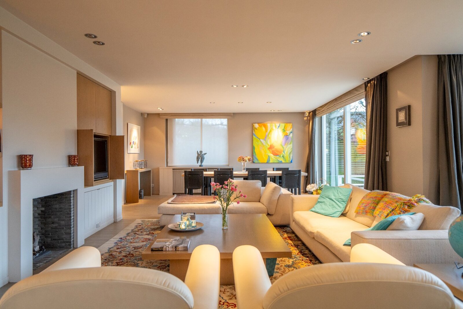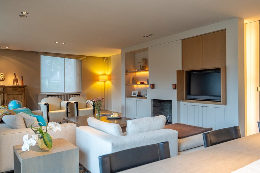 De leefruimte is voorzien van een sfeervolle gashaard en grote raampartijen, die zorgen voor veel lichtinval en een prachtig uitzicht op de tuin. In de zomer garanderen twee elektrische zonneluifels en zonnescreens steeds voor een aangenaam binnenklimaat.