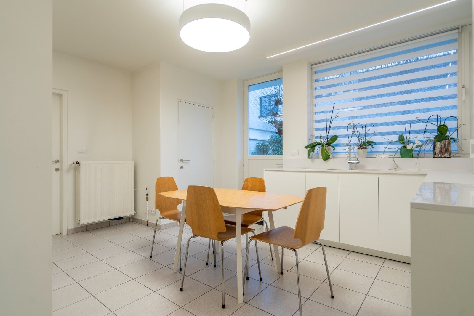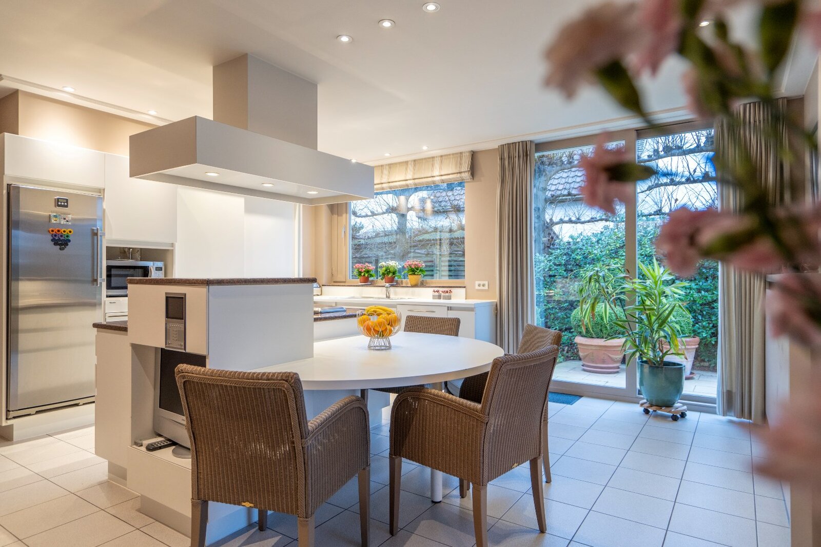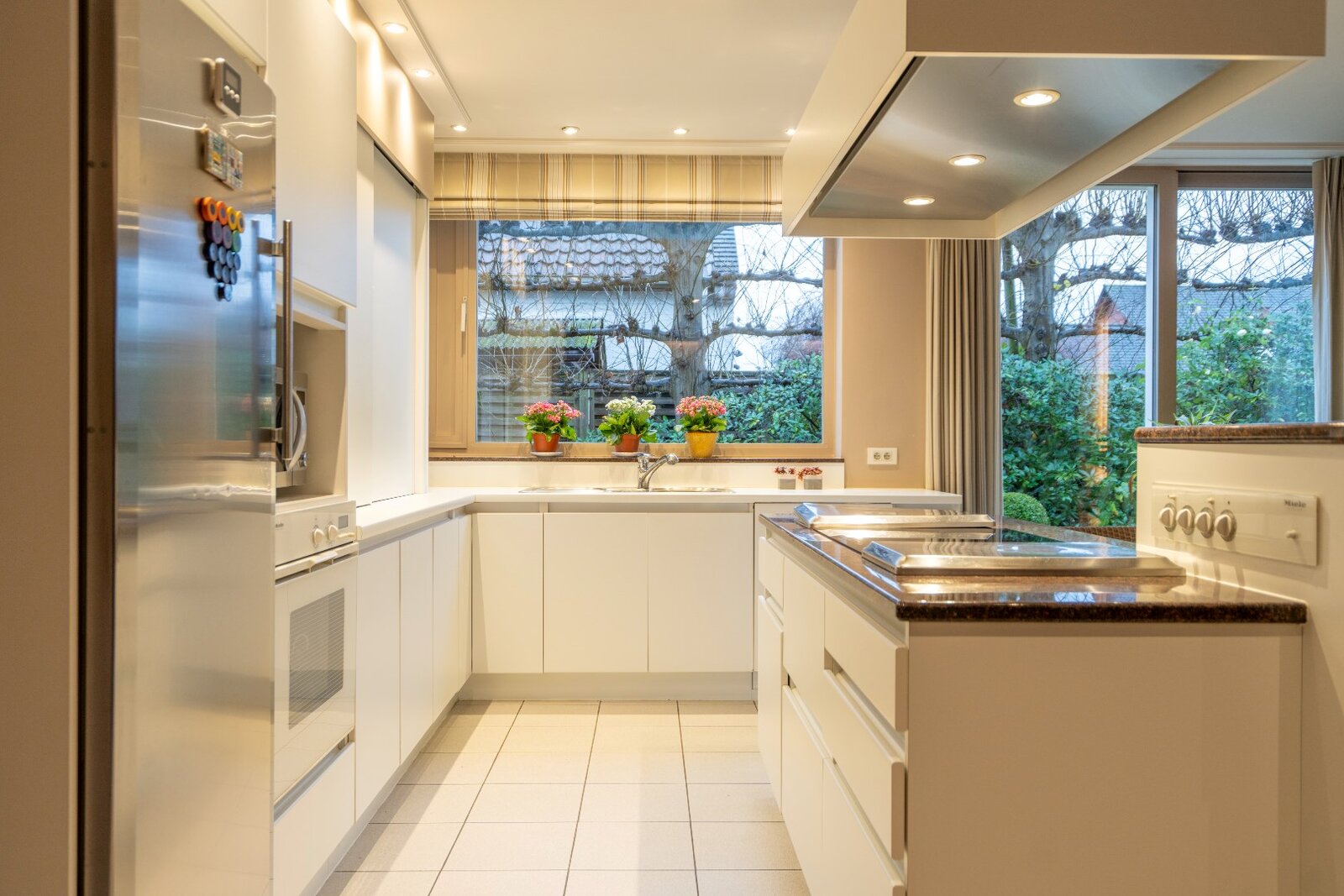De ruime keuken met een gezellige zithoek biedt uitzicht op de zijdelingse tuin en toegang tot de tuin via een schuifraam (voorzien van een zonnescreen). Vanuit de keuken is er een doorgang naar de kelder, de bovenverdieping en de uiterst verzorgde bijkeuken.