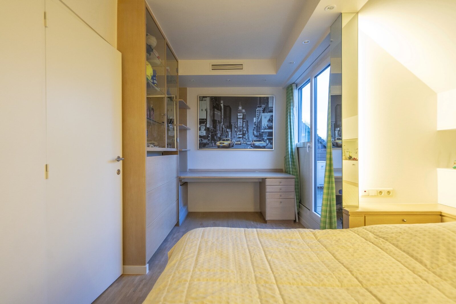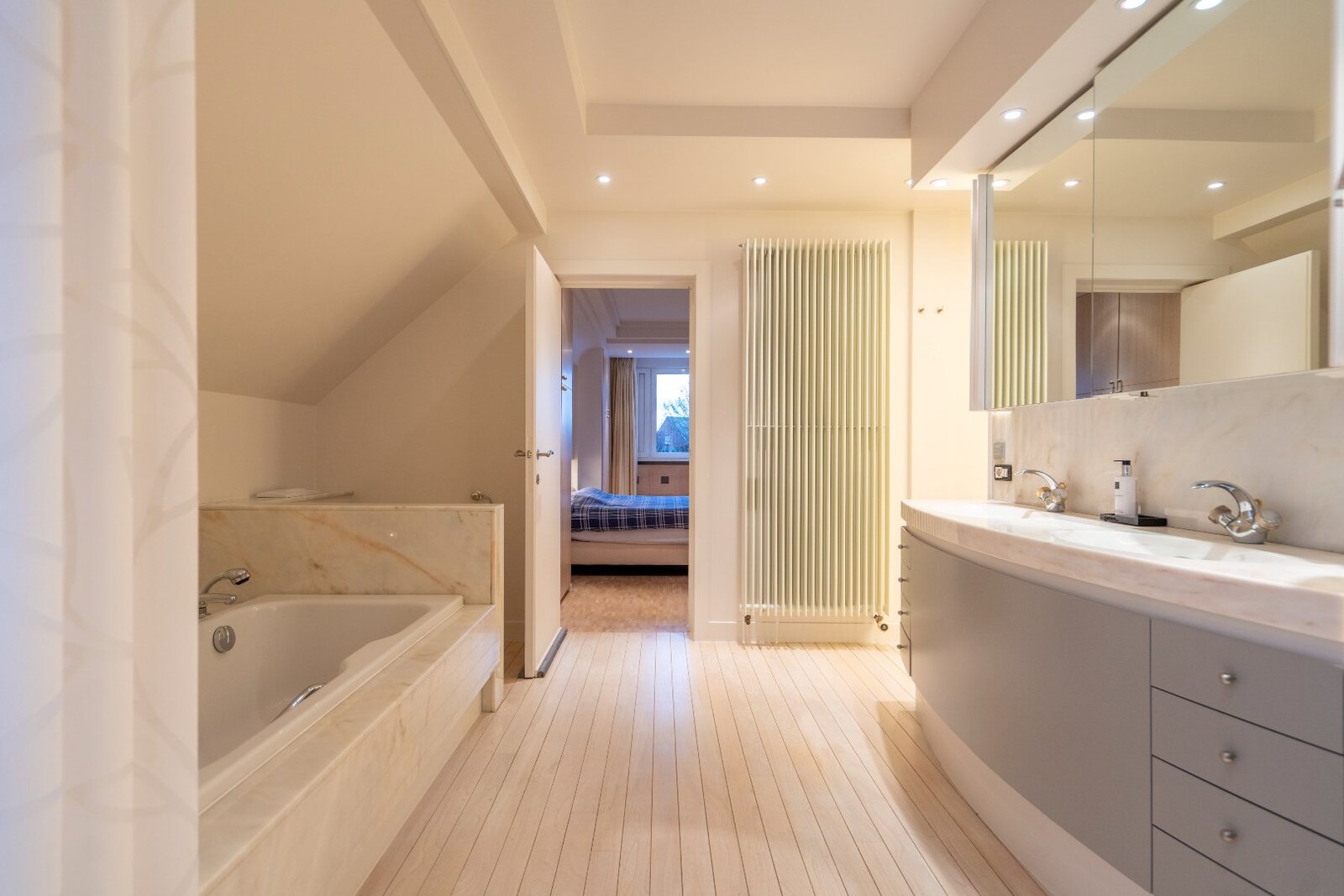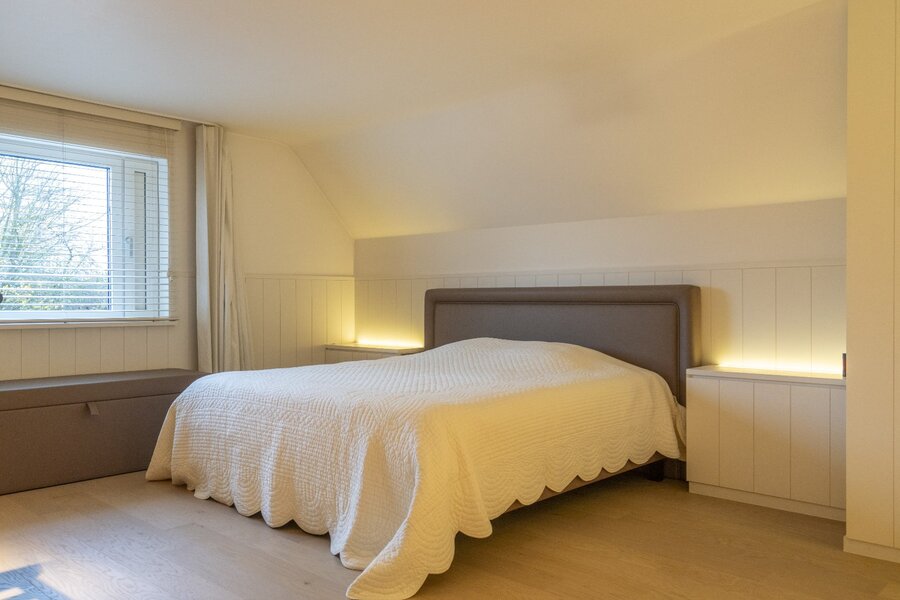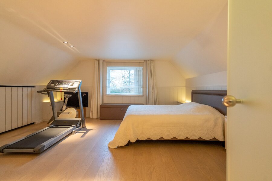 De bovenverdieping biedt een overvloed aan comfort en een praktische indeling. De master bedroom, gelegen aan de tuinkant, uitgerust met airconditioning, een royale badkamer, een dressing en een bureauruimte.