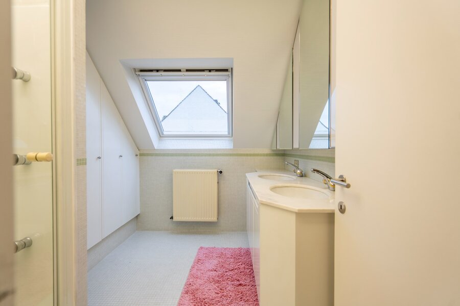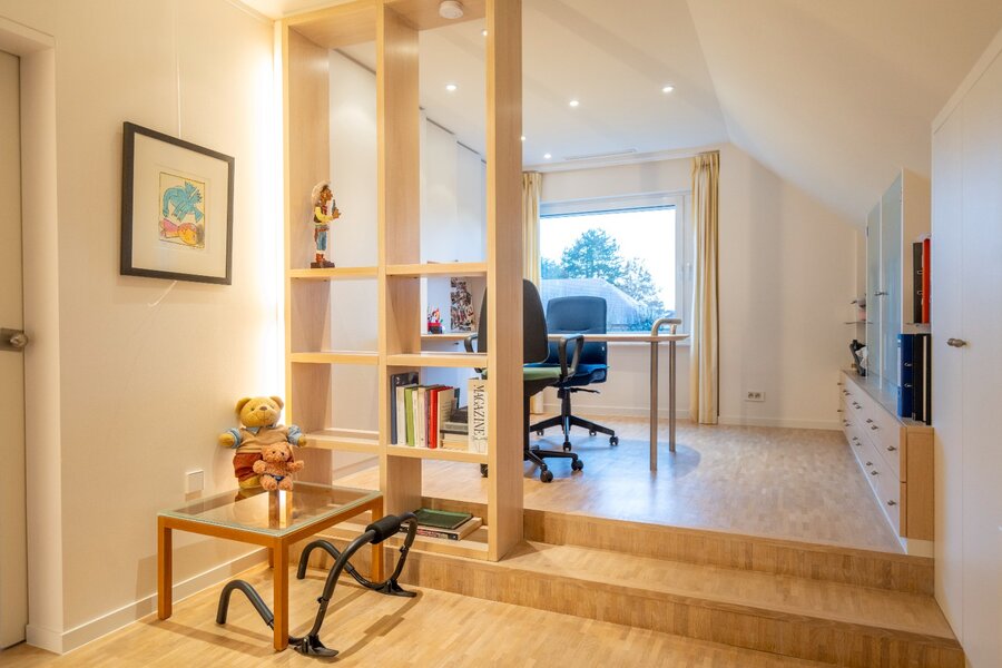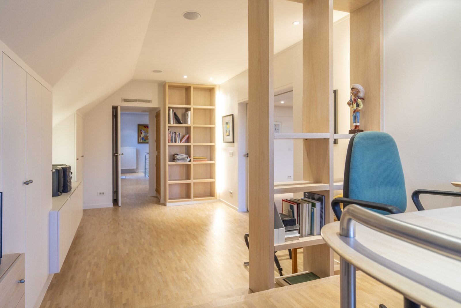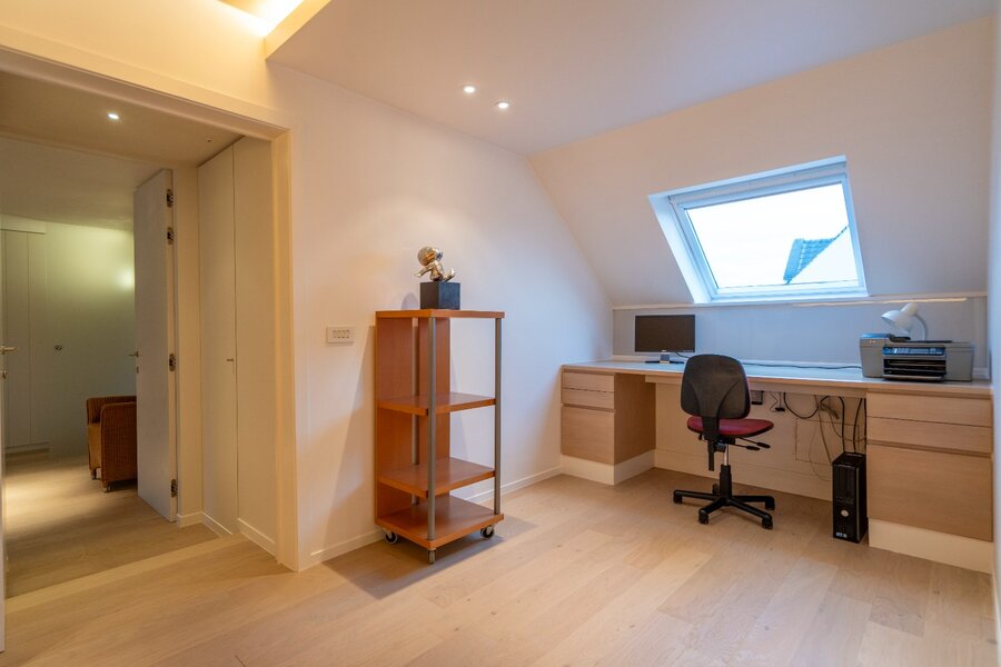 Vervolgens zijn er in het midden van de bovenverdieping twee kinderslaapkamers die gebruik maken van een te delen tweede badkamer. Er is ook een polyvalente ruimte, dit kan perfect een hobbykamer/speelkamer worden voor de kinderen, op heden wordt deze gebruikt als bureau.