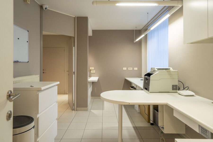 Het praktijkgedeelte heeft een aparte inkom en biedt de volgende faciliteiten: Een centrale ruimte met wachtzaal, toilet, bureel en voormalige behandelruimtes. Een bijkeuken en een voorraadruimte.