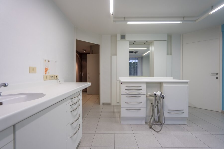 Het volledige praktijkgedeelte is onderkelderd, wat extra opslagruimte bied.