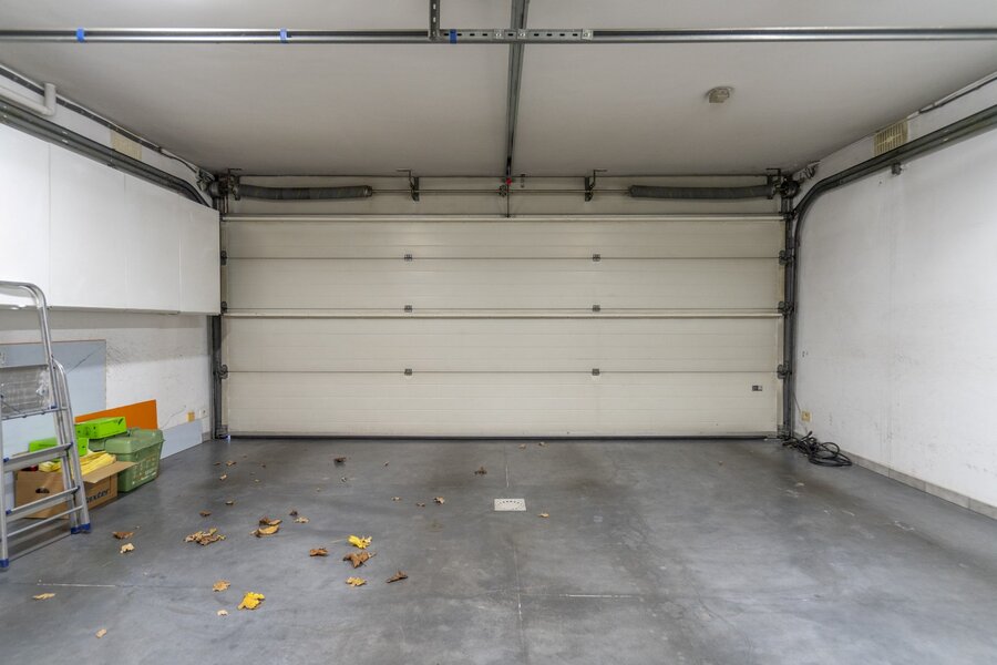 De inpandige garage biedt plaats aan twee wagens en is voorzien van een automatische poort.