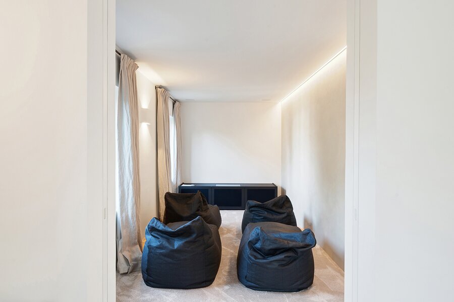 Eerste verdieping: Master bedroom met terras, ruime dressing, badkamer met bad en grote inloopdouche en nog een volledig aparte douchekamer. Multifunctionele ruimte (waar 2 extra kamers gecreëerd kunnen worden) welke momenteel als bureau dienst doet, cinema room.