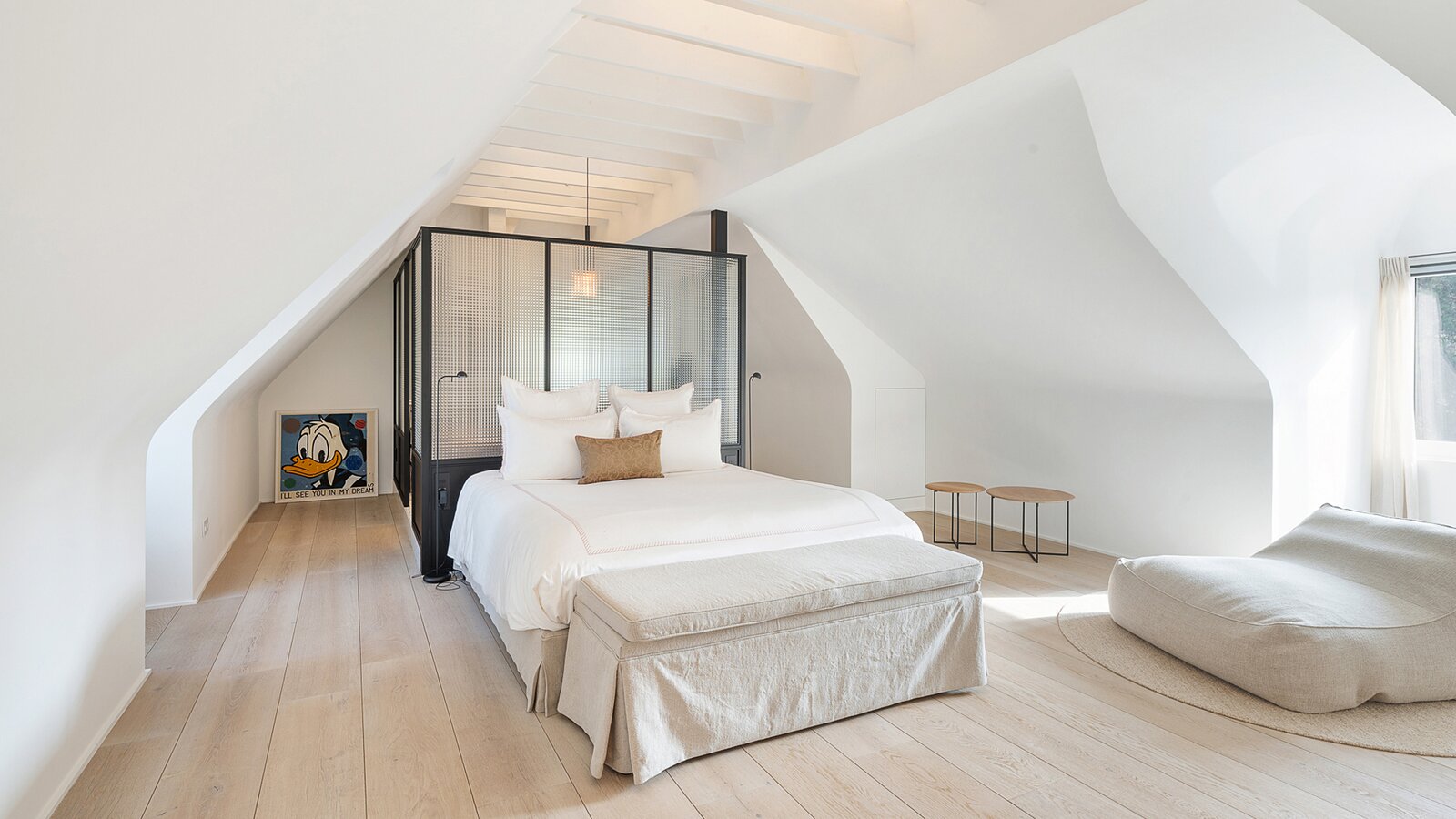 Op de tweede verdieping: grote slaapkamer met douchekamer, ingemaakte kasten en een aparte slaaphoek.