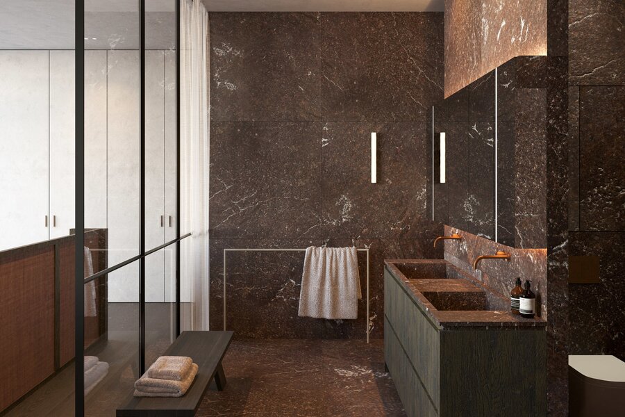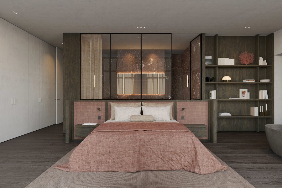 De inkomhal geeft toegang tot een gastentoilet en leidt naar de master bedroom met en-suite badkamer en dressing. De tweede slaapkamer heeft een eigen badkamer, wat een gevoel van privacy en comfort creëert. De leefkeuken staat in directe verbinding met de eet- en leefruimte en is ontworpen met oog voor functionaliteit en eenvoud, zonder in te boeten op stijl.