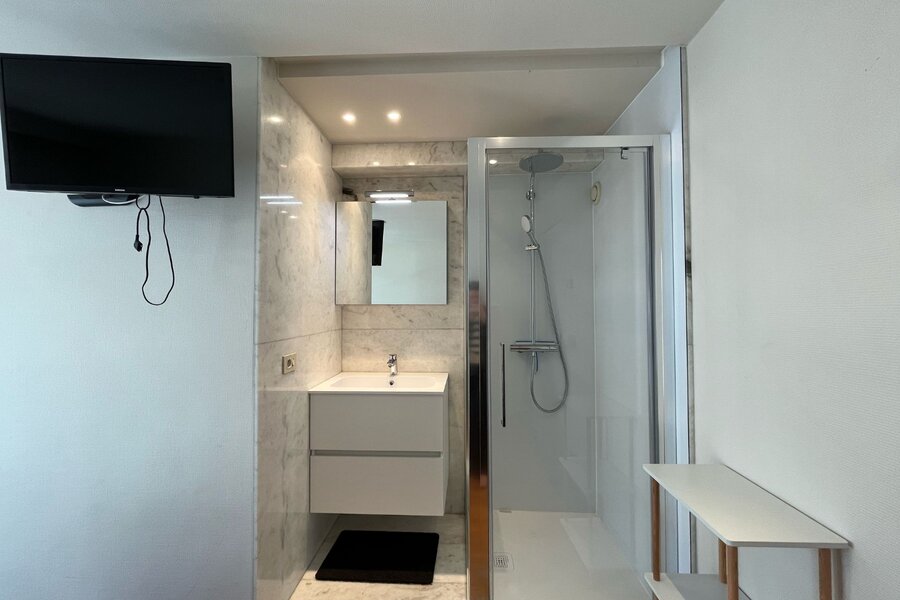 Inkomhal met gastentoilet. Aangename lichtrijke leefruimte met aansluitend een volledig ingerichte open keuken. Ruime slaapkamer met ensuite badkamer, tweede slaapkamer met douchekamer. Berging met aansluiting voor een wasmachine en droogkast.