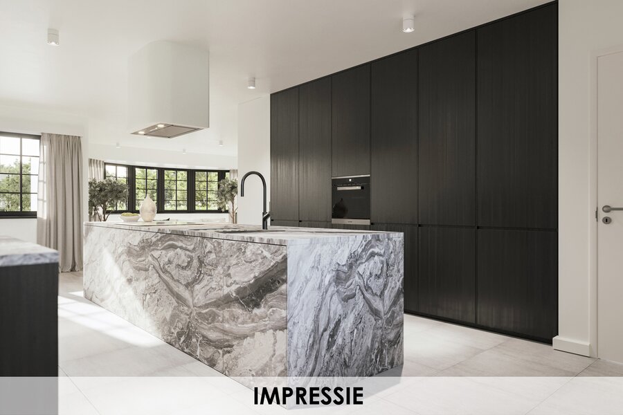 - Een ruime keuken (30m²) met gootsteen, kookeiland met o.a. Smeg inductiekookvuur, dubbele Miele vaatwasser, dubbele Siemens ovens, ingebouwde ijskast,...
