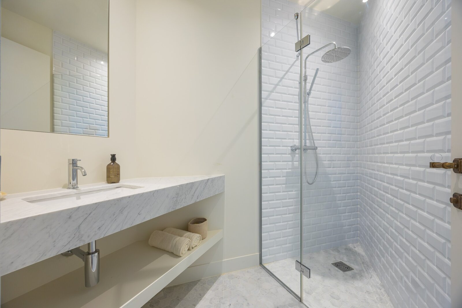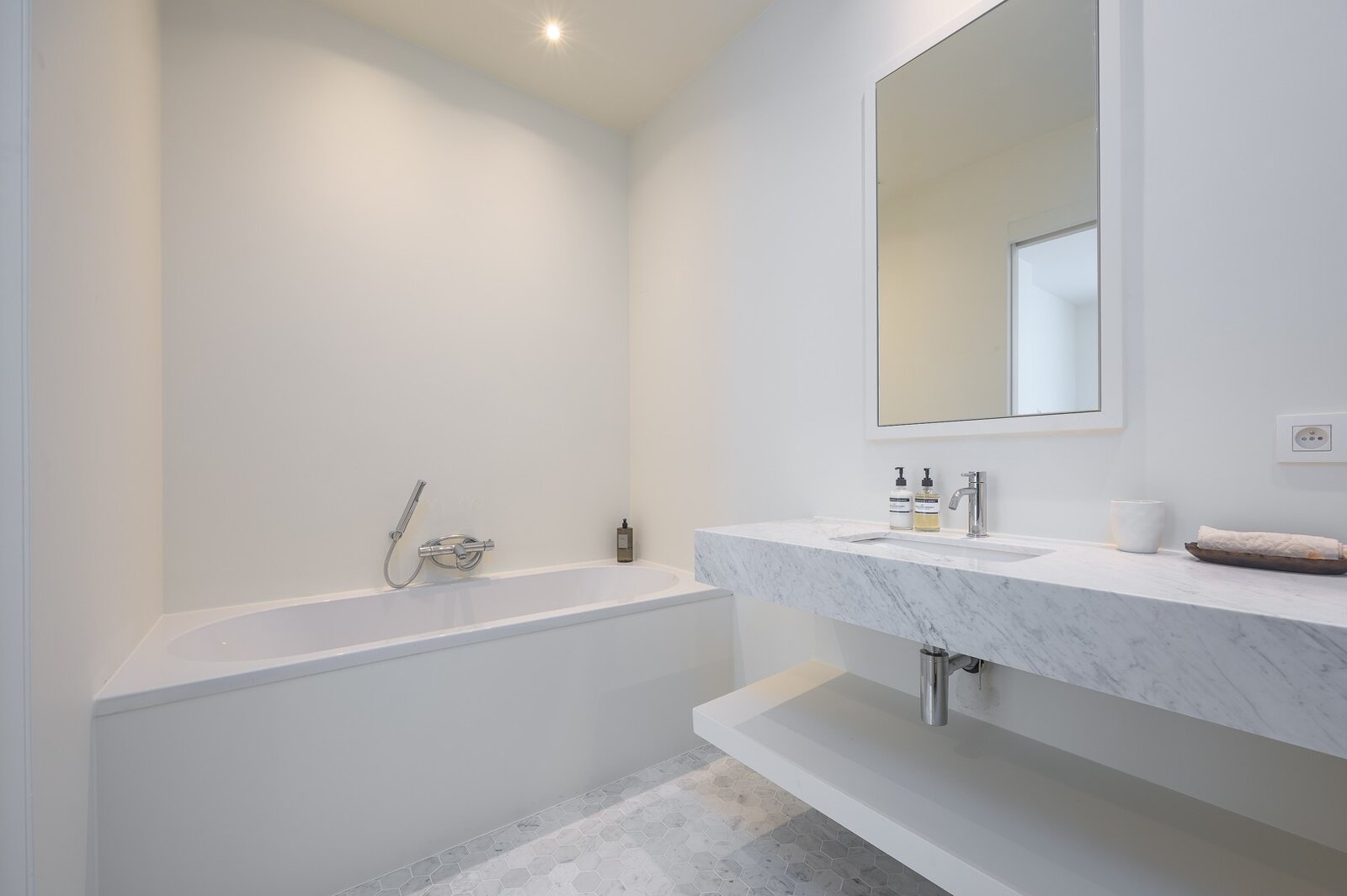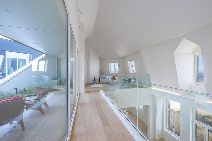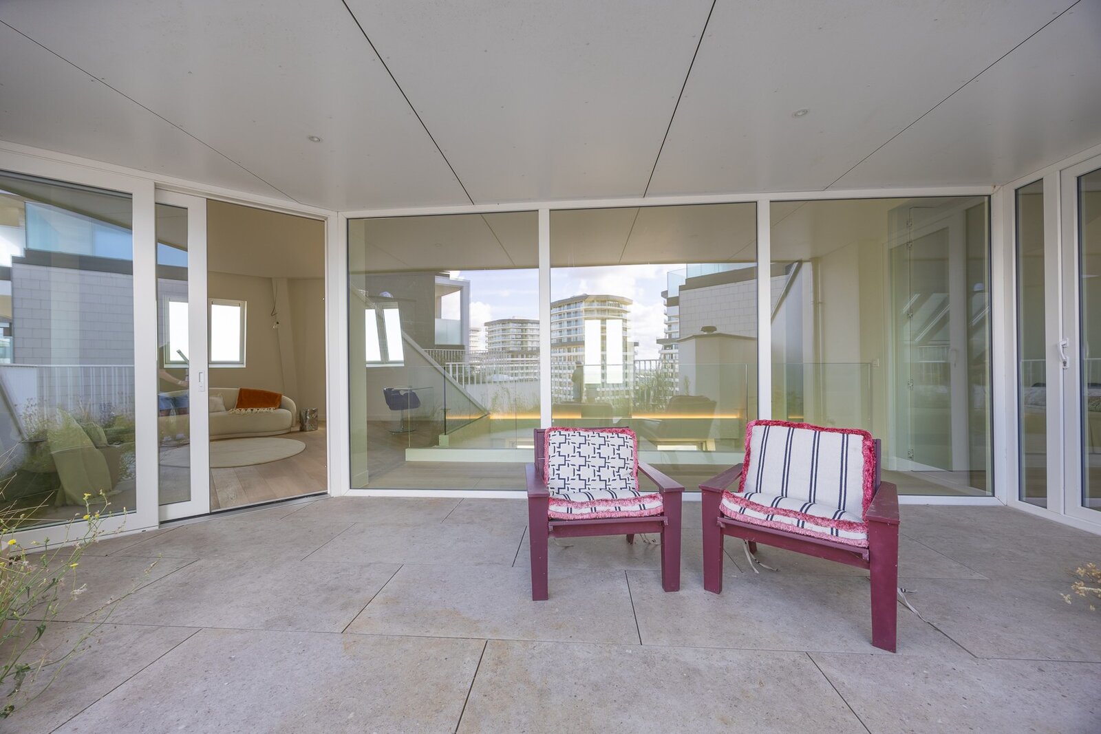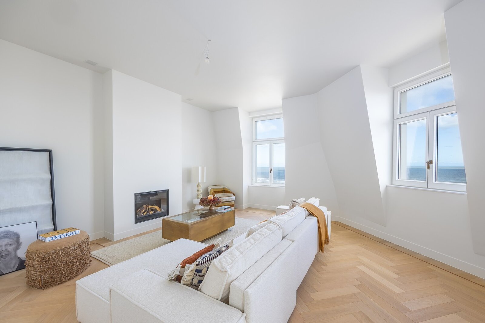 De derde verdieping biedt een indrukwekkende woonkamer met gashaard, eetplaats en luxueuze keuken, aangevuld met drie ruime slaapkamers, elk met een eigen badkamer. De gevelbreedte van 14 meter en het frontale zeezicht zorgen hier voor een unieke woonervaring met overvloed aan licht en ruimte.