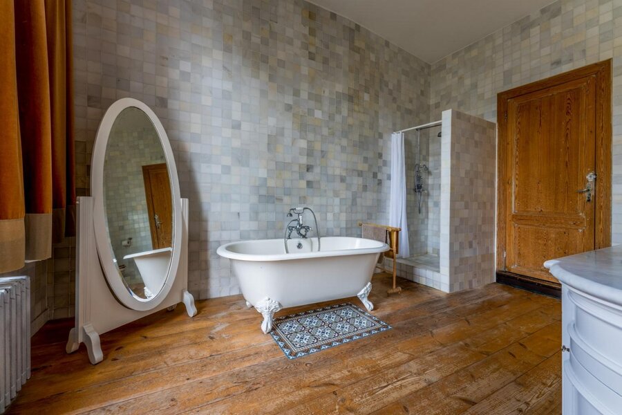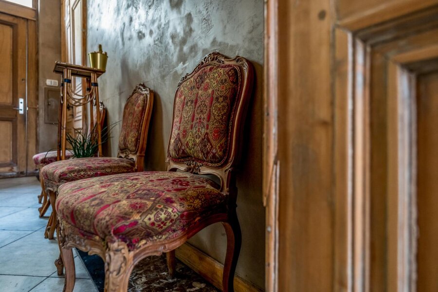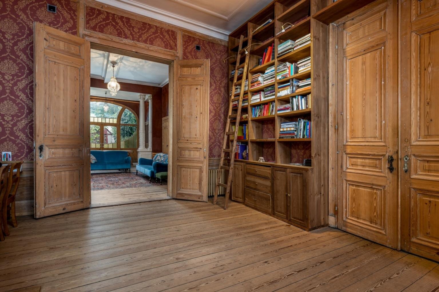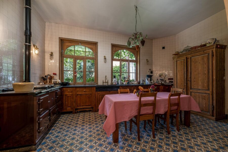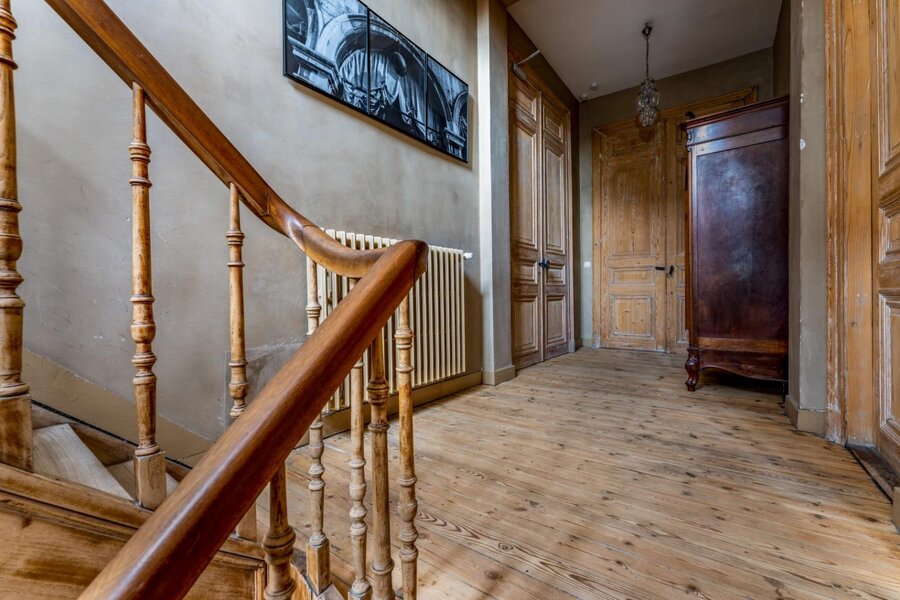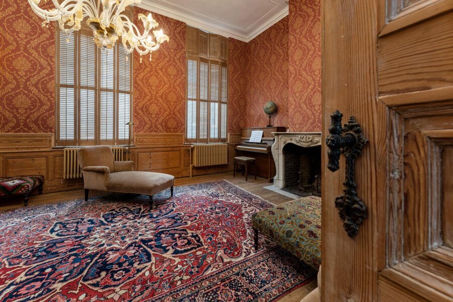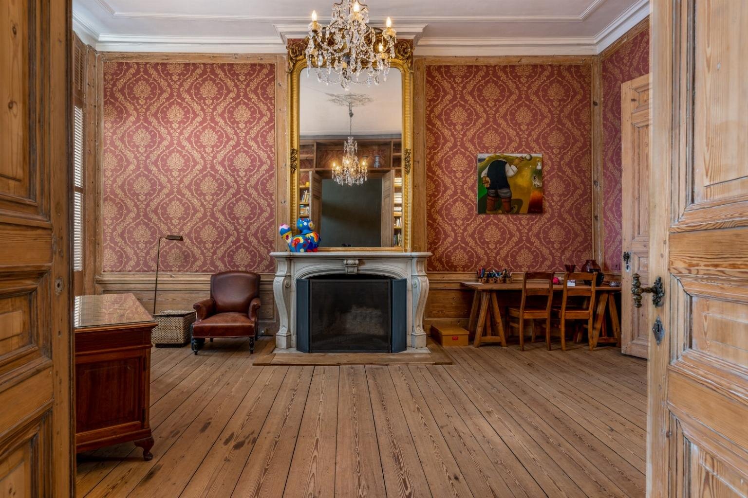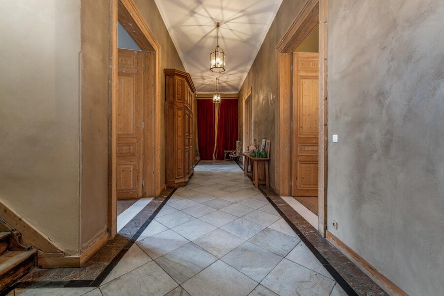 Via de monumentale inkom betreed je een reeks prachtige salons, hoge plafonds en royale ontvangstruimtes die herinneren aan een tijdperk van stijl en elegantie. Er is een bibliotheekruimte, een bureau, diverse eetkamers en een volledig uitgeruste keuken, waardoor het huis zich zowel leent tot representatief gebruik als tot comfortabel wonen. De bijzondere breedte en hoekligging zorgen voor een overvloed aan licht en een open gevoel dat in een historische stadskern bijzonder zeldzaam is.