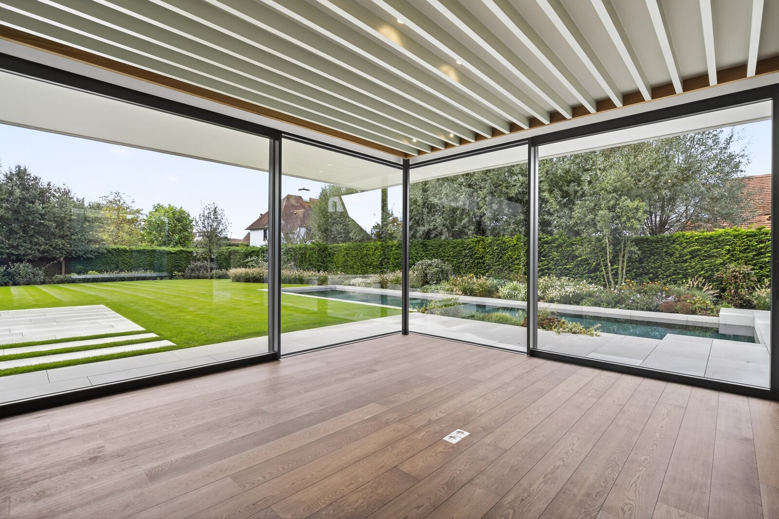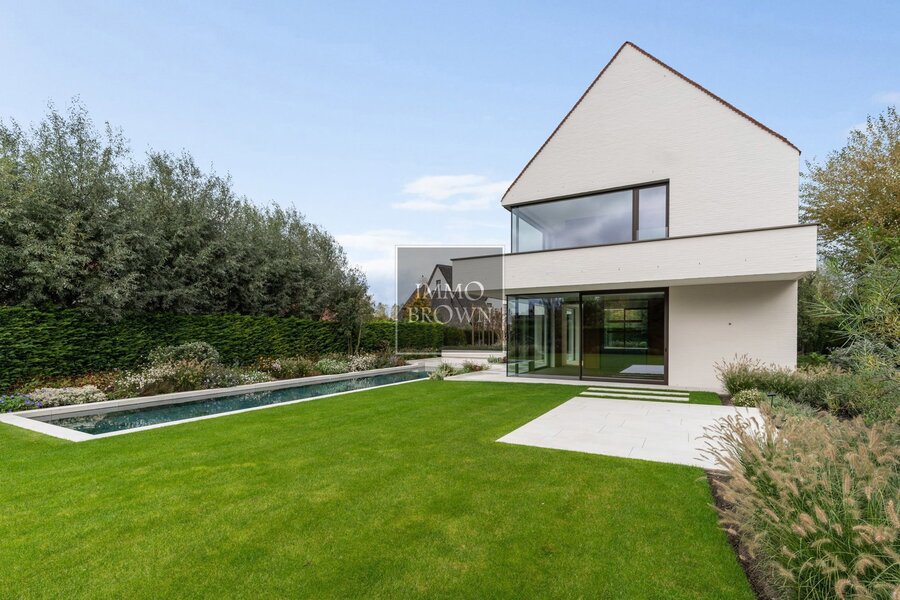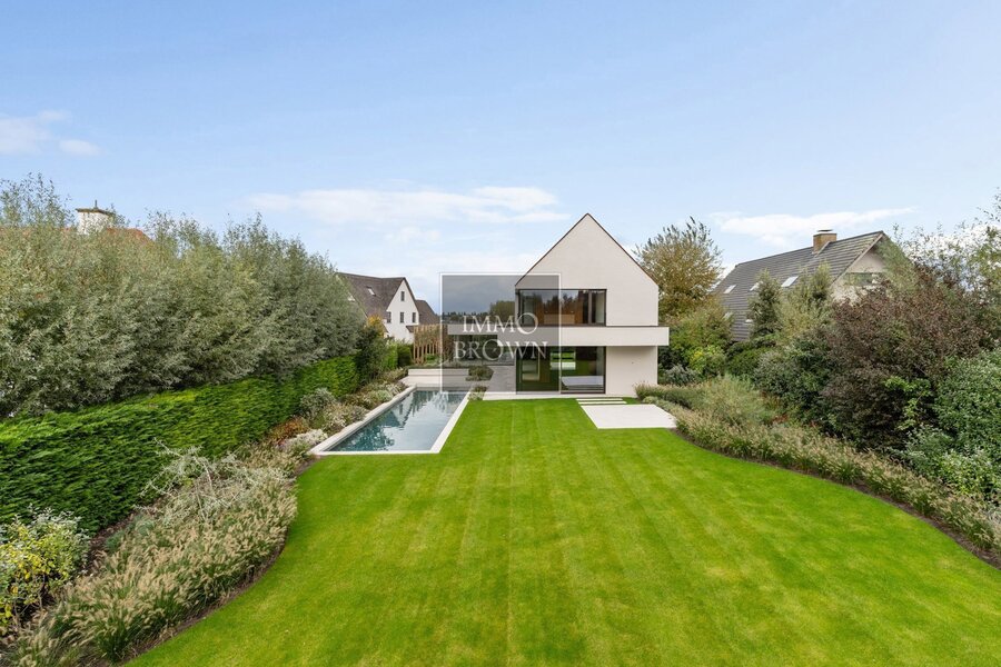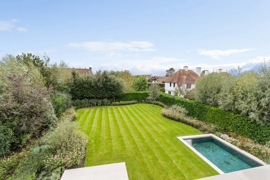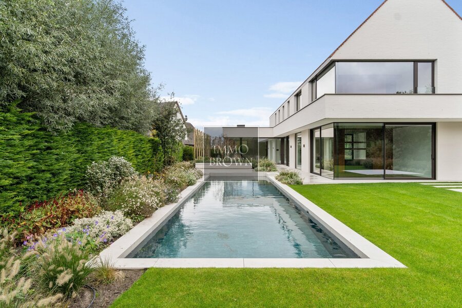 De tuin is volledig aangelegd en vormt een oase van rust met een privézwembad en zonnige terrassen. Ondergronds beschikt de villa over een ruime garage met autolift, ideaal voor meerdere voertuigen, en een discrete fietsenberging die de oprit steeds vrij houdt.