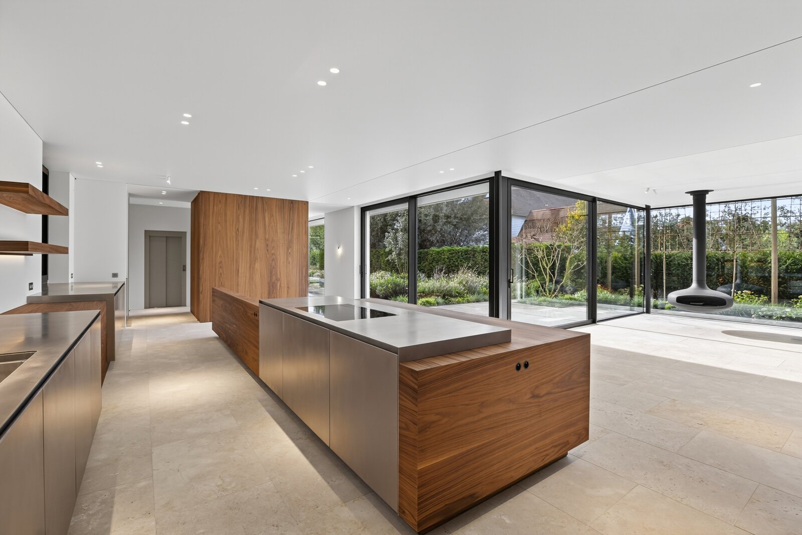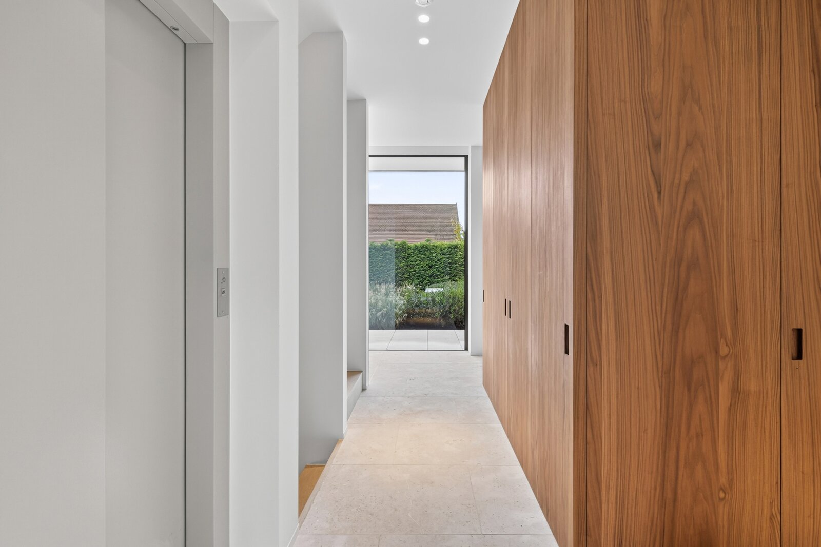 Op het gelijkvloers vindt u een royale leefruimte met grote raampartijen die de natuur binnenhalen en een open sfeer creëren. De volledig uitgeruste keuken sluit naadloos aan op de eetruimte en vormt het hart van het huis, aangevuld met een aparte tv-hoek voor extra comfort. Een lift verbindt de verdiepingen discreet en praktisch. Met een zij-ingang aan de woning bevindt zich een aparte doucheruimte met berging bij het zwembad.