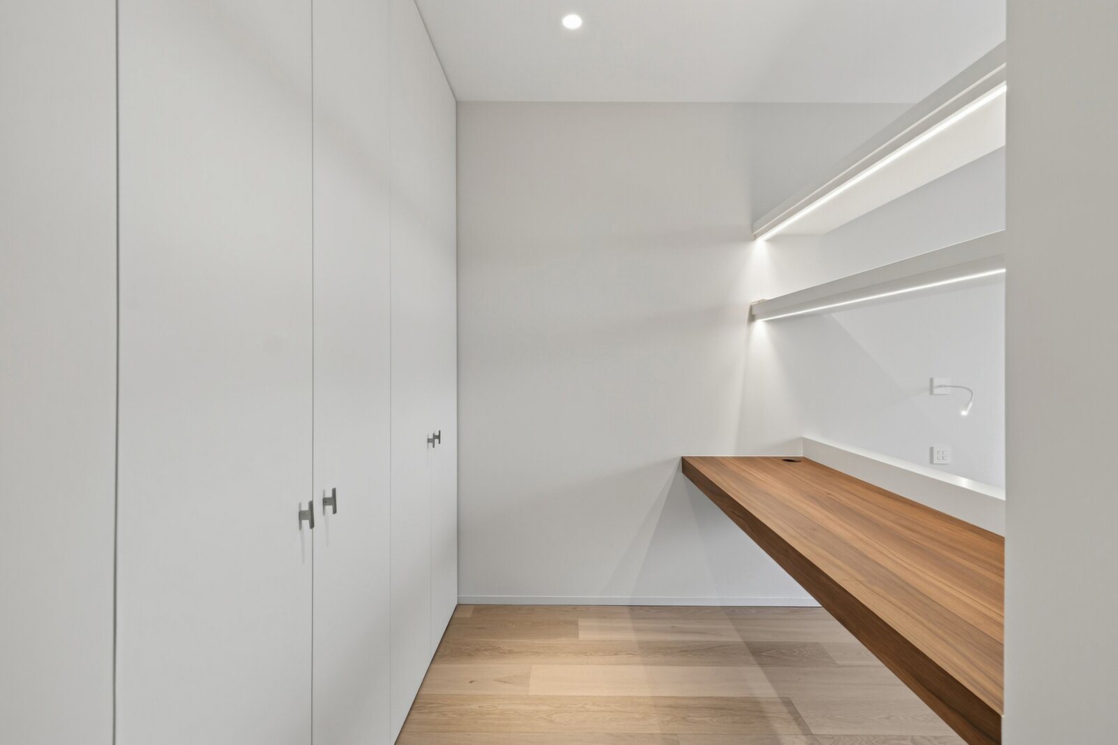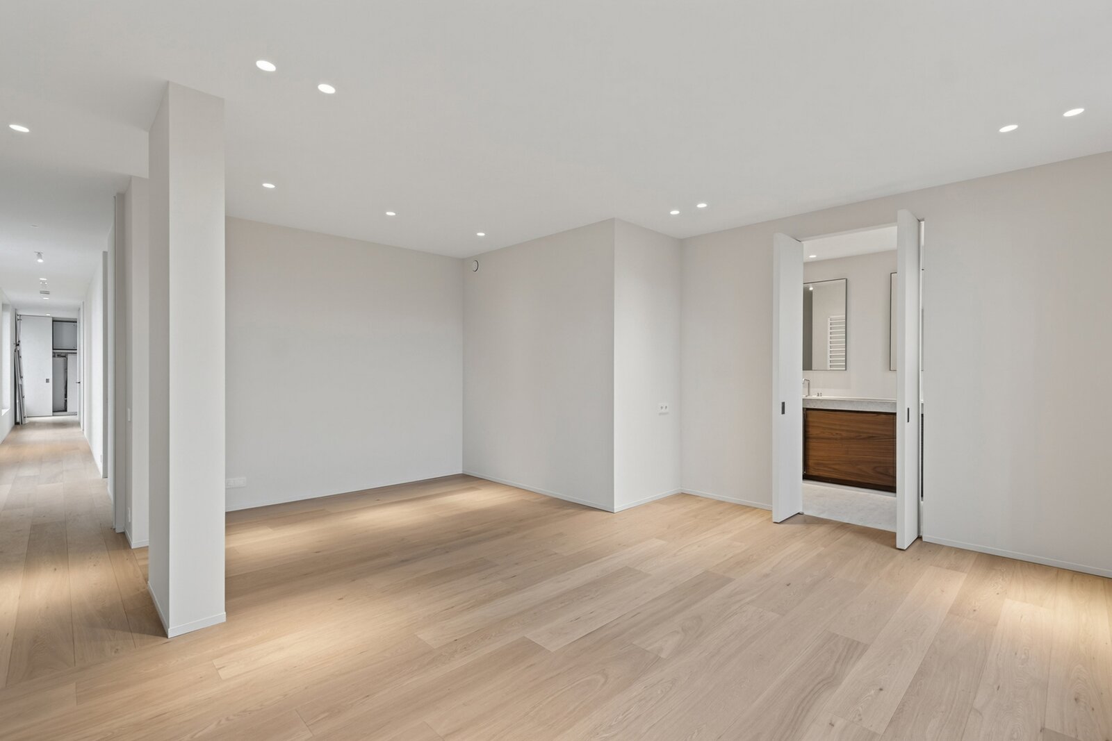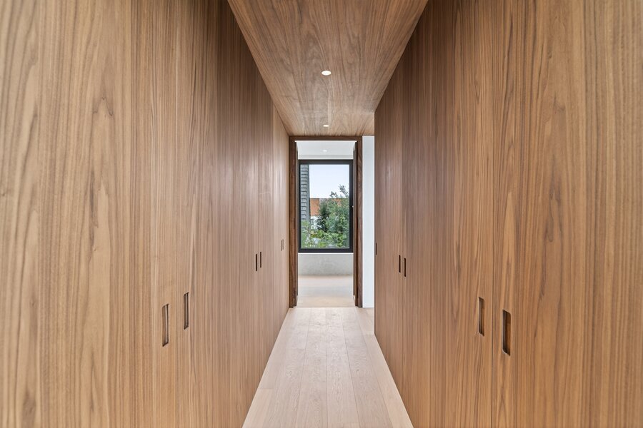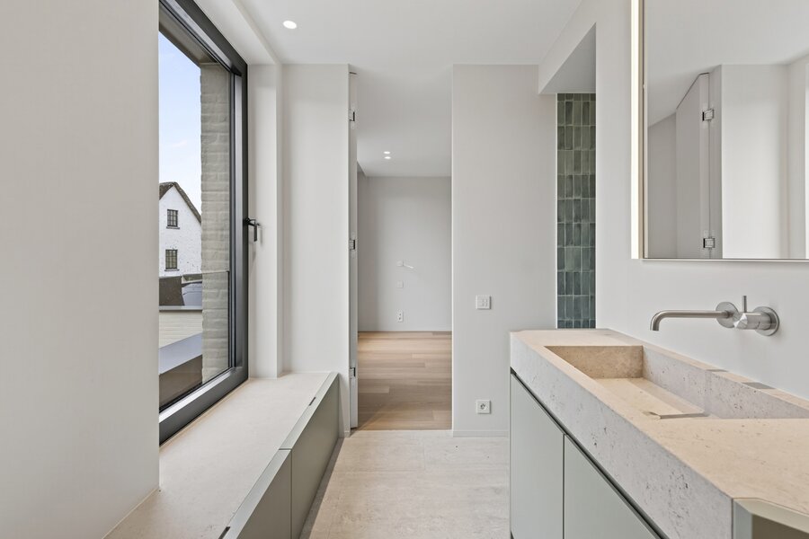 Op de eerste verdieping bevinden zich vier elegante slaapkamers, elk met een eigen badkamer, afgewerkt met hoogwaardige materialen en oog voor detail. Eén van deze vier slaapkamers is de master bedroom, deze is voorzien van een dressing die volledig uitgerust is met maatwerkkasten.