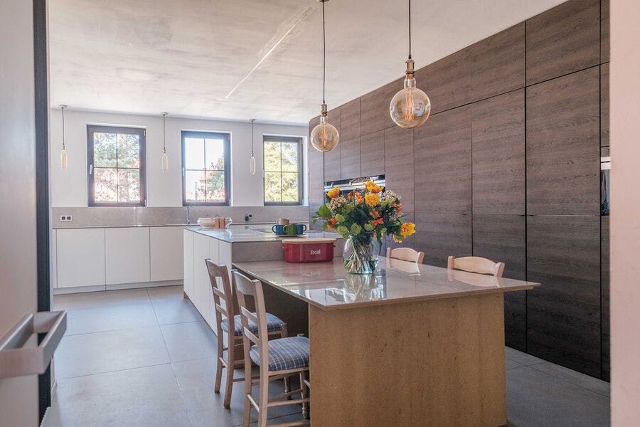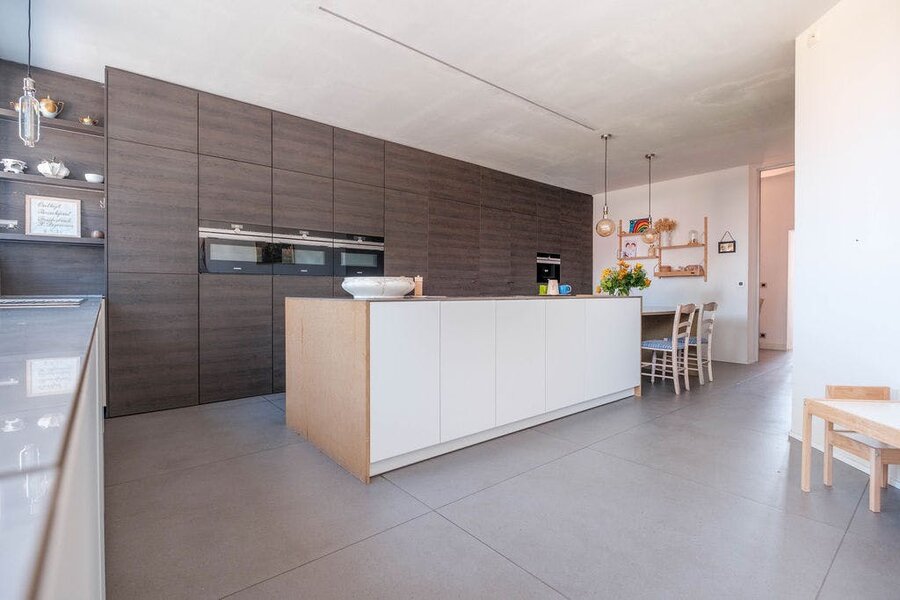 De leefkeuken is ruim, met maatkasten, een natuurstenen kookeiland en geïntegreerde topapparatuur. De eet- en leefruimtes zijn licht, open en verbinden harmonieus met de tuin.
