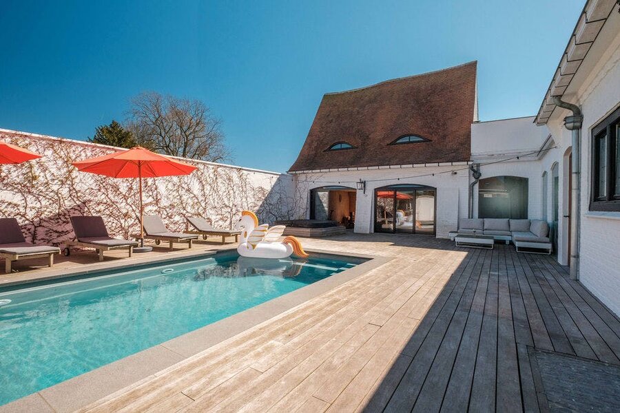 De zuidgerichte tuin is aangelegd met verwarmd zwembad, groot terras en ontspanningsruimtes.