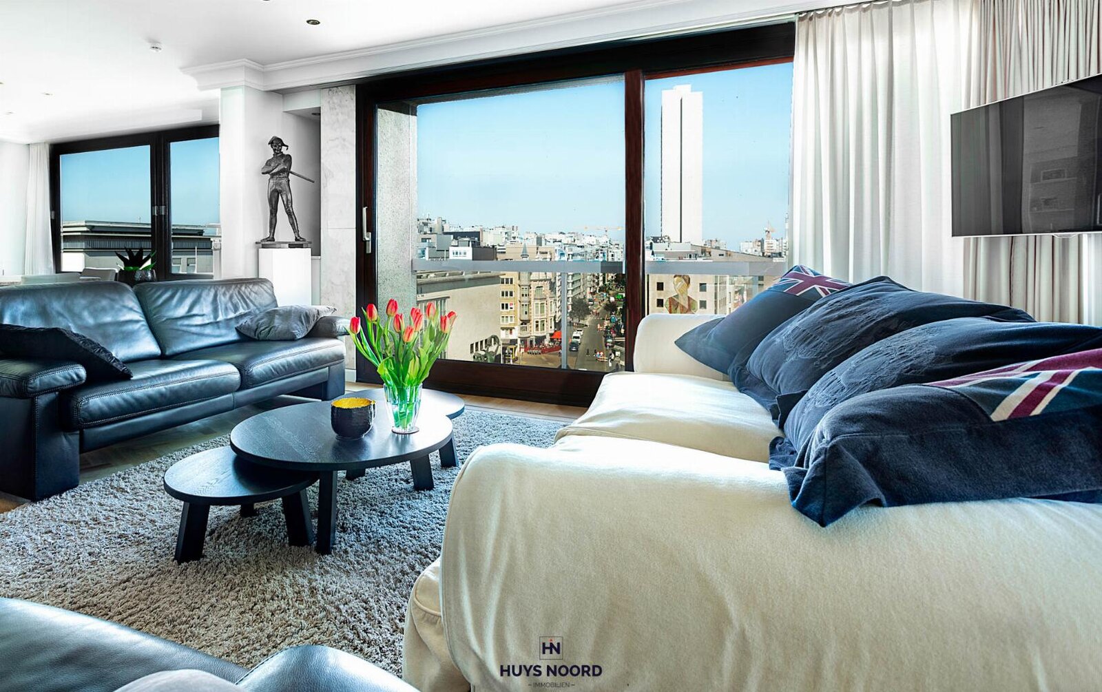 Het appartement ligt op de vijfde verdieping van een uitstekend onderhouden residentie. Via een ruime lift kom je in een lichtrijke leefruimte van 60m² met panoramisch uitzicht over het bruisende stadscentrum jouw oase van rust dankzij geluidwerend glas.