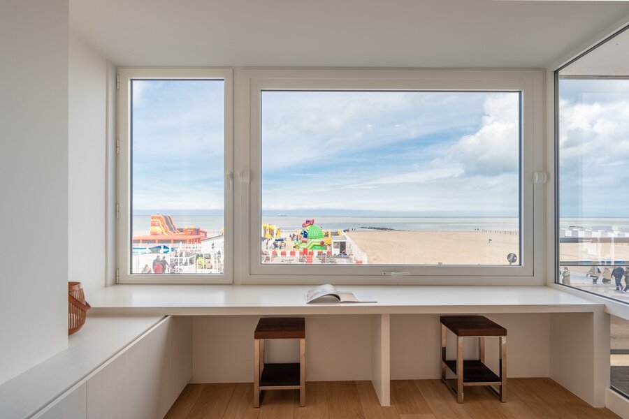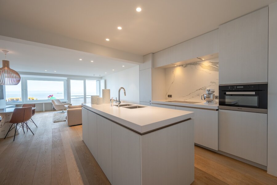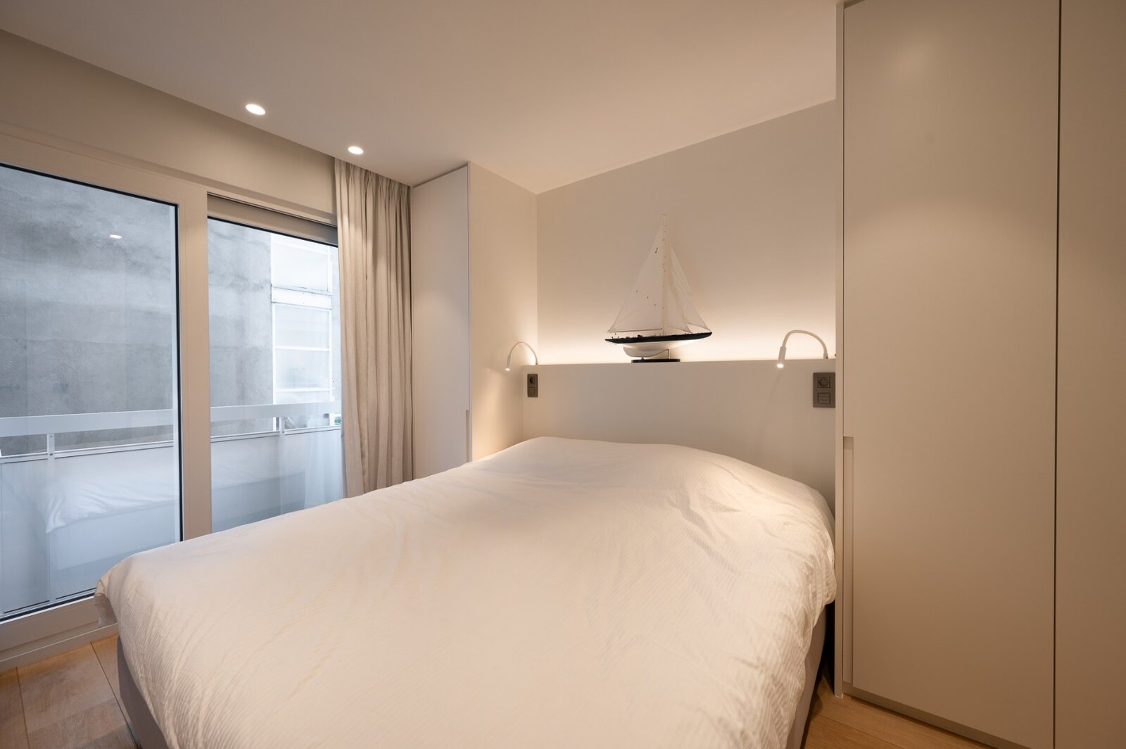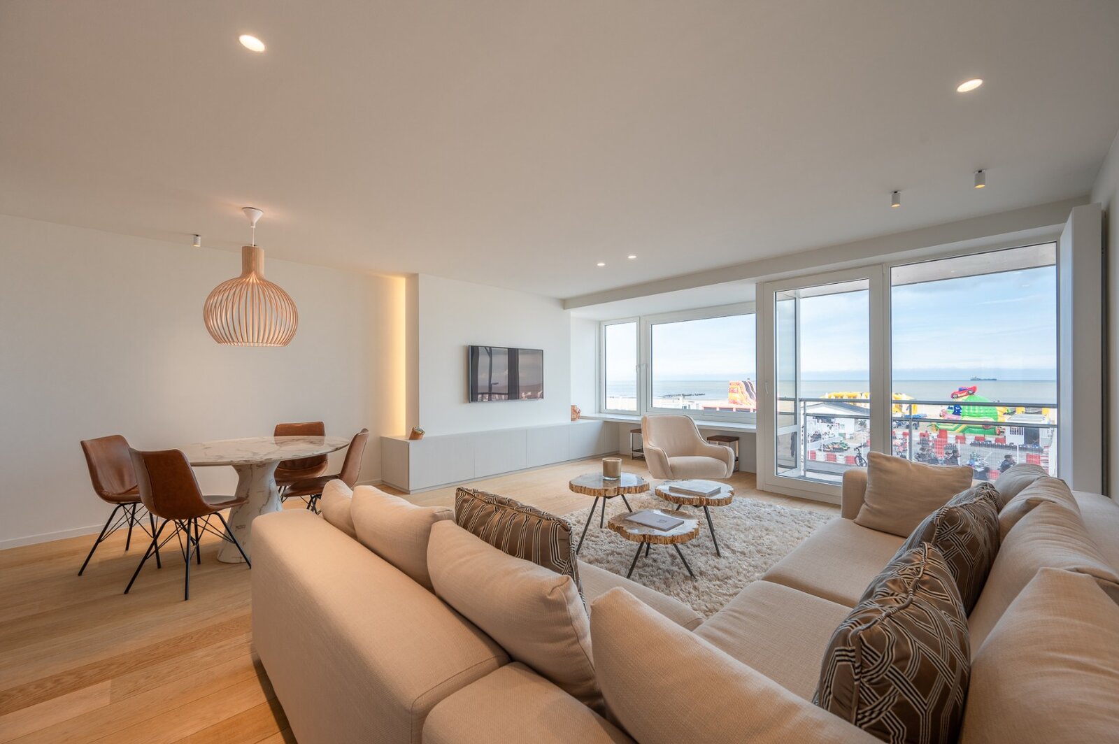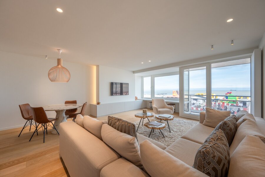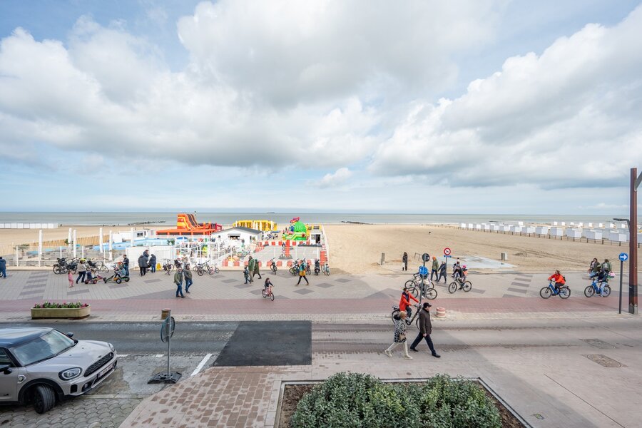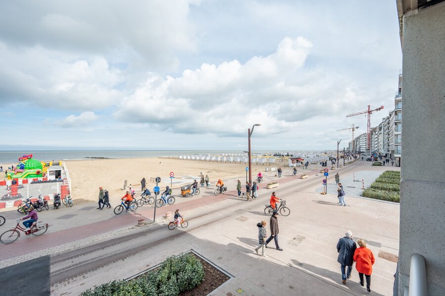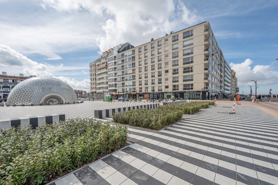 Prachtig gerenoveerd appartement met breed frontaal zeezicht, vlakbij het Albertplein en zelf met toegang via het plein.