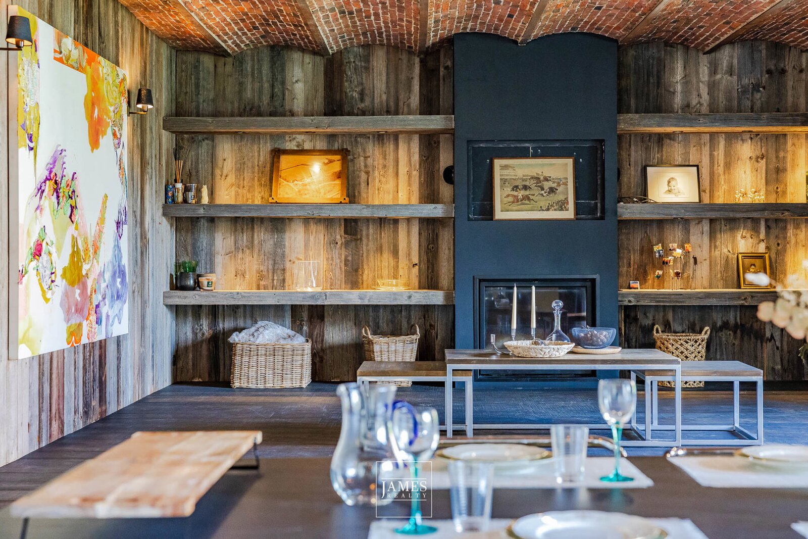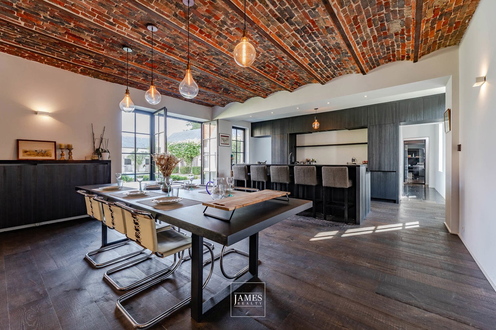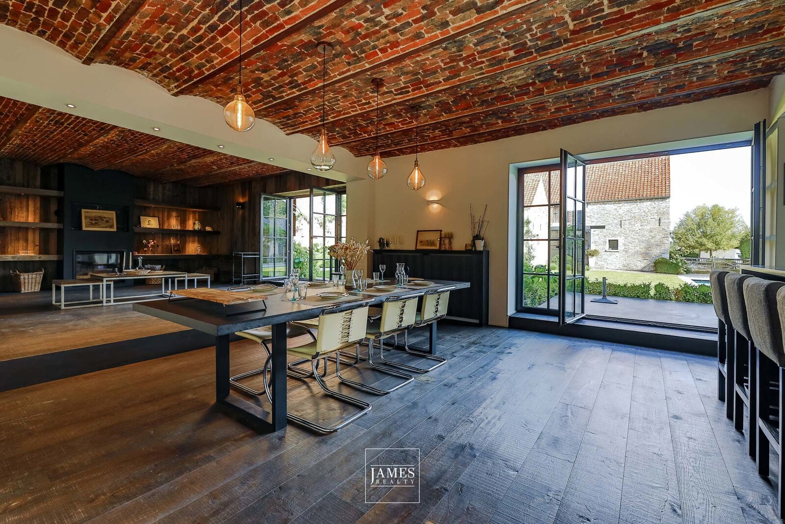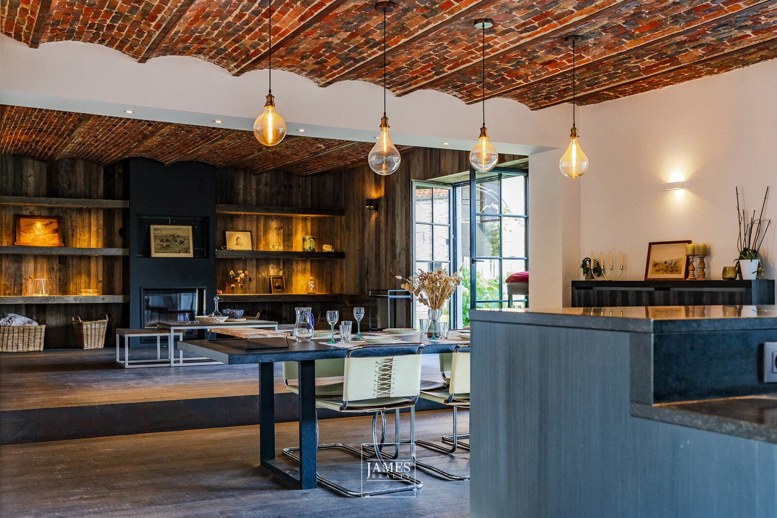 - Leefruimtes die uitkomen op de binnentuin die omgetoverd is tot een oase met zwembad: superuitgeruste keuken, eetkamer en salon met open haard, volledig bekleed met Canadees hout.