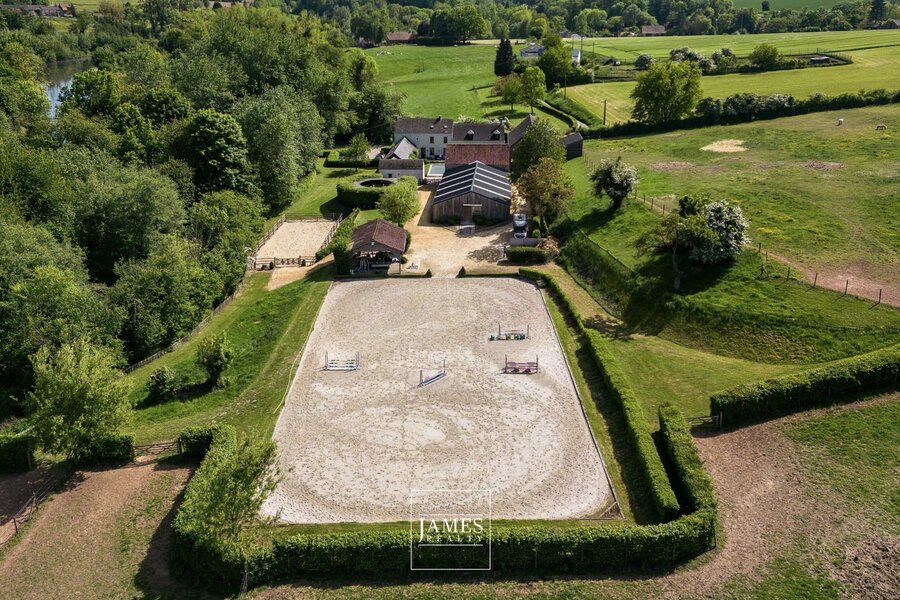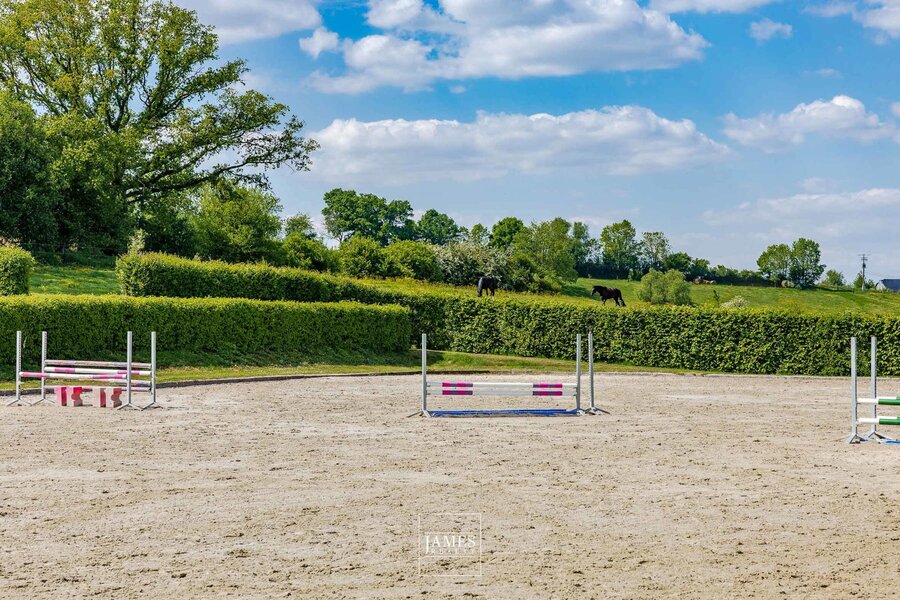 Deze prachtige paardenboerderij, volledig gerenoveerd in 2015, heeft al zijn charme uit die tijd behouden met zijn gewelfde plafonds, originele vloertegels en muren van blauwe steen. Het bestaat uit stallen, een woning en weilanden van 2 ha 84.