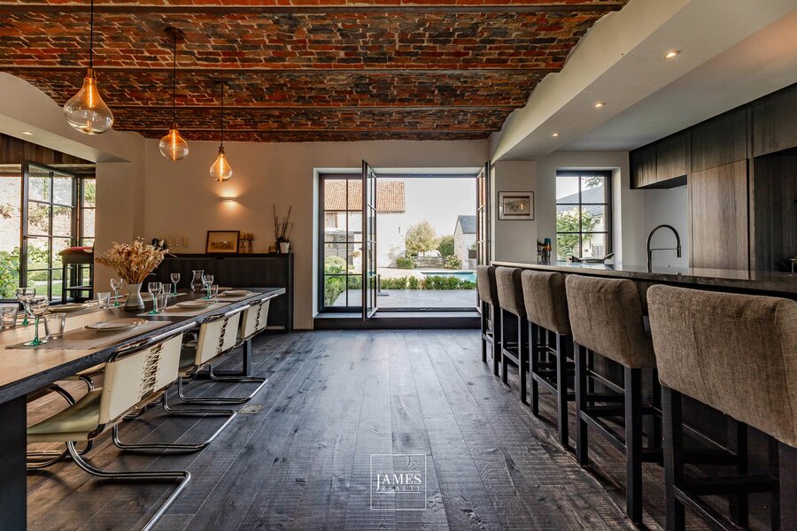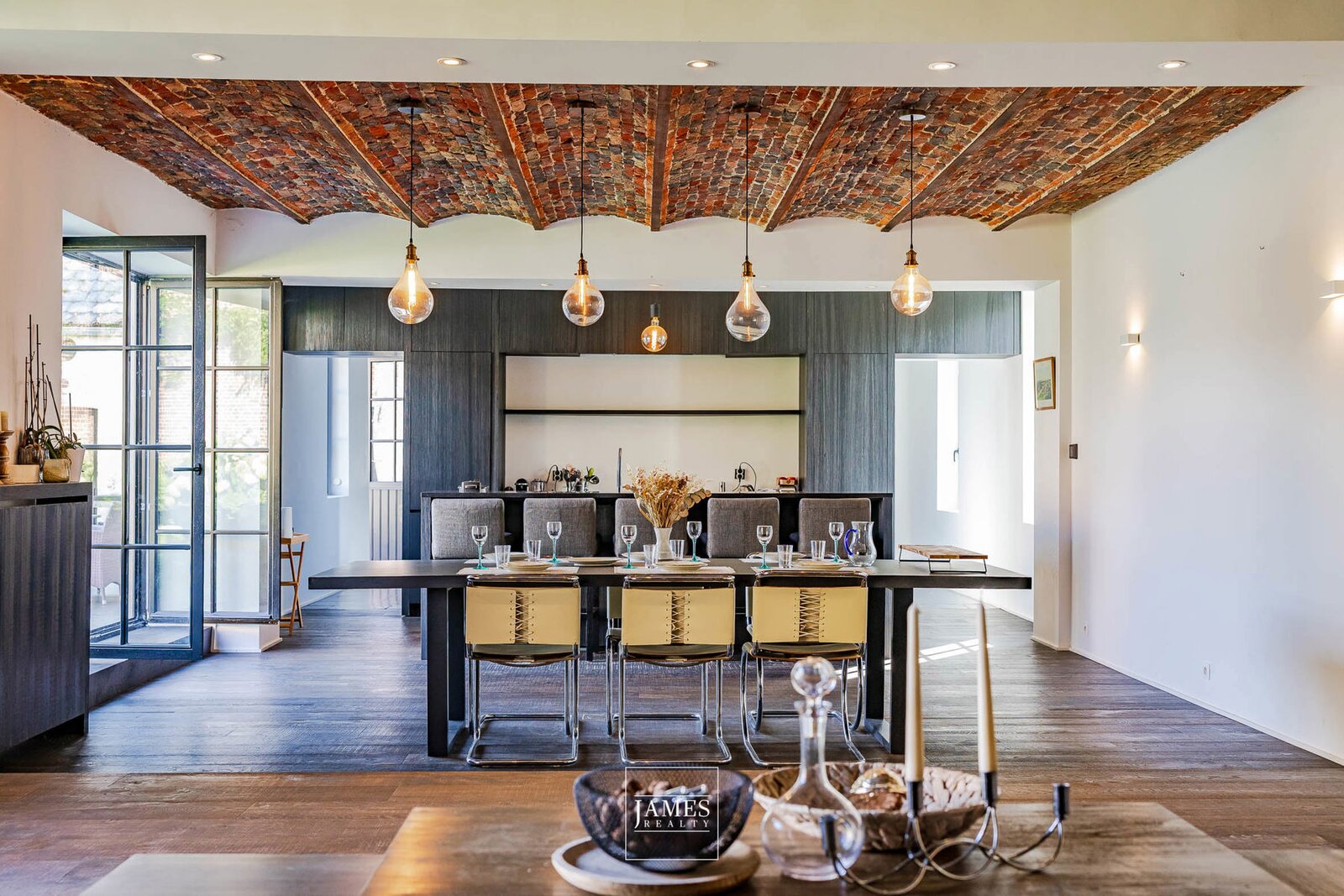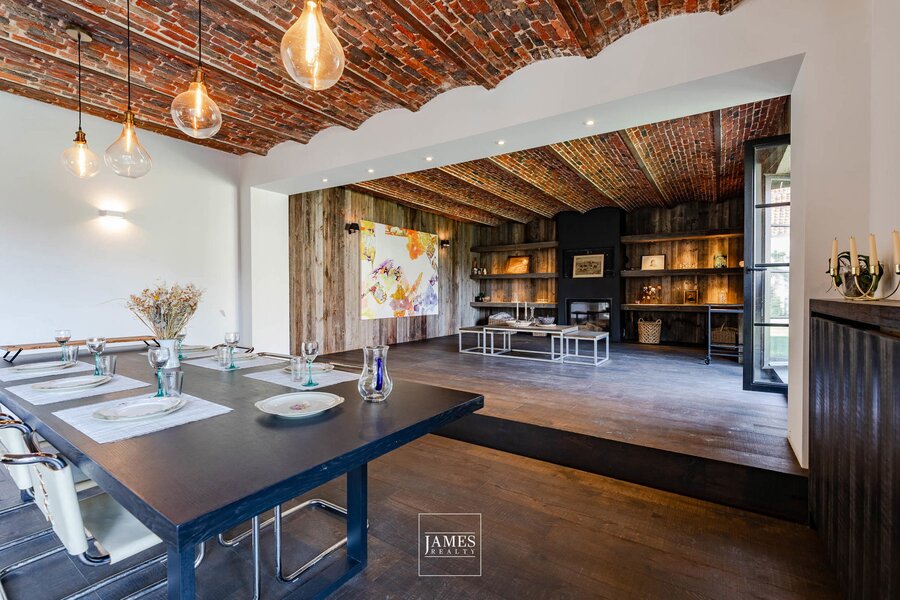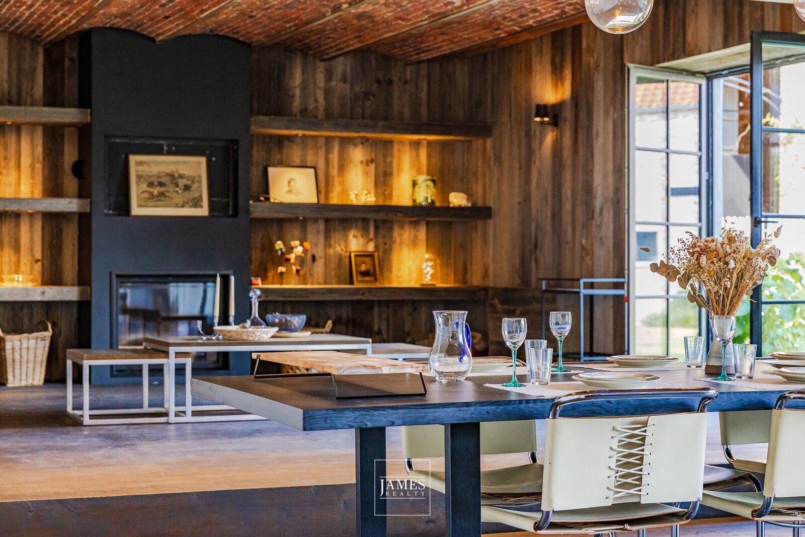 - Leefruimtes die uitkomen op de binnentuin die omgetoverd is tot een oase met zwembad: superuitgeruste keuken, eetkamer en salon met open haard, volledig bekleed met Canadees hout.