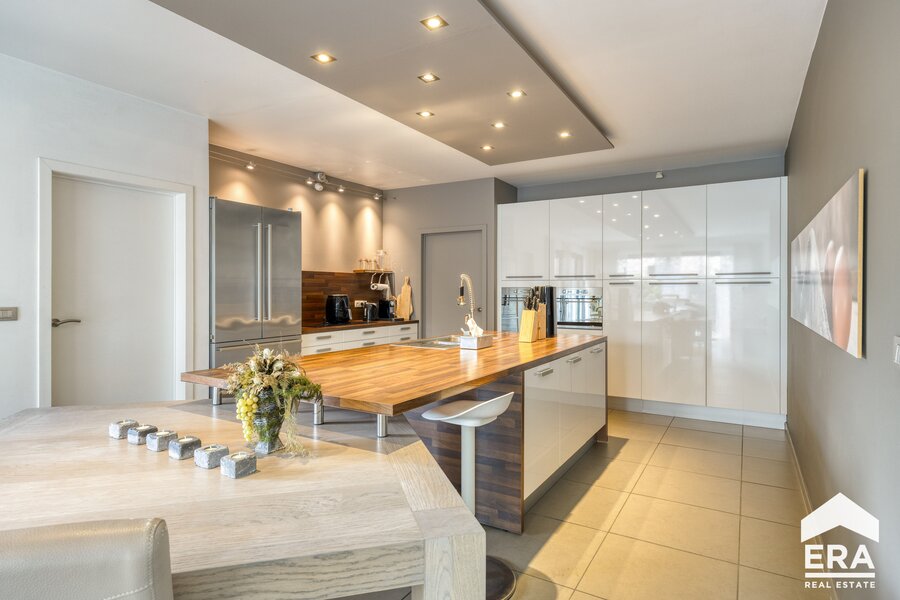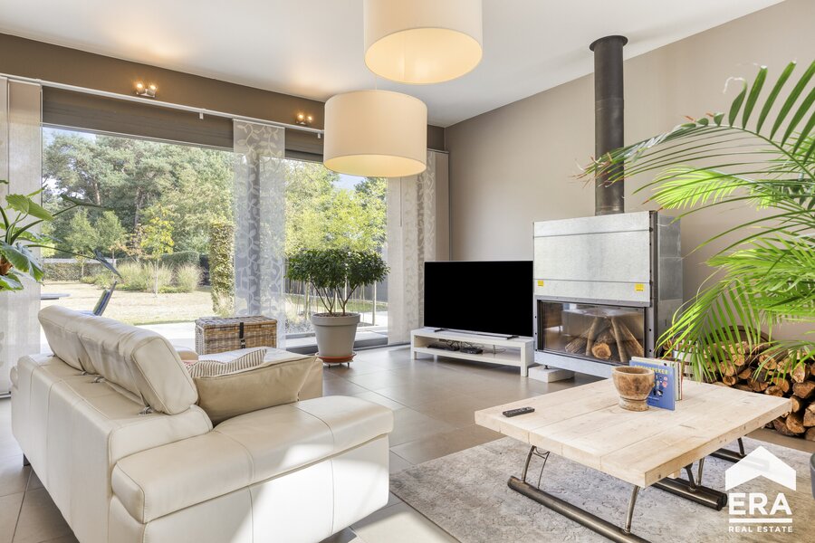 De leefruimte met gezellige open haard en vloerverwarming vormt het hart van het huis en sluit naadloos aan bij de volledig ingerichte keuken. Alle verlichting is stijlvol ingebouwd.