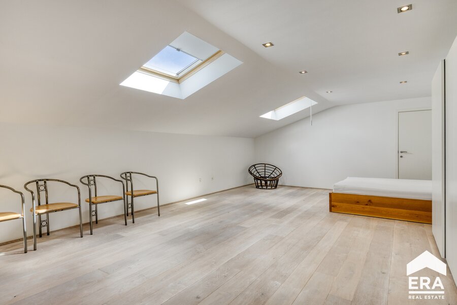 - Verdieping: slaapkamer 1 (20 m²) met aparte dressing; badkamer 1 (13,5 m²); slaapkamer 2 (13,5 m²); badkamer 2 (4 m²); slaapkamer 3 (40 m²); apart toilet; slaapkamer 4 (25 m²)