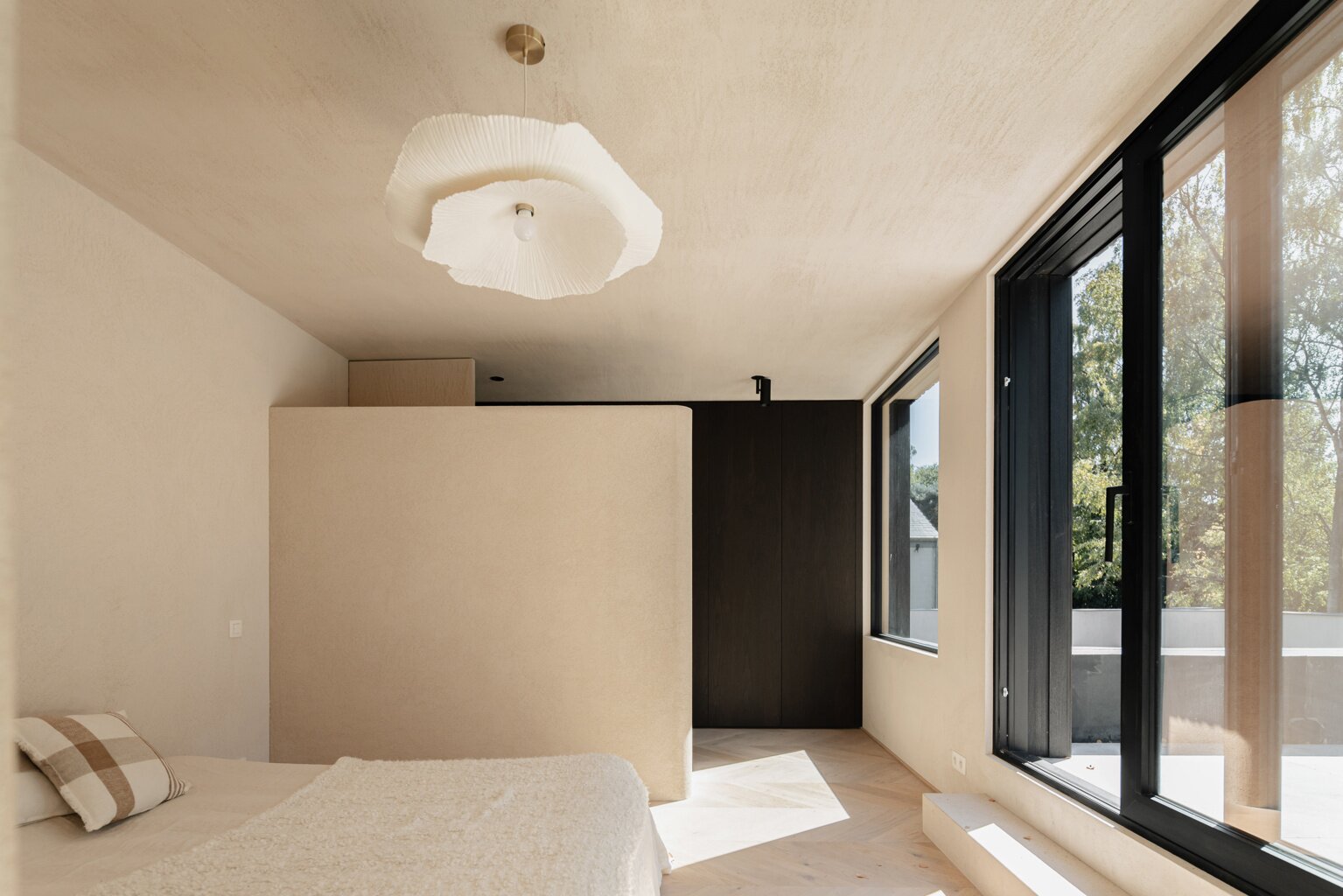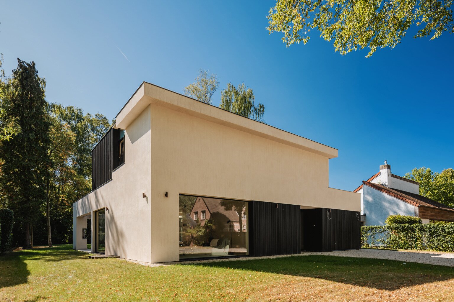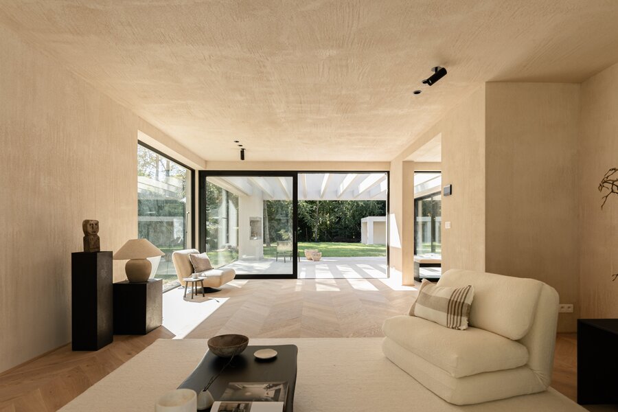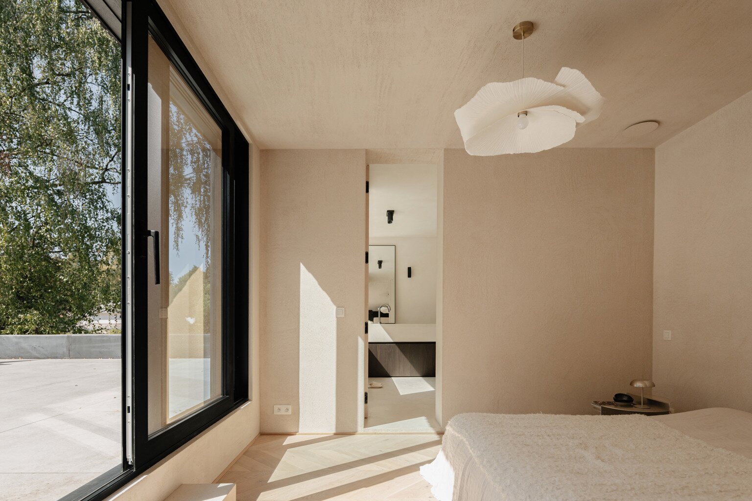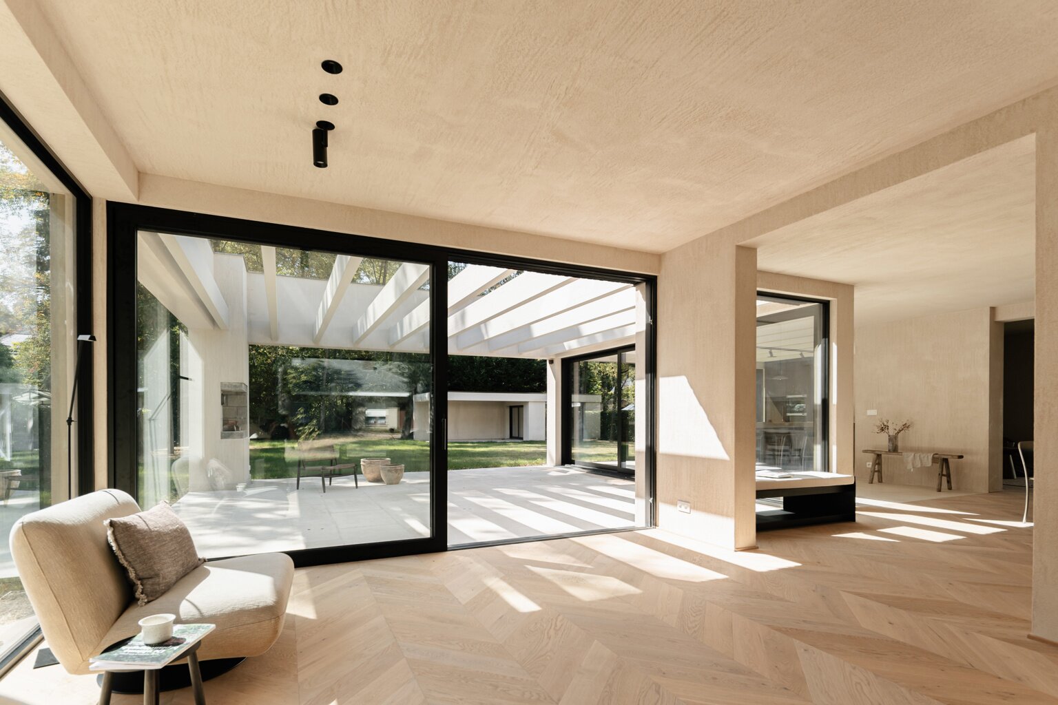Deze architecturale villa werd met veel zorg gebouwd in 2025. Bij het binnenkomen valt meteen de smaakvolle elegantie op: mooie parketvloeren, plafondhoge deuren en inbouwkasten met stijlvol afgeronde hoeken. In de hal is een handige vestiairekast – met aparte plaats voor schoenen, rechts is de toegang tot de garage, links het gastentoilet.