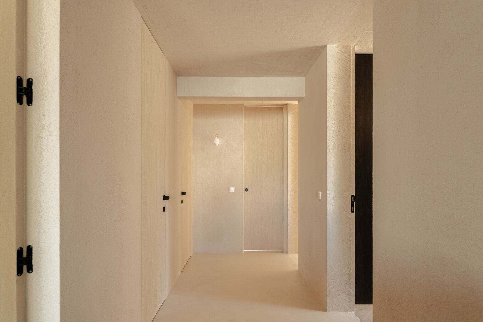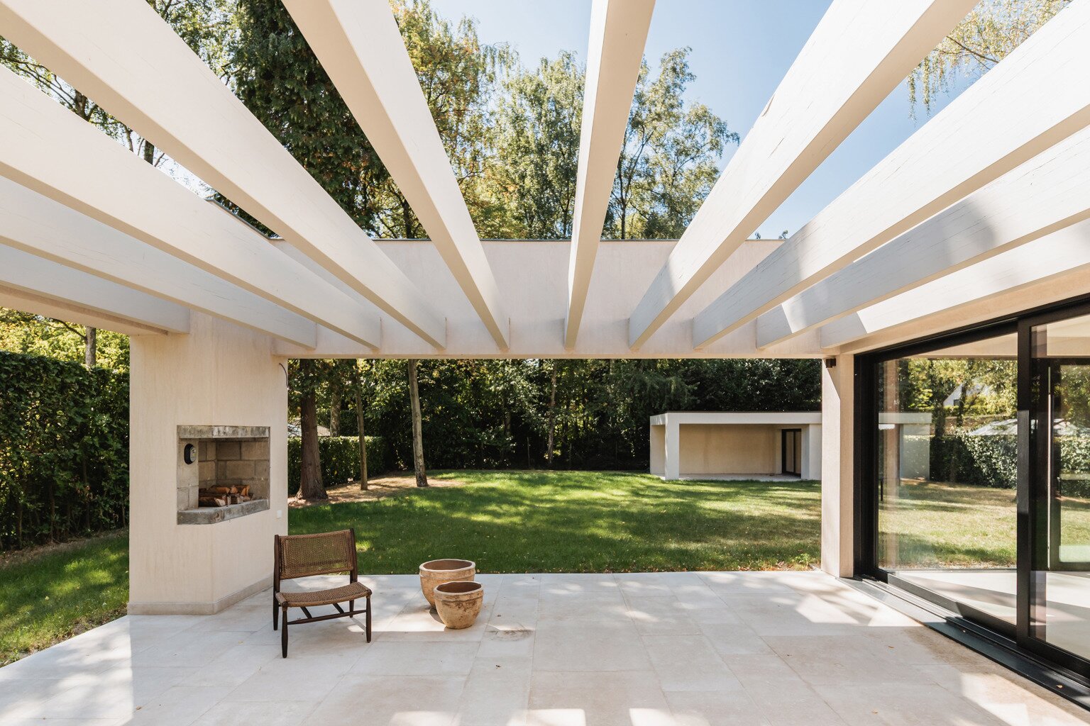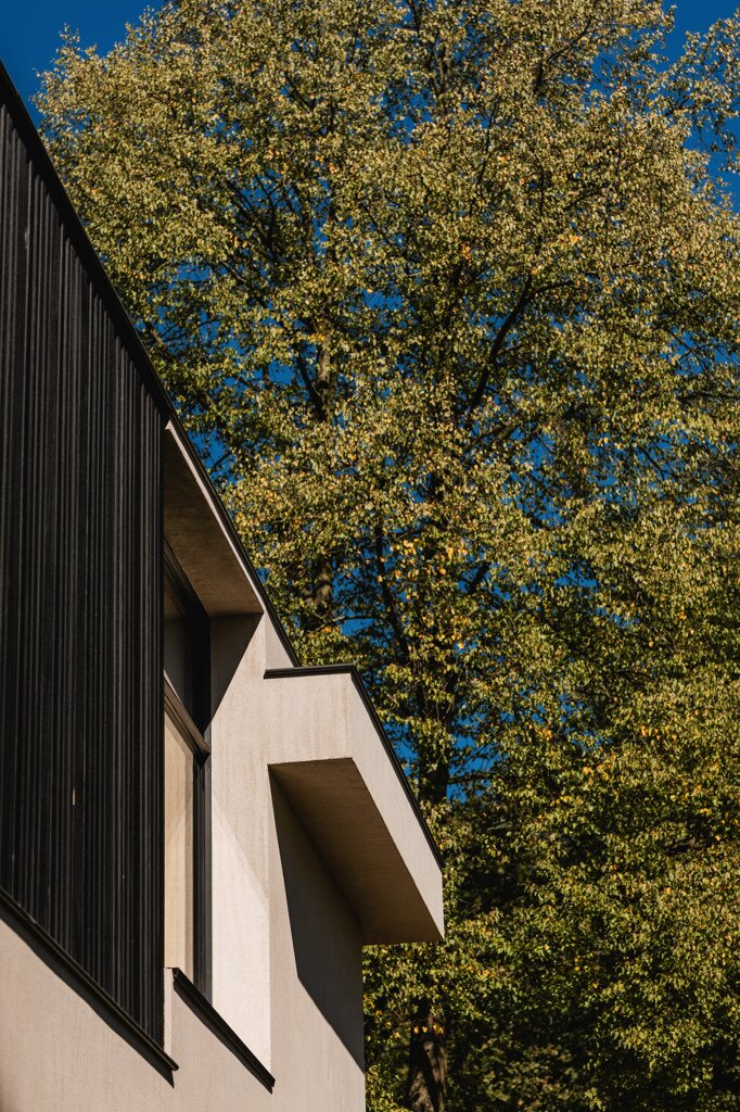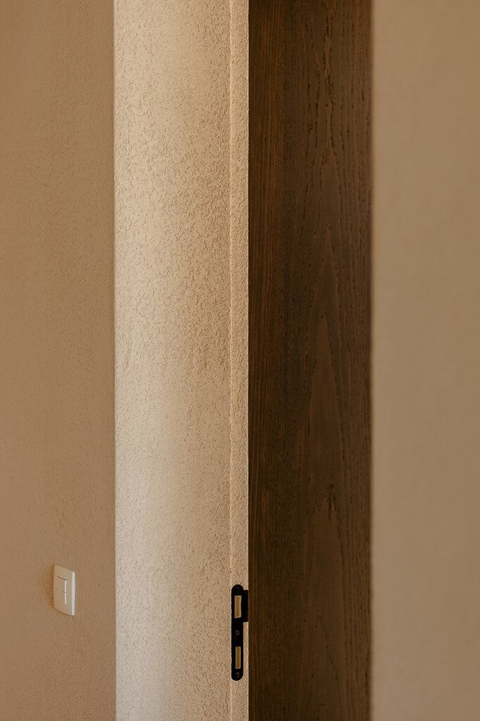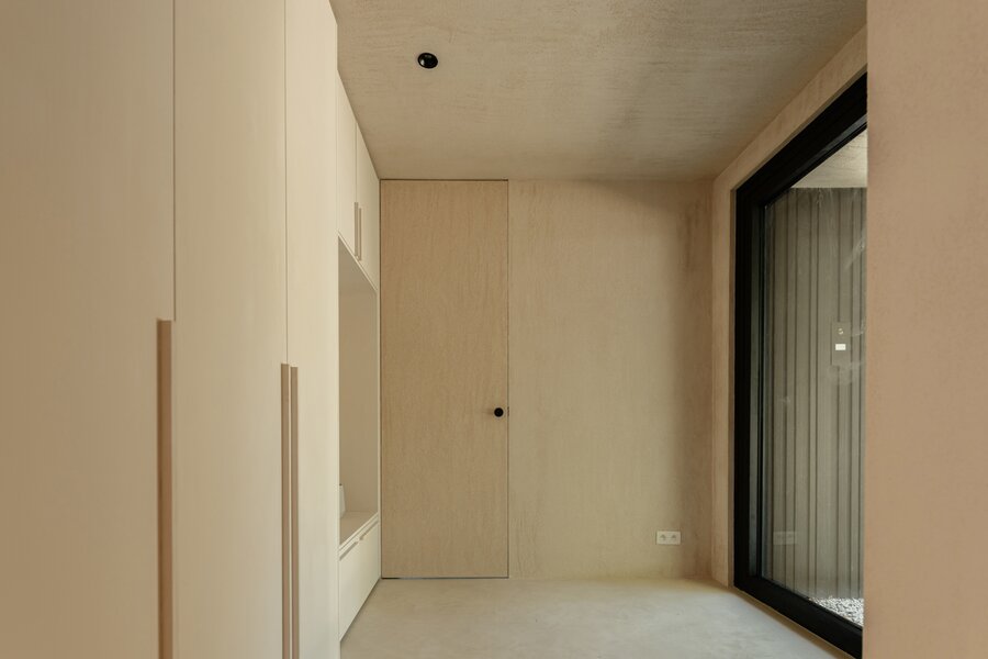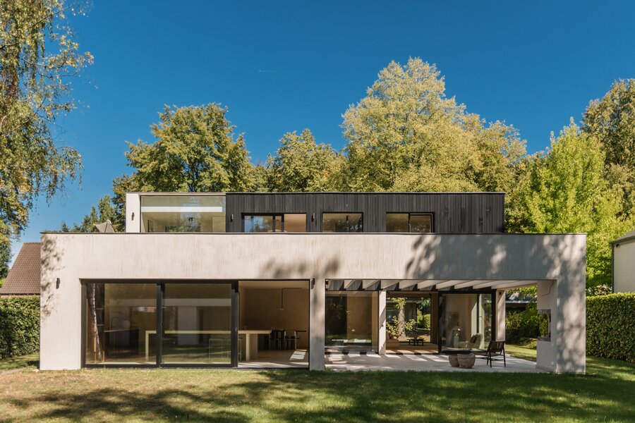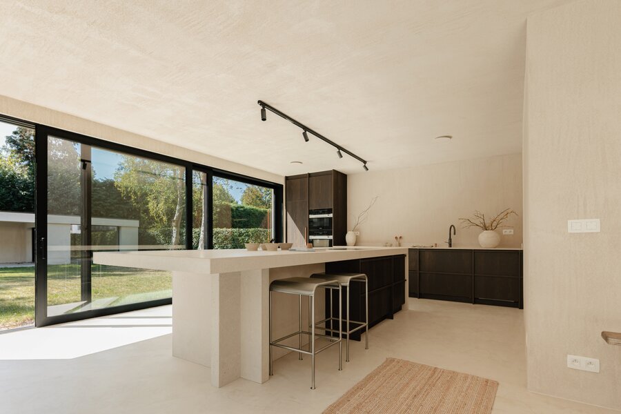 Deze architecturale villa werd met veel zorg gebouwd in 2025. Bij het binnenkomen valt meteen de smaakvolle elegantie op: mooie parketvloeren, plafondhoge deuren en inbouwkasten met stijlvol afgeronde hoeken. In de hal is een handige vestiairekast – met aparte plaats voor schoenen, rechts is de toegang tot de garage, links het gastentoilet.