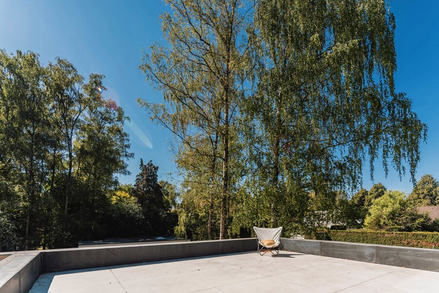 De master bedroom op de 1ste verdieping heeft een ruime dressing én een prachtig terras. In de naastgelegen badkamer (bad, inloopdouche en dubbele wastafel) kan je een bad nemen met zicht op groen. Verder zijn er nog 3 ruime kinderslaapkamers en een aparte kinderbadkamer met douche.