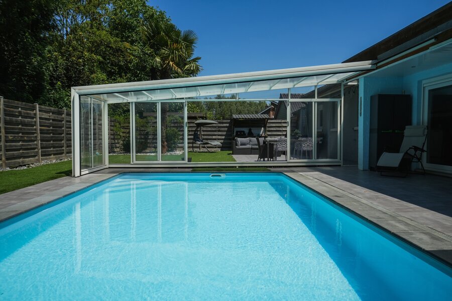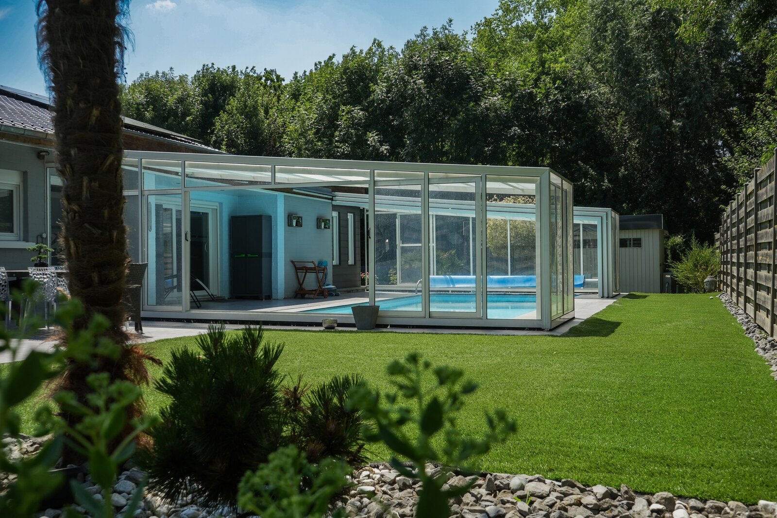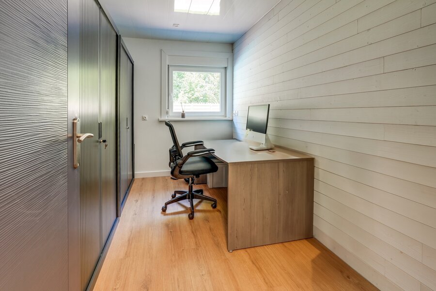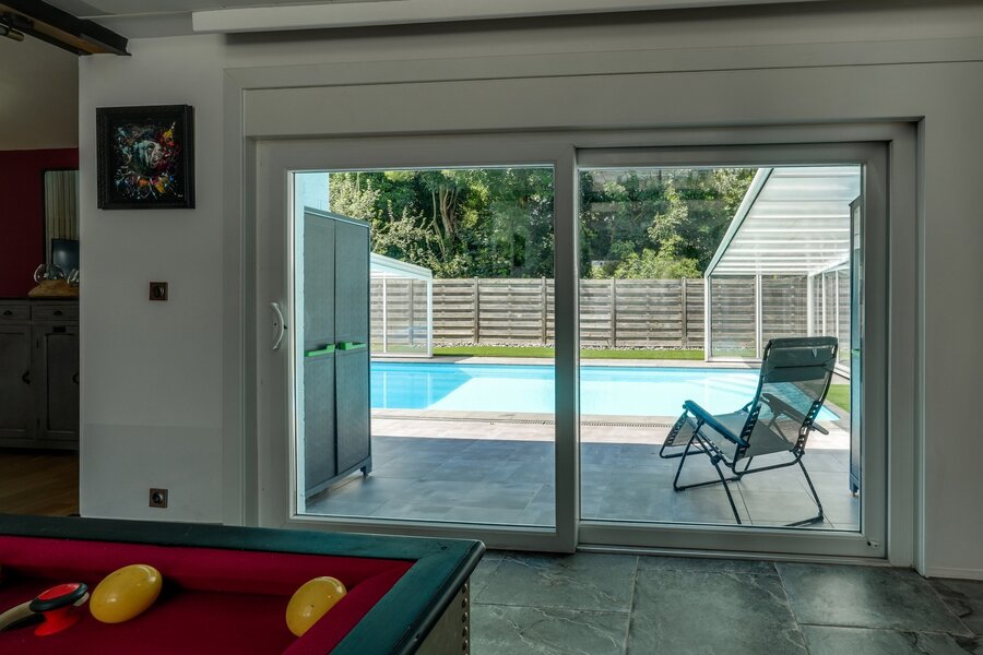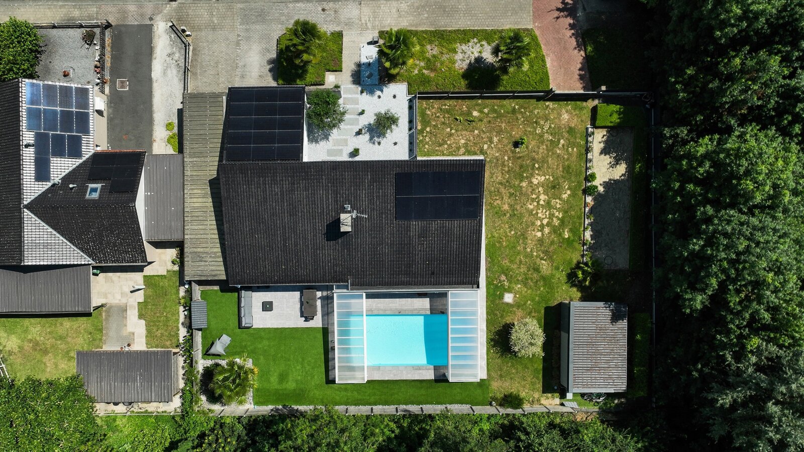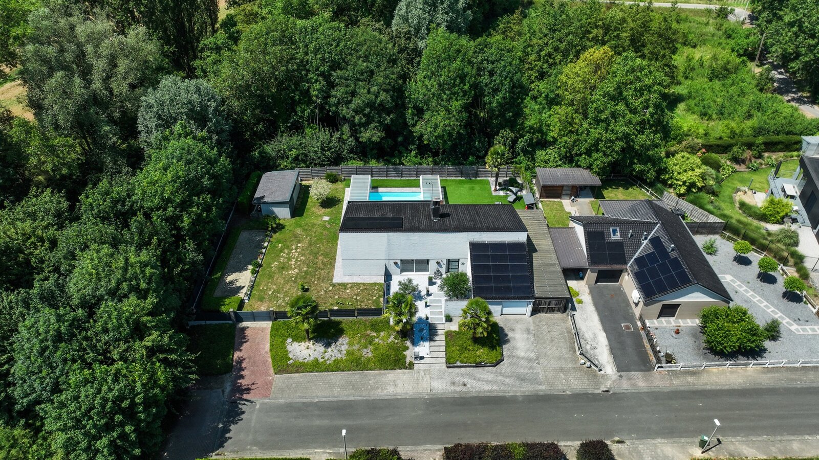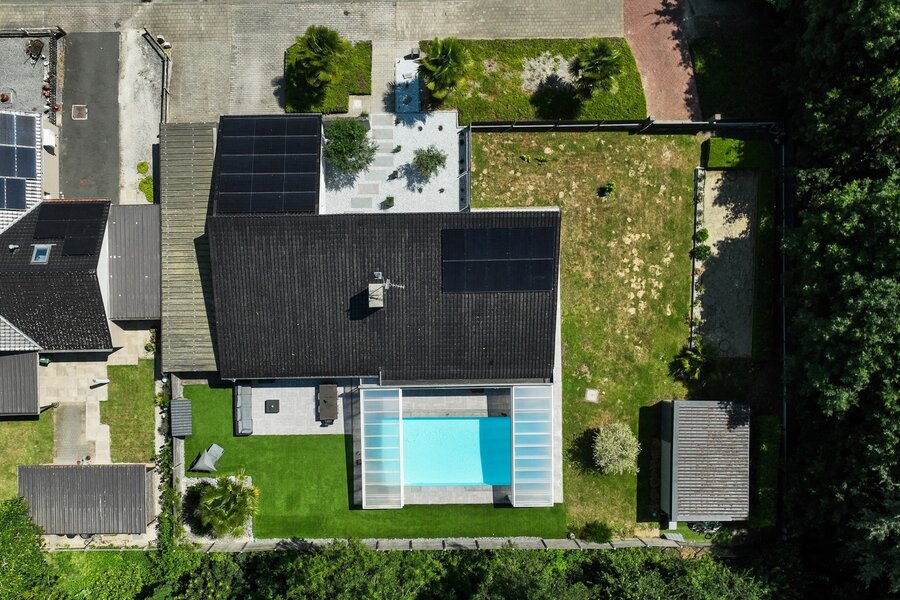 Buiten geniet u van een zonnig terras en een verwarmd, overdekt zwembad dat open kan bij mooi weer. De tuin is fraai aangelegd en grenst aan een rustig bosgedeelte. Er is een berging met overdekte barbecuehoek, carport voor drie wagens, parking voor twee auto's en een automatische poort.