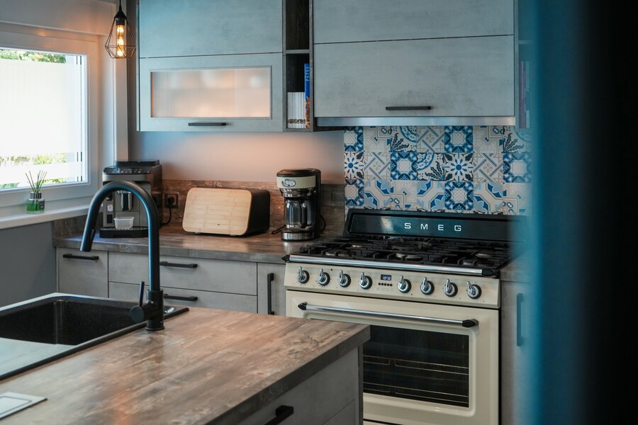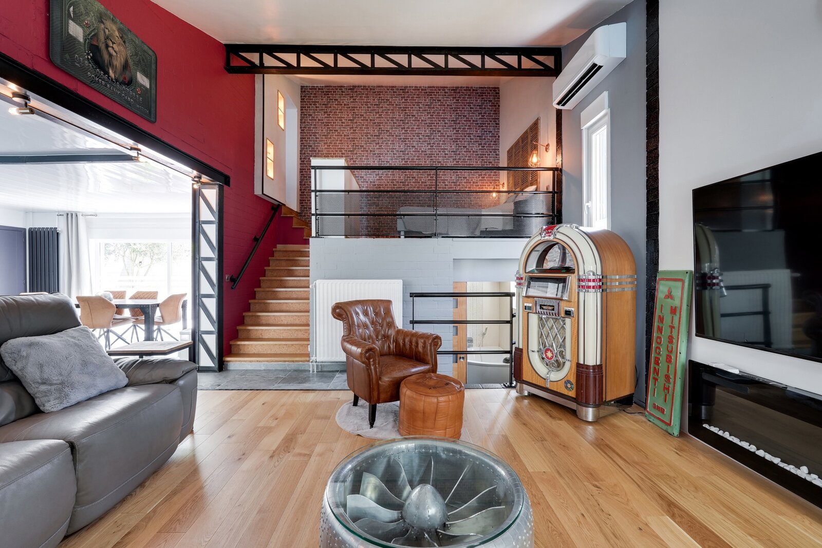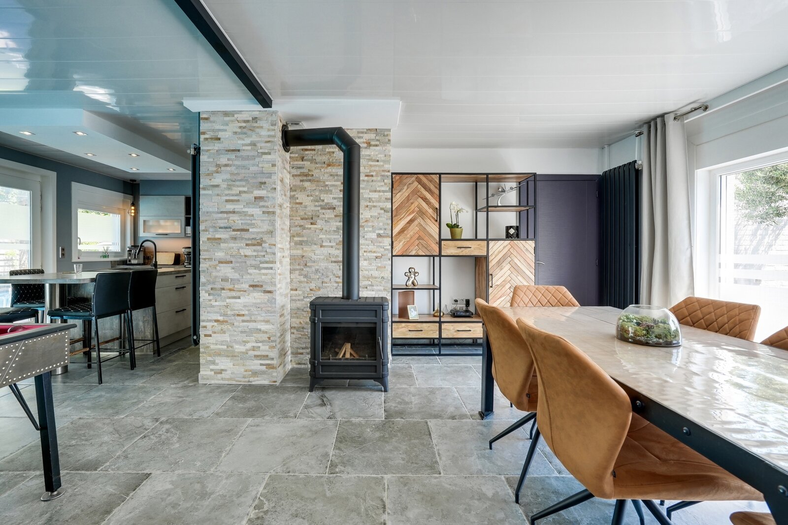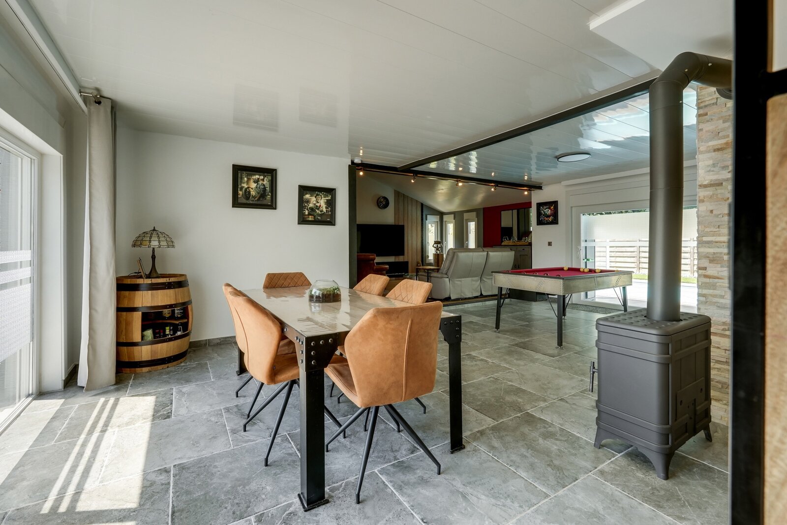 U wordt verwelkomd in een lichtrijke inkomhal met vestiaire en gastentoilet. Links bevindt zich een ruime leefruimte met houtkachel, zithoek en een open, volledig uitgeruste keuken met kookeiland, SMEG-toestellen, eethoek en veel opbergruimte.