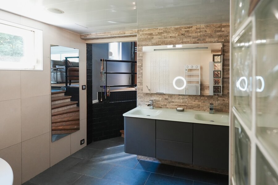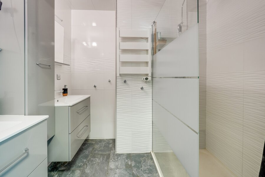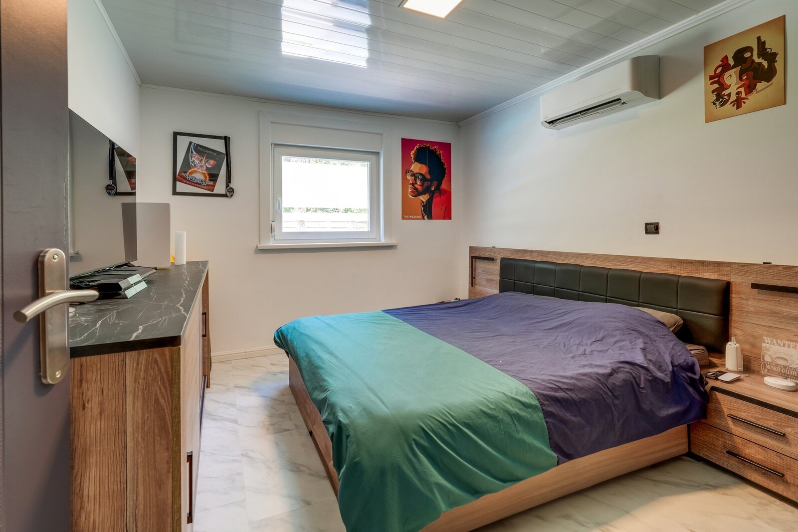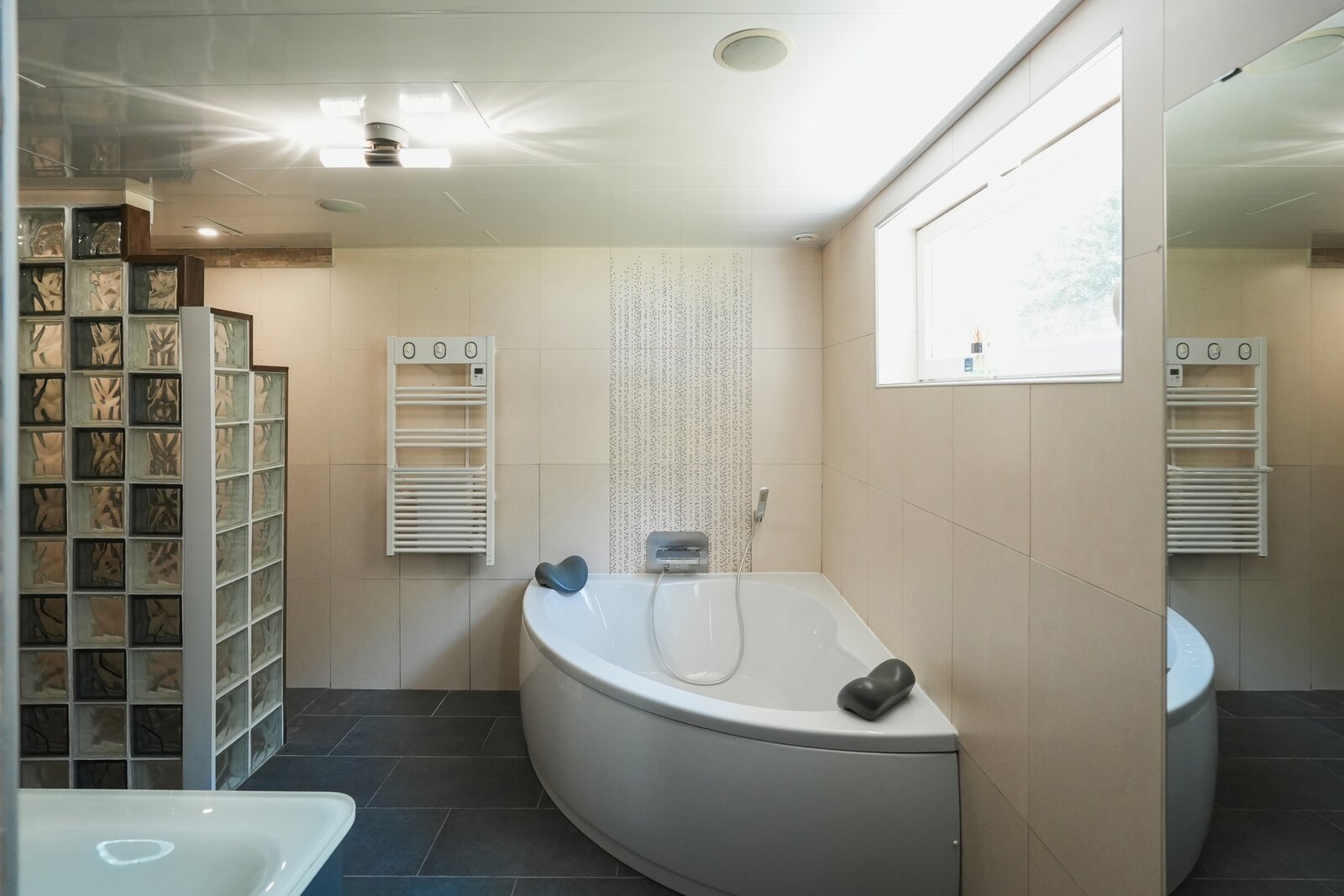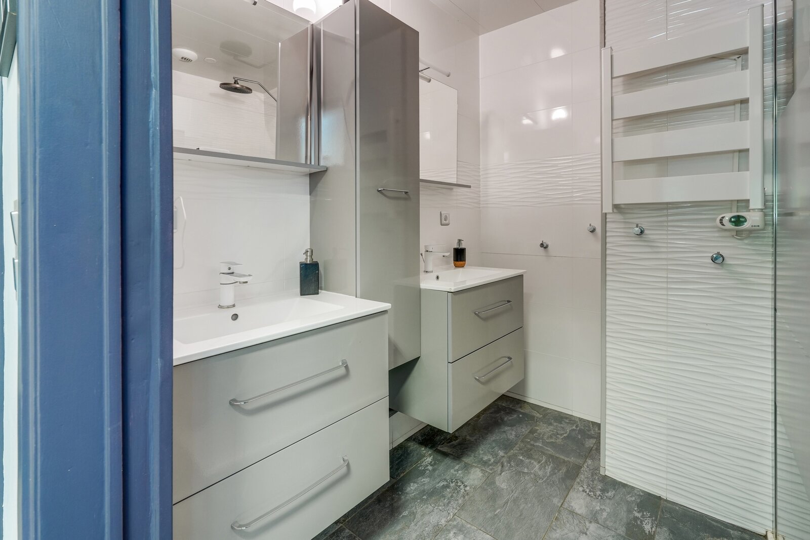 De woning telt vier slaapkamers: drie op het gelijkvloers en één boven, met airco en een dressing van 12 m². De ouderlijke suite (ca. 24 m²) beschikt over een eigen badkamer met hoekbad, inloopdouche, dubbele wastafel, handdoekdroger en apart toilet. Een tweede badkamer ligt onder de suite en biedt een inloopdouche, dubbele wastafel en handdoekdroger.
