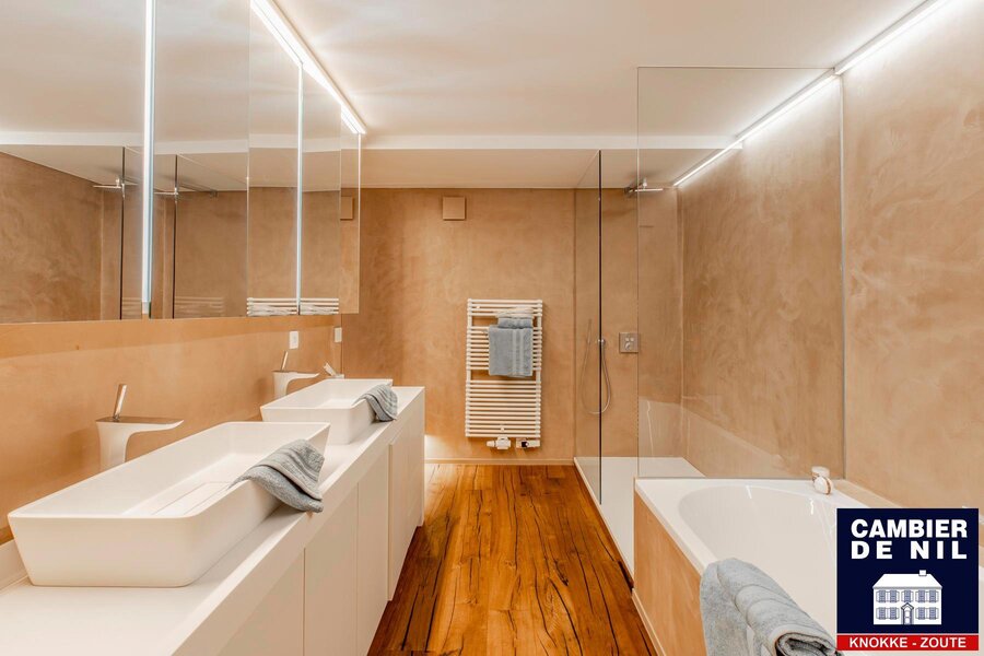 Indeling: inkomhal, vestiaire, toilet, living / salon, eetkamer (10m gevel) en volledig ingerichte open keuken met toestellen van Miele. Ruime bijkeuken/wasplaats. Op dezelfde verdieping : 2 slaapkamers met ingemaakte kasten en één ruime badkamer met douche, toilet en dubbele lavabo. Op de tweede verdieping boven de masterbedroom met zeezicht ensuite badkamer (ligbad, douche, dubbele lavabo en toilet).