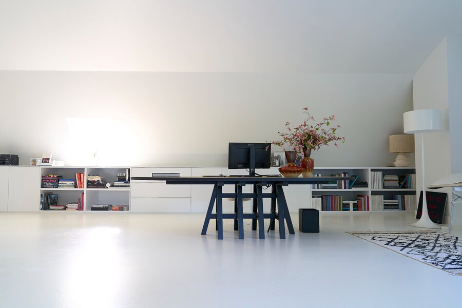 Indeling tweede verdieping, hele ruime werkstudio met technische ruimte, mogelijkheid voor vierde en vijfde slaapkamer en derde badkamer.