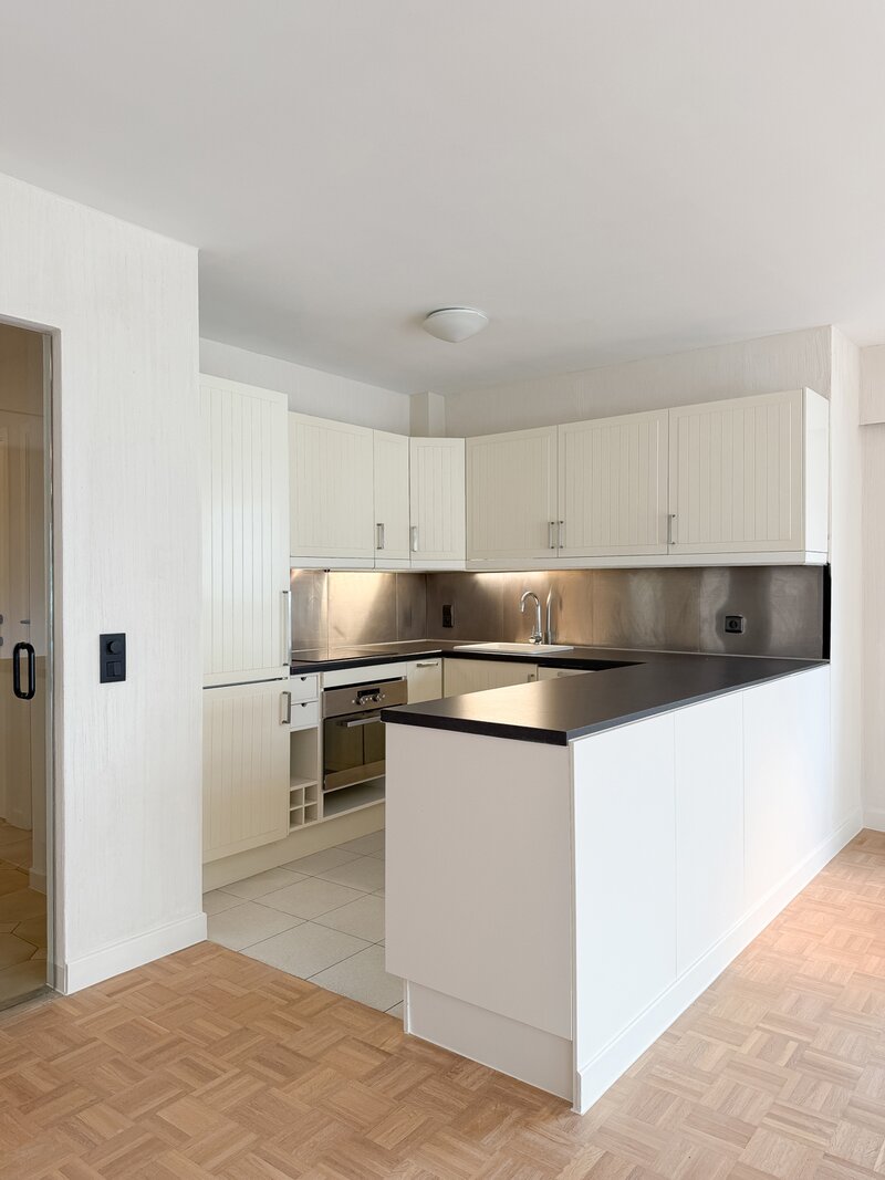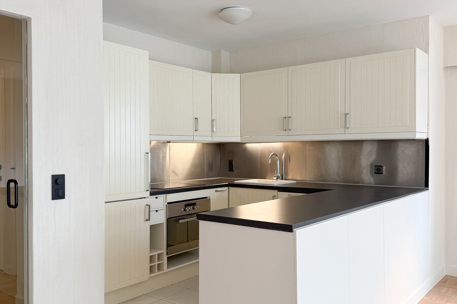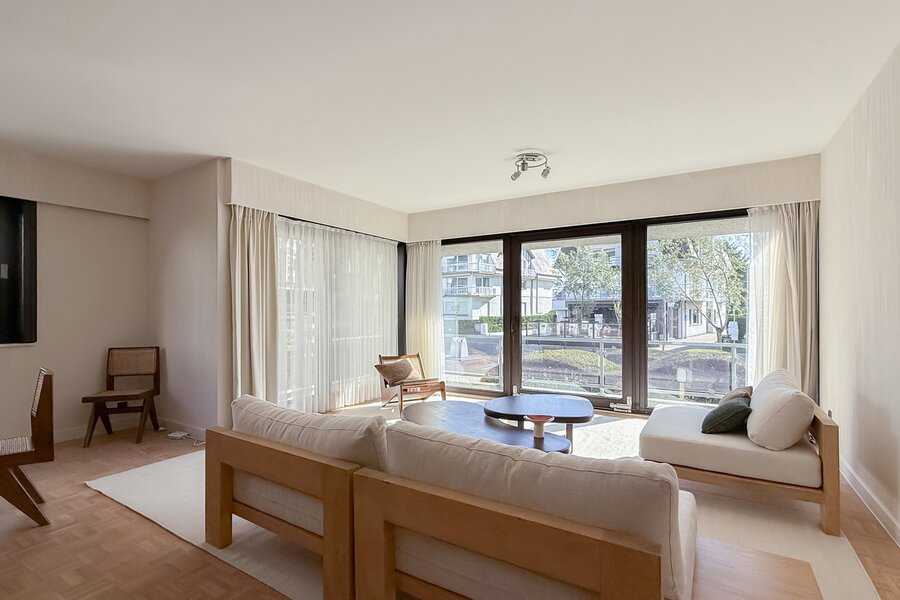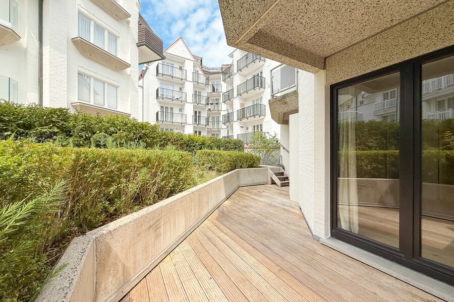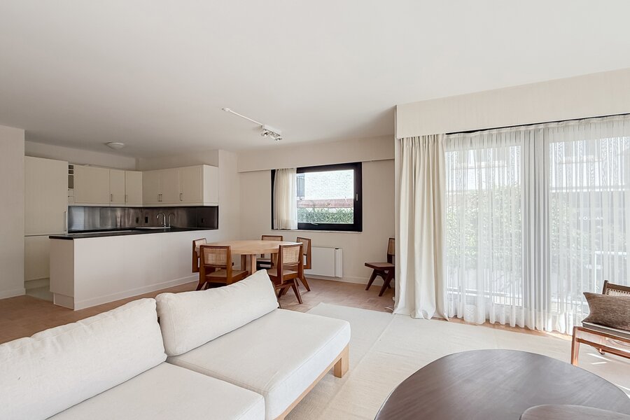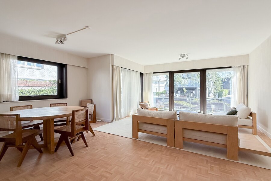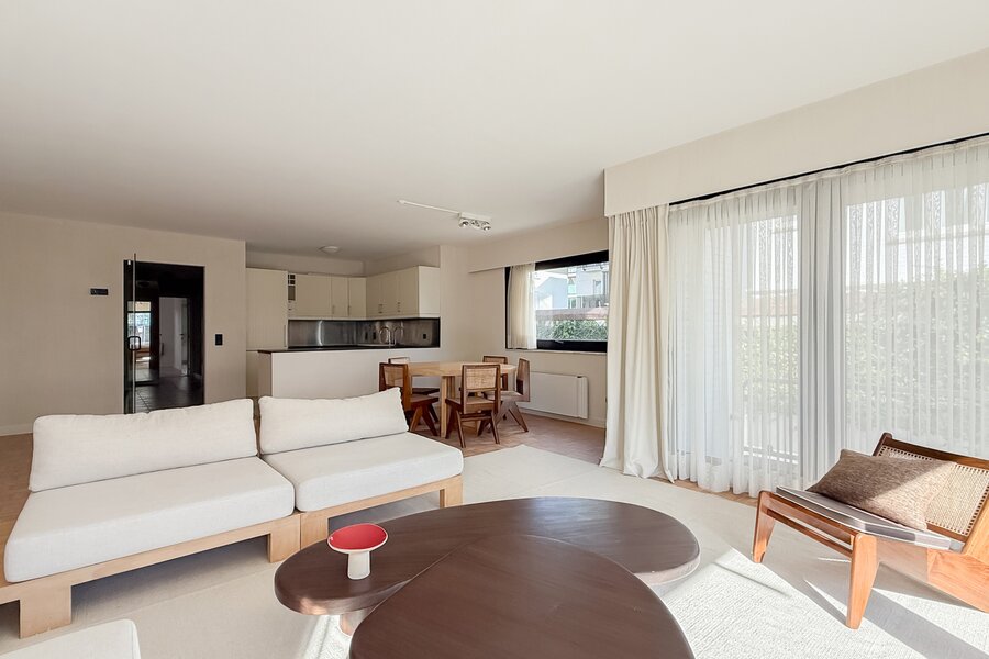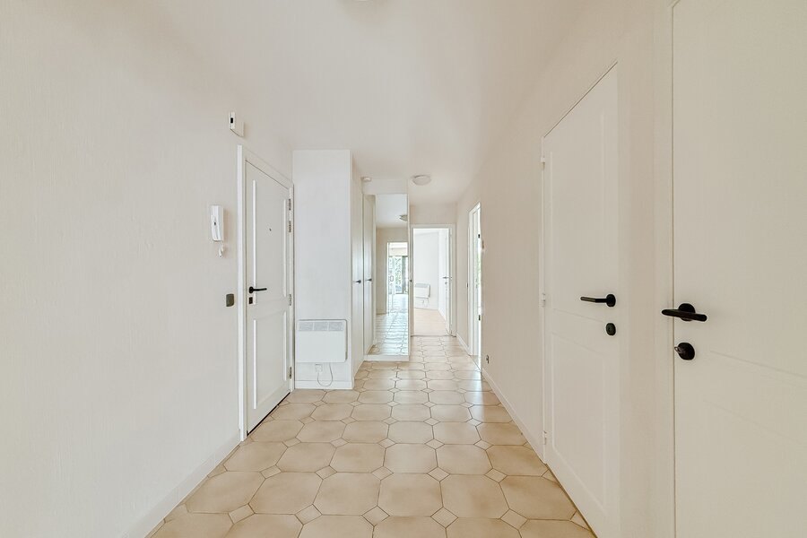 Het appartement beschikt over een ruime inkomhal met vestiaire en gastentoilet, een lichte woonkamer met eetruimte en open keuken. Het terras biedt een prachtig, rustig uitzicht.