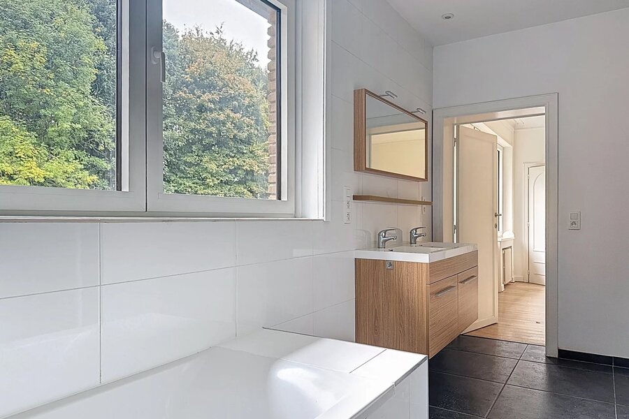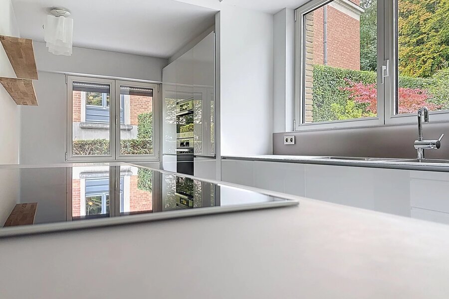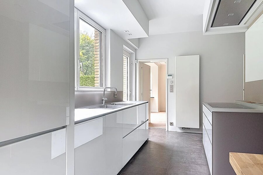 De lichte ontvangstruimtes geven uit op een mooi terras en een zonnige, aangelegde tuin met uitzicht over het park. De recente, volledig uitgeruste keuken met Miele-toestellen en inductiekookplaat combineert hedendaags comfort met een harmonieuze integratie in de stijl van het huis.