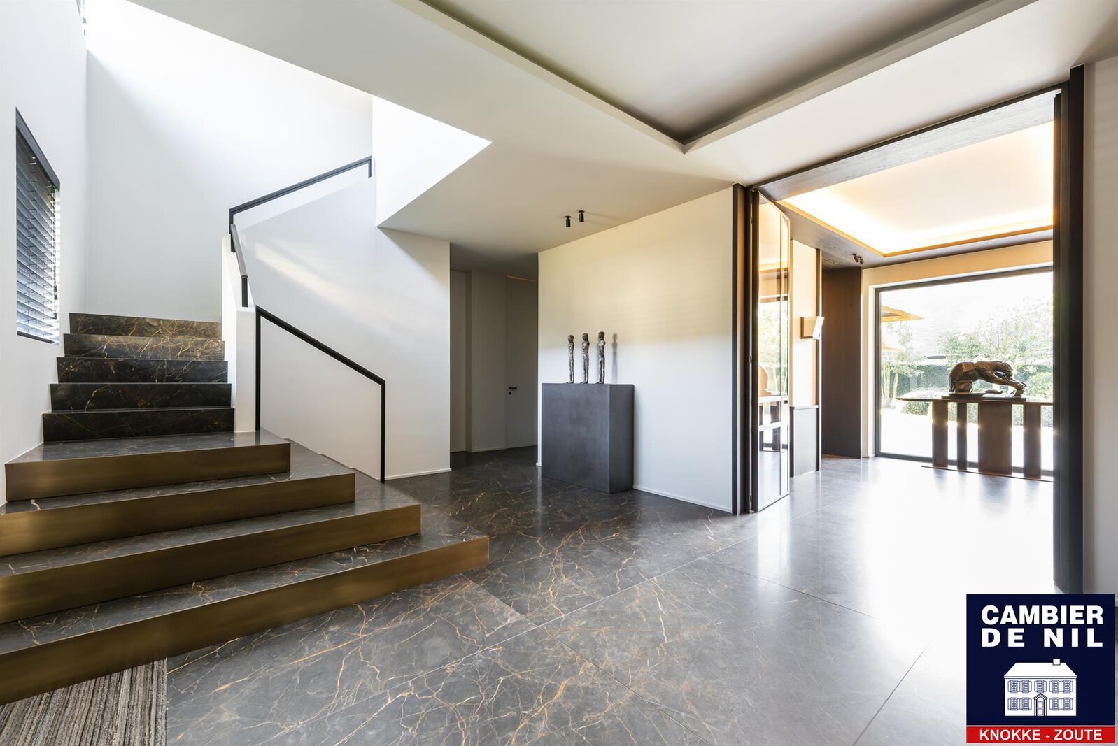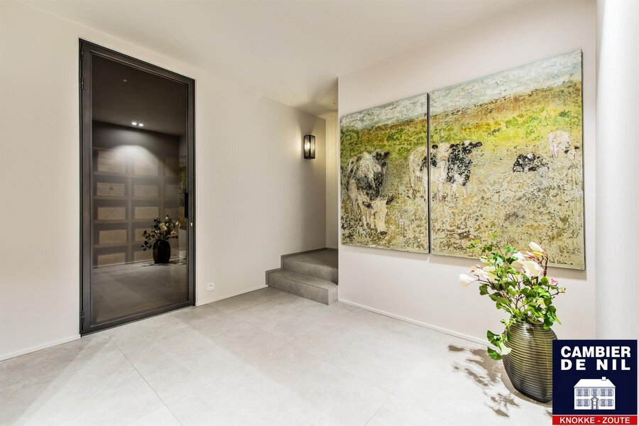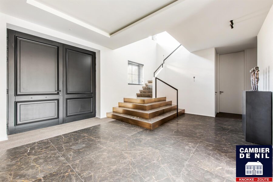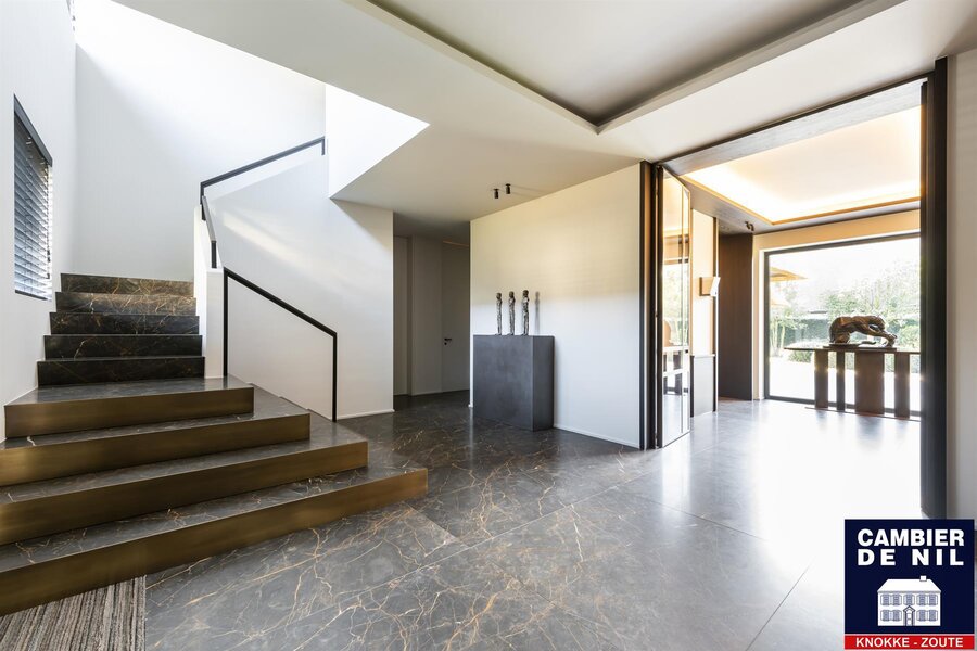 De villa verwelkomt u via een indrukwekkende inkomhal met vestiaire, gastentoilet en een personenlift die alle niveaus (-1 tot +1) met elkaar verbindt.