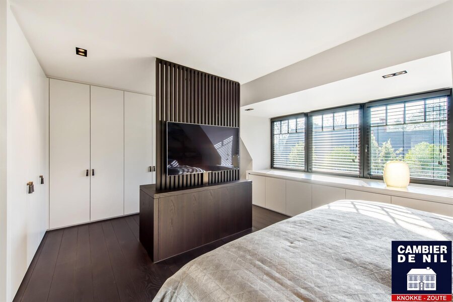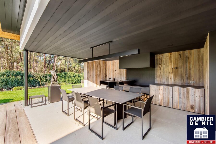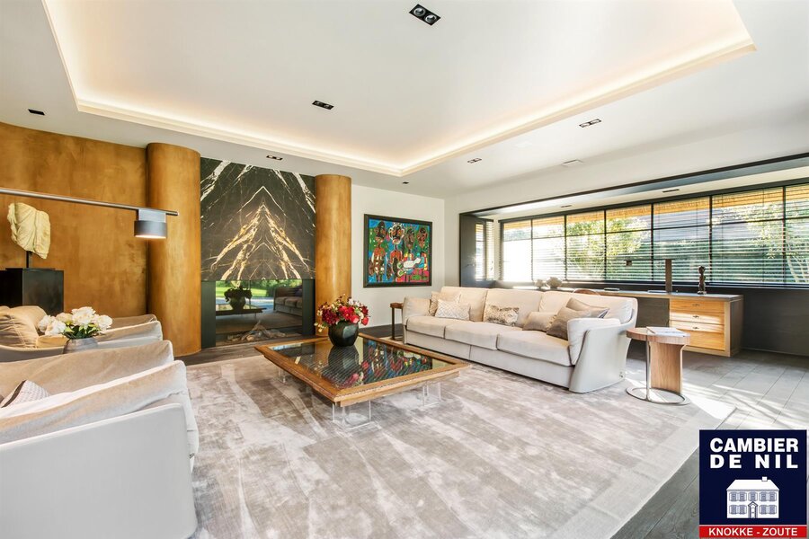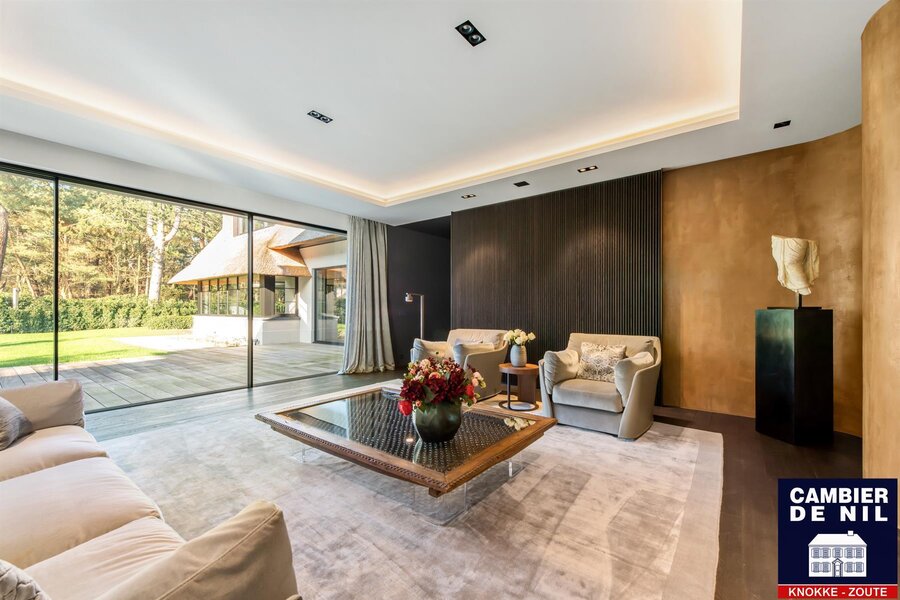 De leefruimtes baden in het licht en bestaan uit een stijlvolle woonkamer met gashaard en een aangrenzende, gezellige tv-hoek. De luxueuze leefkeuken is volledig uitgerust met hoogwaardige toestellen en sluit naadloos aan op de eetruimte. Vanuit de leefruimtes heeft men toegang tot de fraai aangelegde tuin met volledige privacy, een royaal zonneterras en een bijzonder aangenaam overdekt terras met open haard.