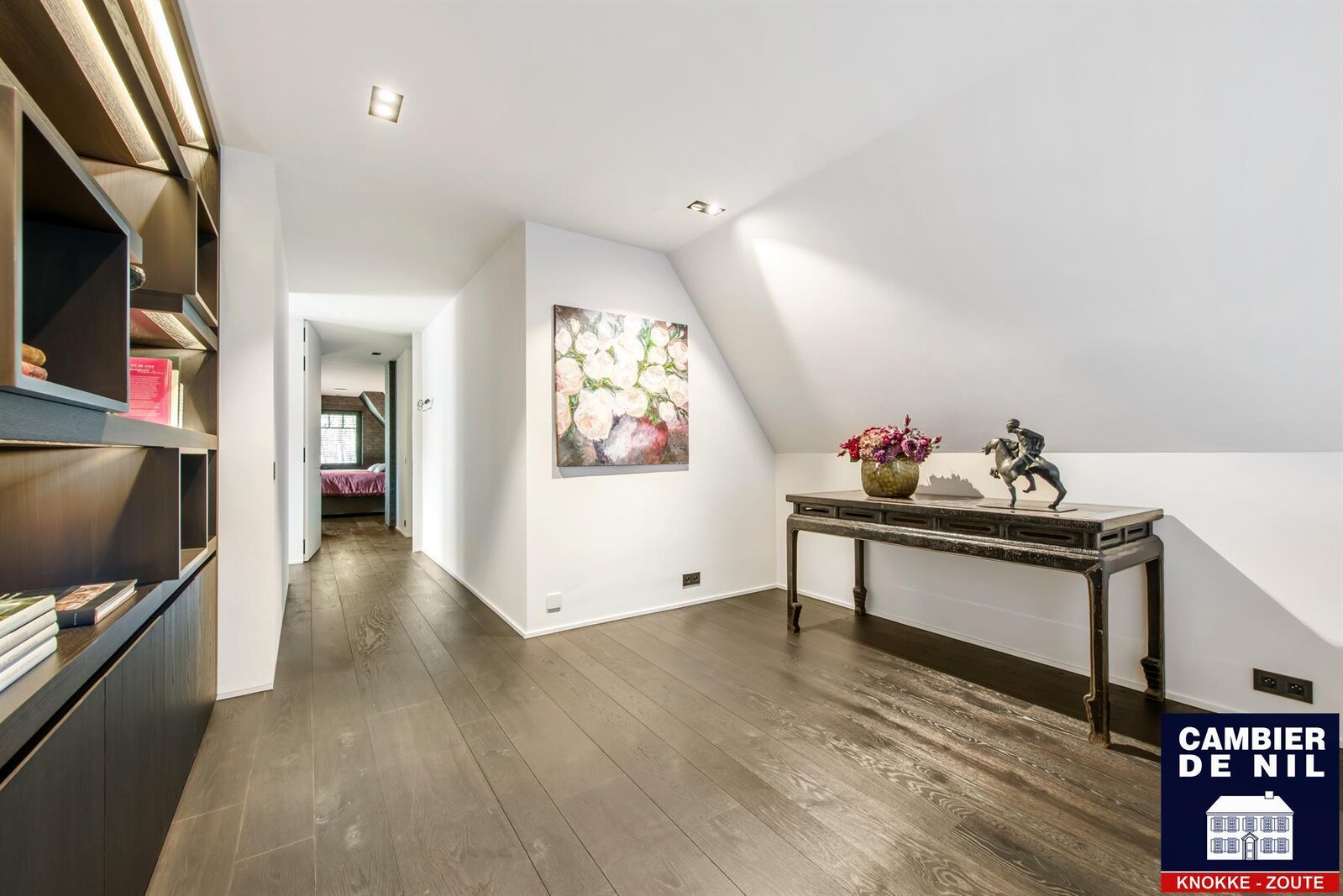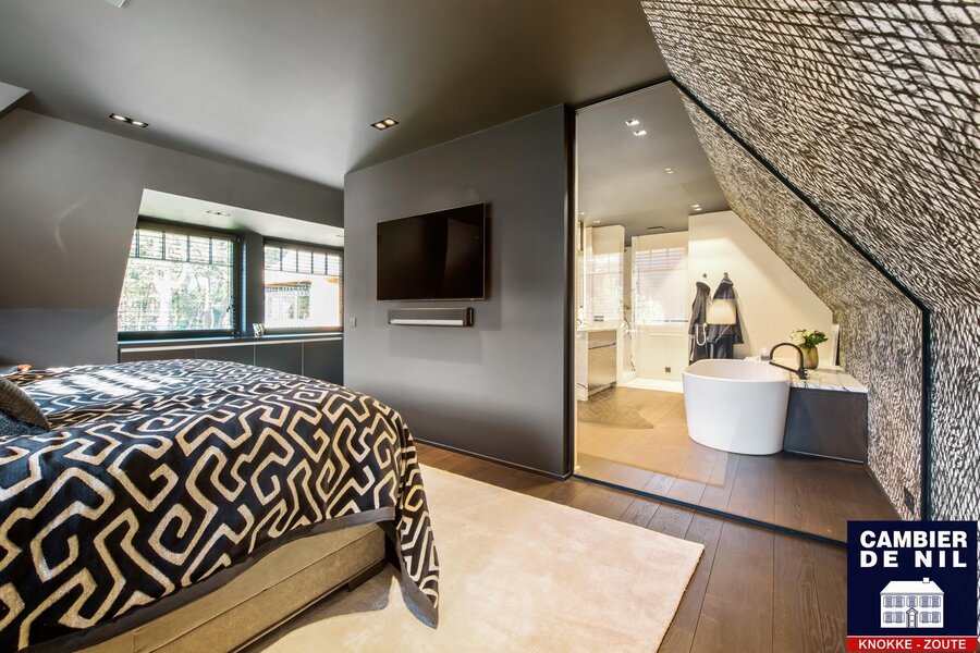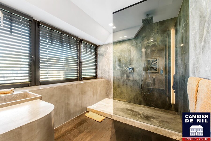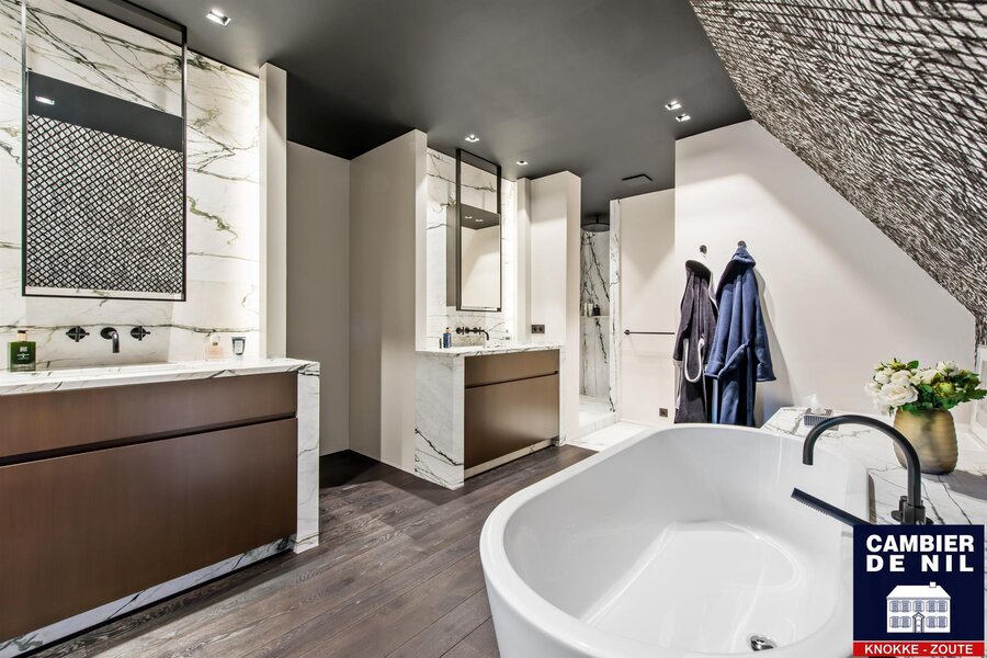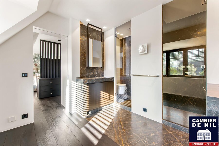 Op de eerste verdieping bevindt zich de master suite met dressing en een luxueuze ensuite badkamer uitgerust met vrijstaand bad, dubbele lavabo, douche en toilet. Daarnaast is er een tweede ruime slaapkamer met dressing en eigen badkamer (douche, dubbele lavabo en toilet). De derde en vierde slaapkamer beschikken over ingemaakte kasten en elk een privatieve sanitaire ruimte met douche, lavabo en toilet.