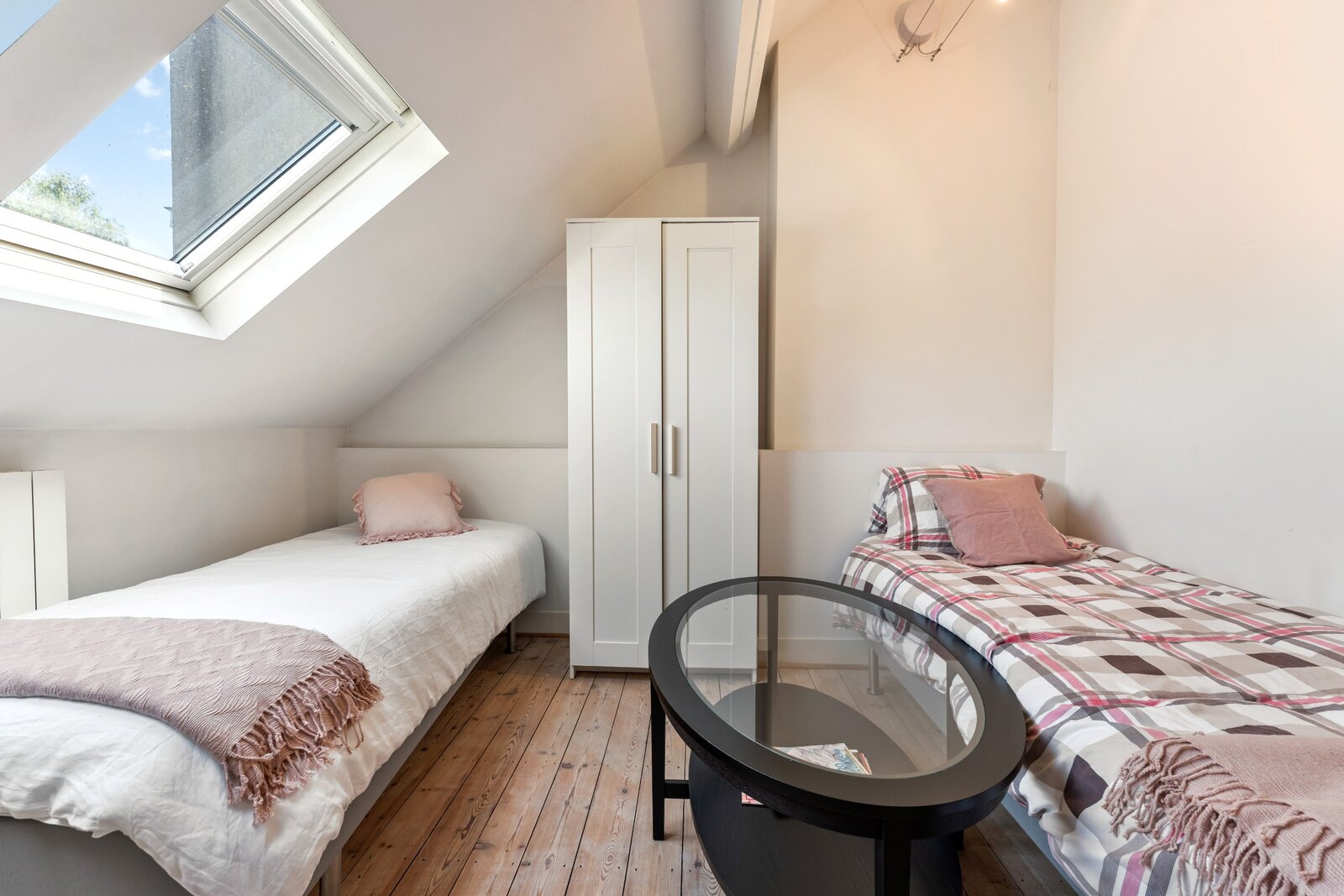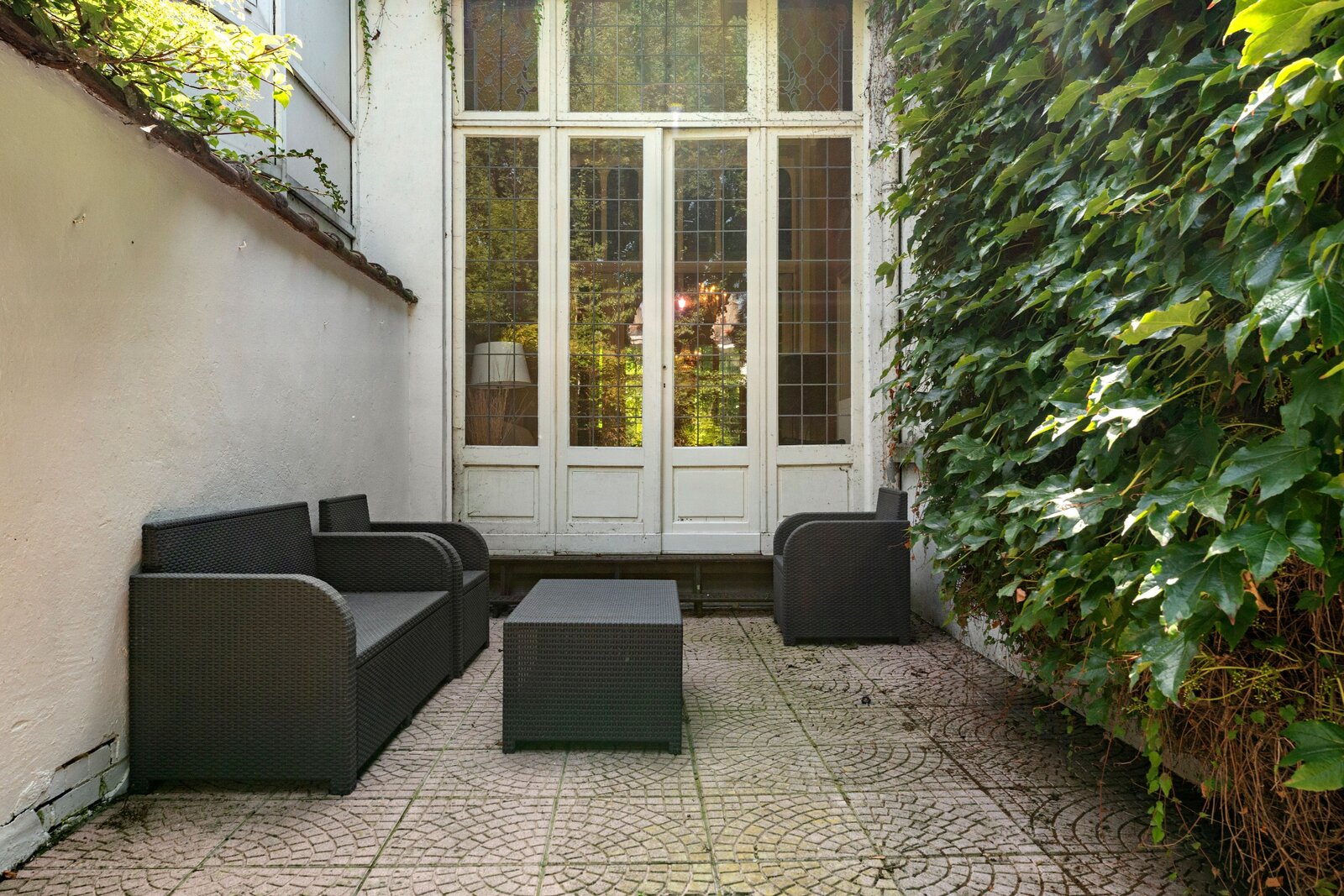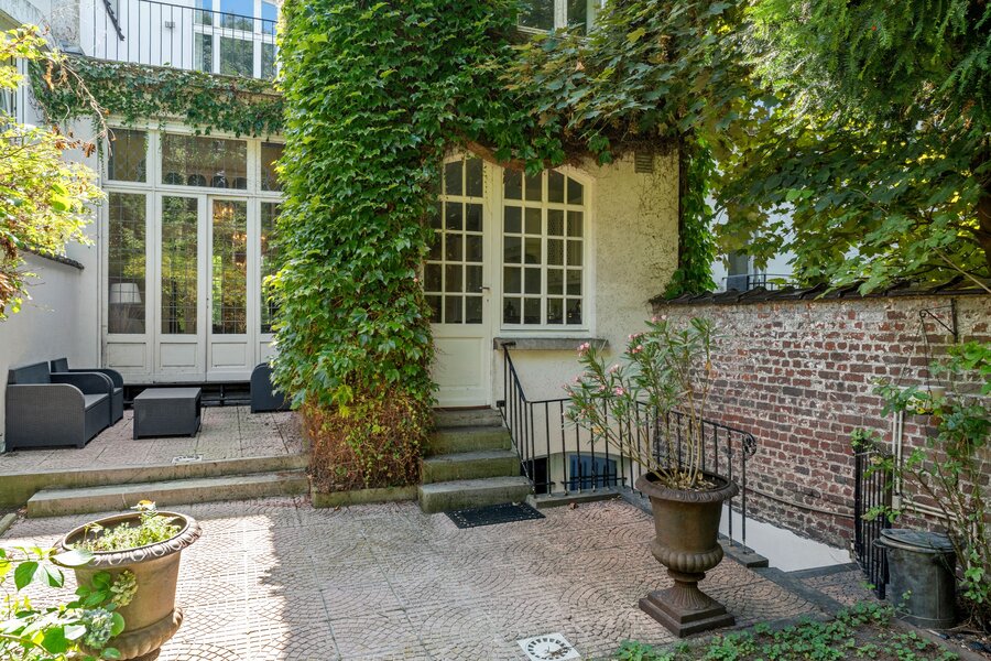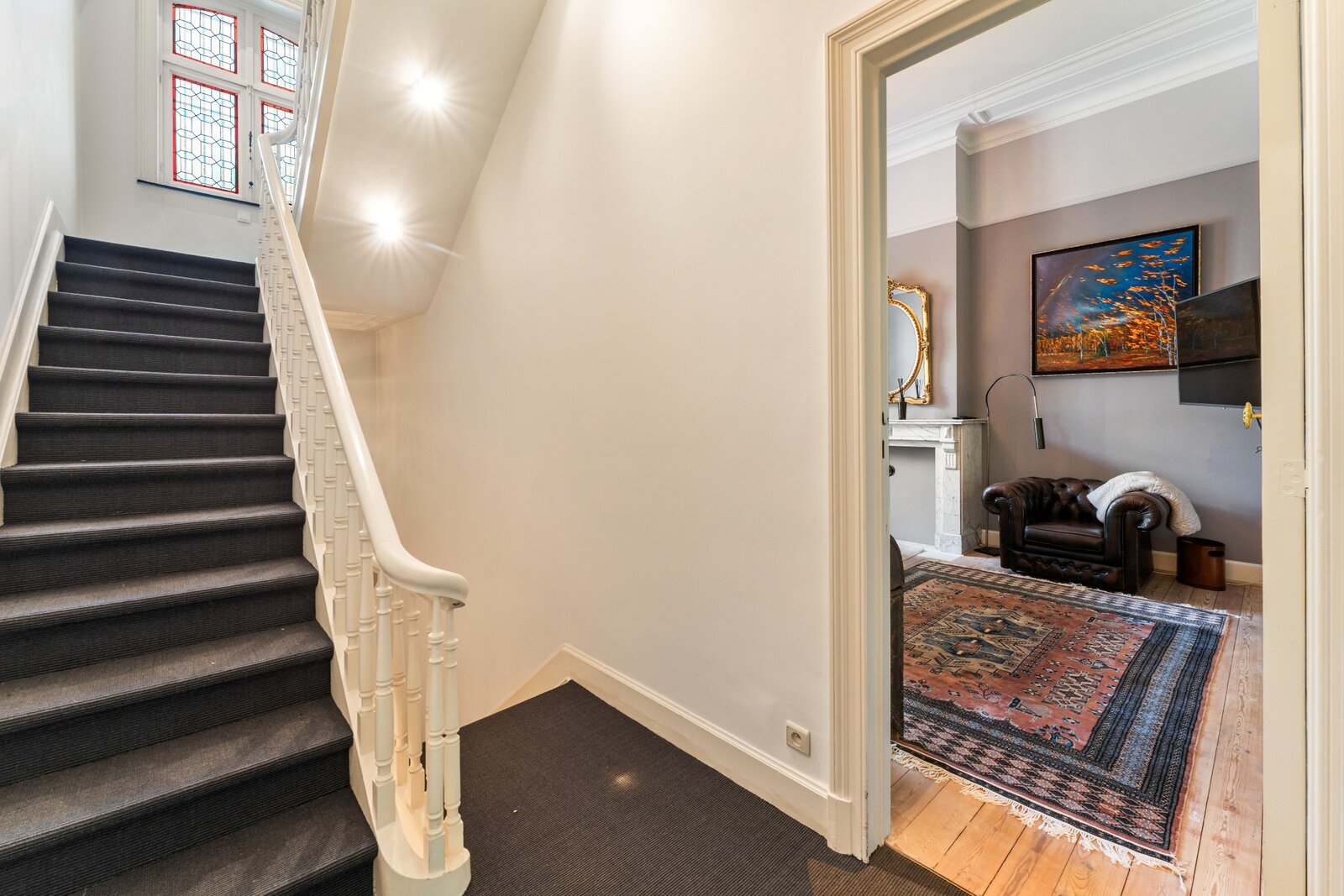 Aan de Landsroemlaan 47, recht tegenover het park van Ganshoren, staat dit unieke herenhuis vol charme en authenticiteit. De hoge plafonds, grote ramen en authentieke elementen zoals marmeren schouwen, moulures en parketvloeren zorgen voor een elegante en warme uitstraling. Meerdere salons combineren stijl met gezelligheid, terwijl een praktische bureauruimte ideaal is voor thuiswerk. De volledig ingerichte keuken en twee marmeren badkamers bieden hedendaags comfort in een klassiek kader.