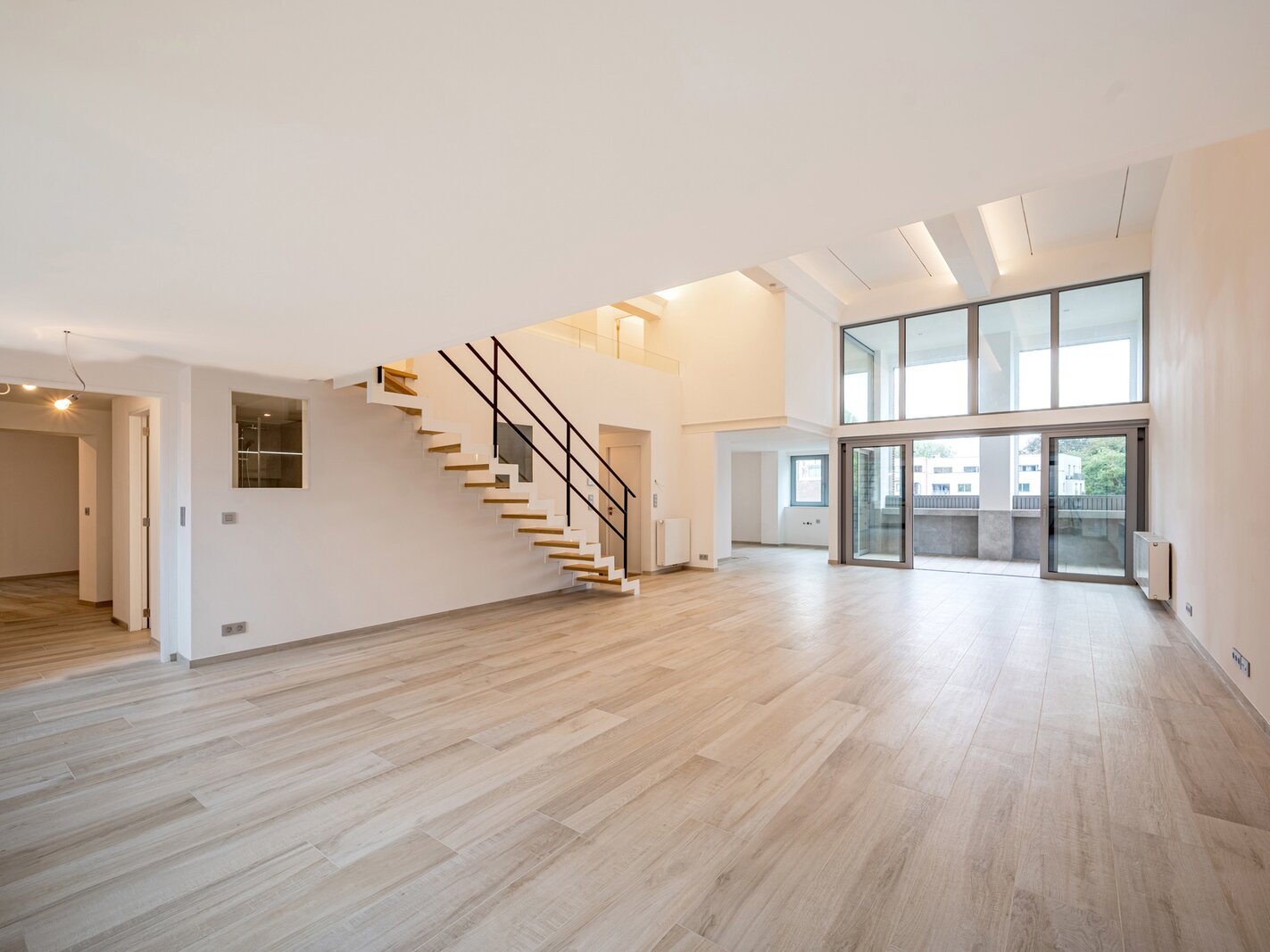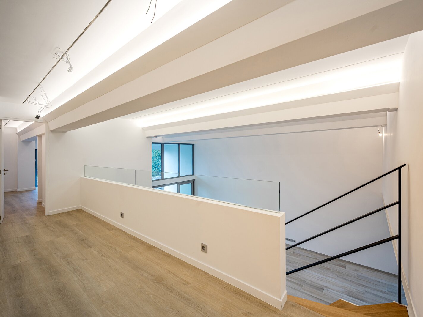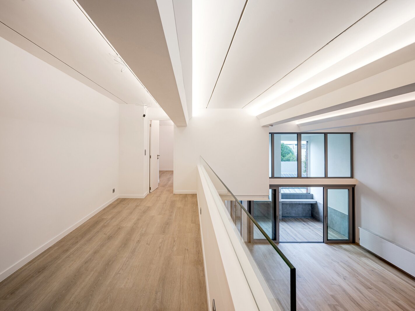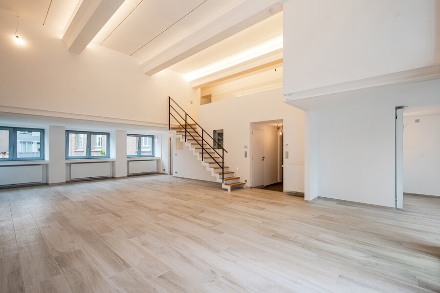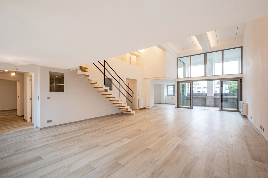 Lot 7 bestaat uit een inkomhal met gastentoilet, vestiaire en technische ruimte, een ruime en lichtrijke open woonkamer van ± 80 m² (gedeeltelijke plafondhoogte van ± 5,5 m), een ruimtekeuken (in te richten), allen uitgevend op een mooi terras van ± 13 m², op het westen, op een eiland, en een en-suite hoofdslaapkamer met kleedkamer en complete badkamer. De privétrap brengt ons naar de bovenverdieping, op een mezzanine-kantooroverloop met 3 slaapkamers met eigen badkamer, elk met een eigen doucheruimte, toilet en wasruimte.