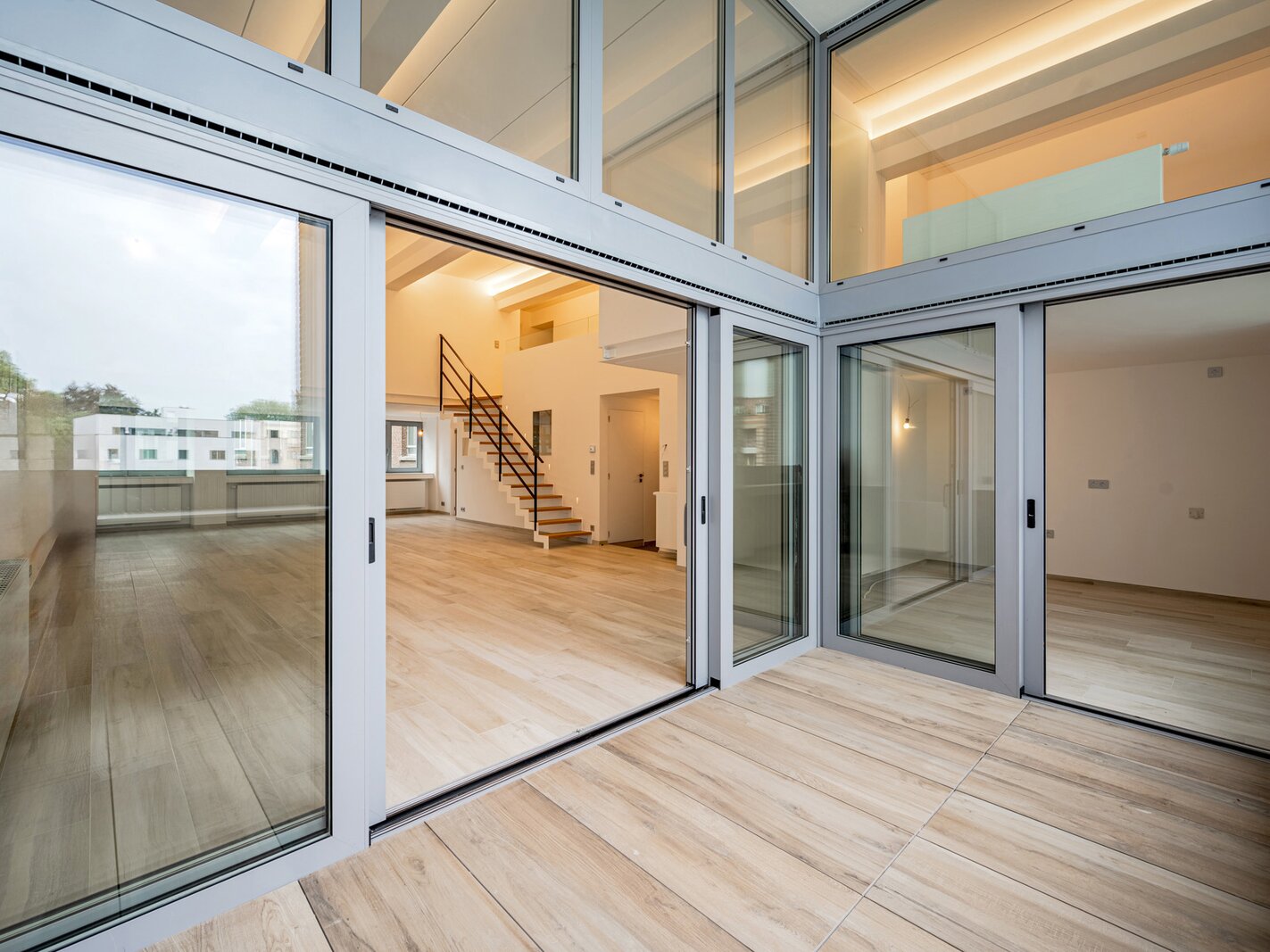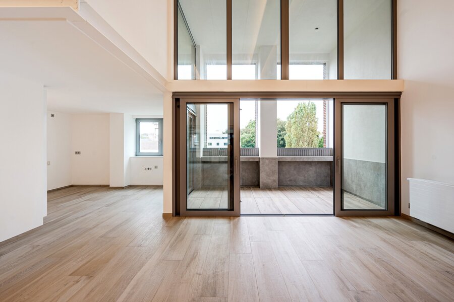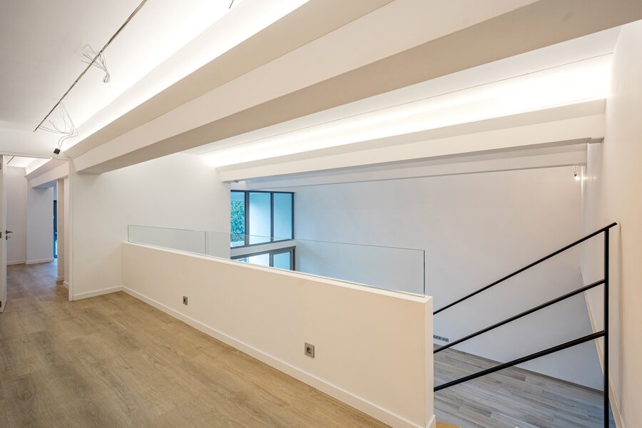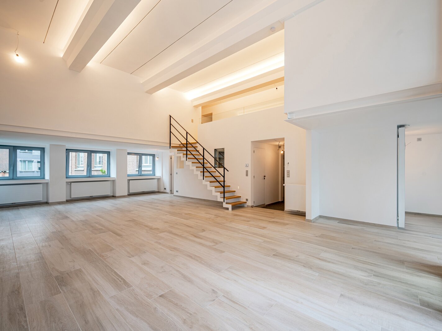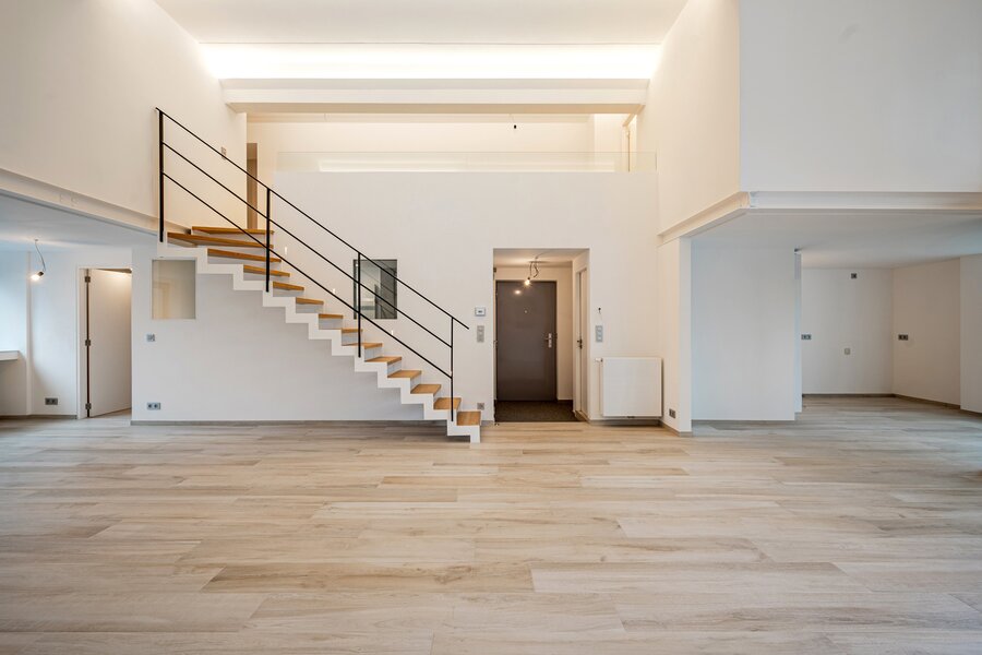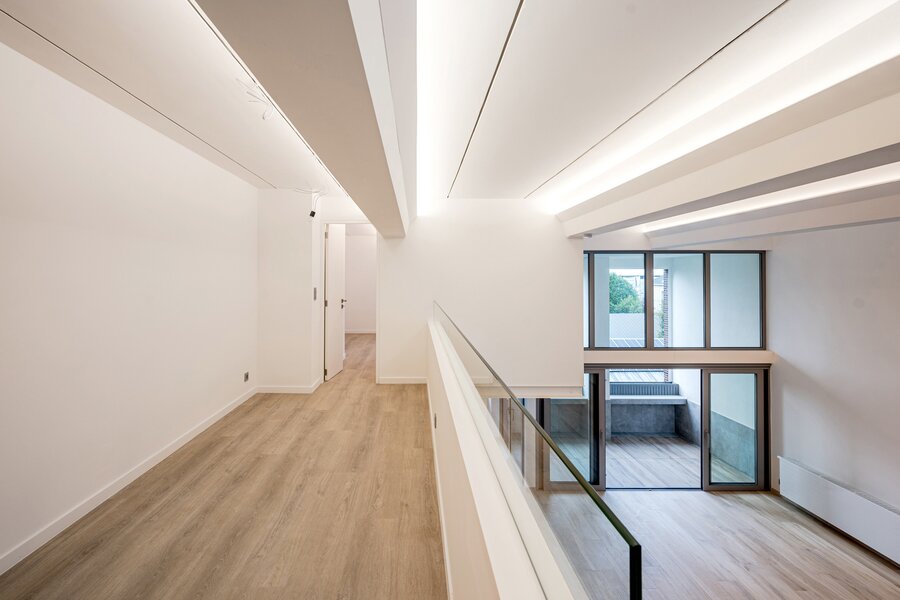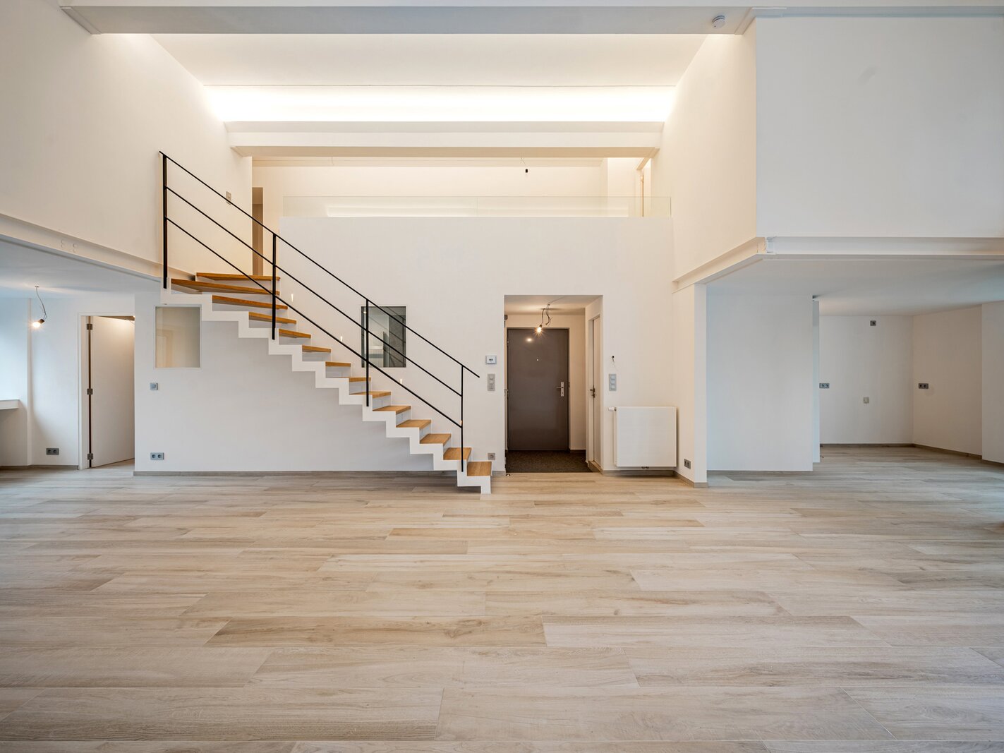 Lot 7 bestaat uit een inkomhal met gastentoilet, vestiaire en technische ruimte, een ruime en lichtrijke open woonkamer van ± 80 m² (gedeeltelijke plafondhoogte van ± 5,5 m), een ruimtekeuken (in te richten), allen uitgevend op een mooi terras van ± 13 m², op het westen, op een eiland, en een en-suite hoofdslaapkamer met kleedkamer en complete badkamer. De privétrap brengt ons naar de bovenverdieping, op een mezzanine-kantooroverloop met 3 slaapkamers met eigen badkamer, elk met een eigen doucheruimte, toilet en wasruimte.